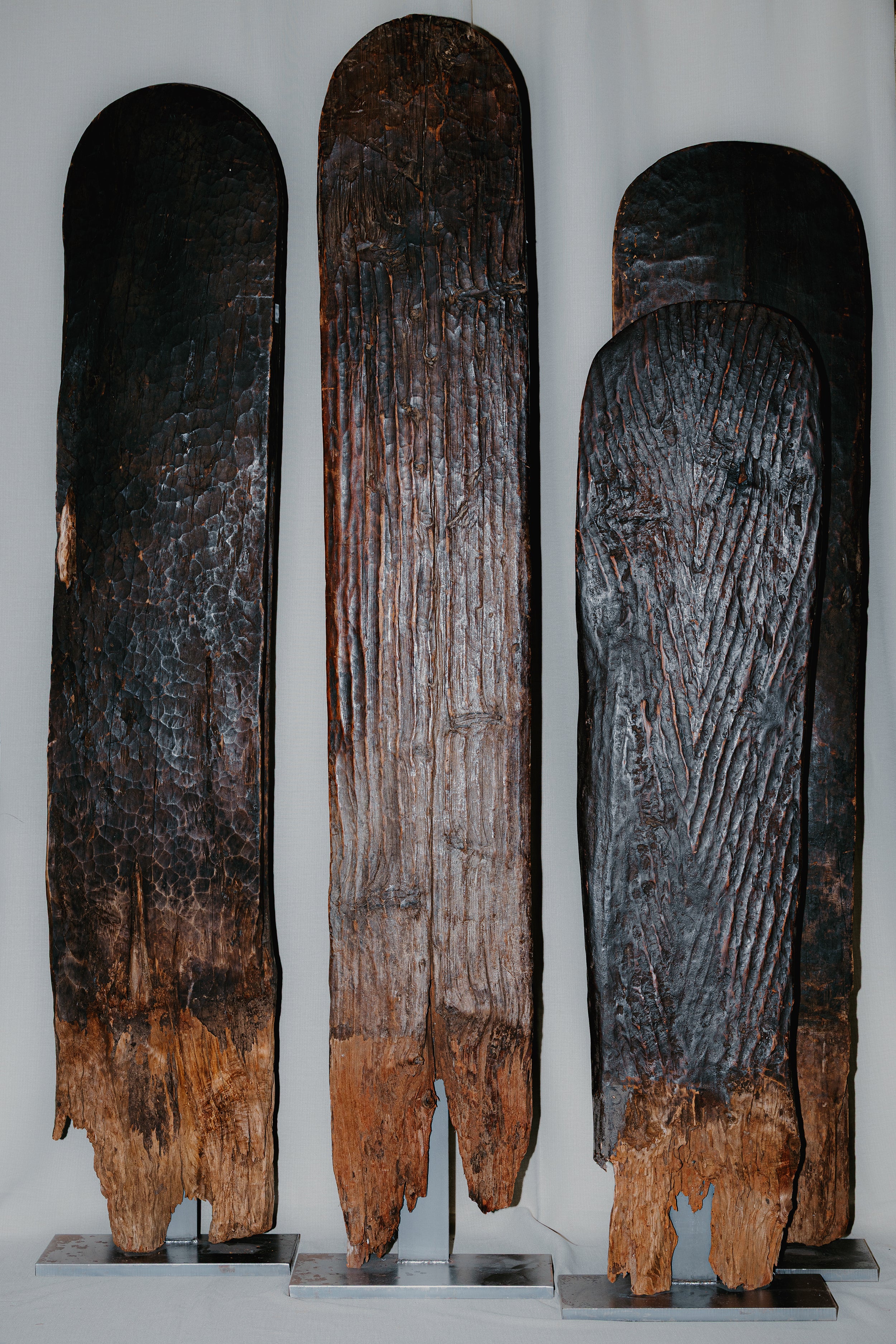 Chaque sculpture est marquée par le temps, les usages et les irrégularités du bois, faisant de ce poteau animal une pièce unique, chargée d’histoire et de présence.
