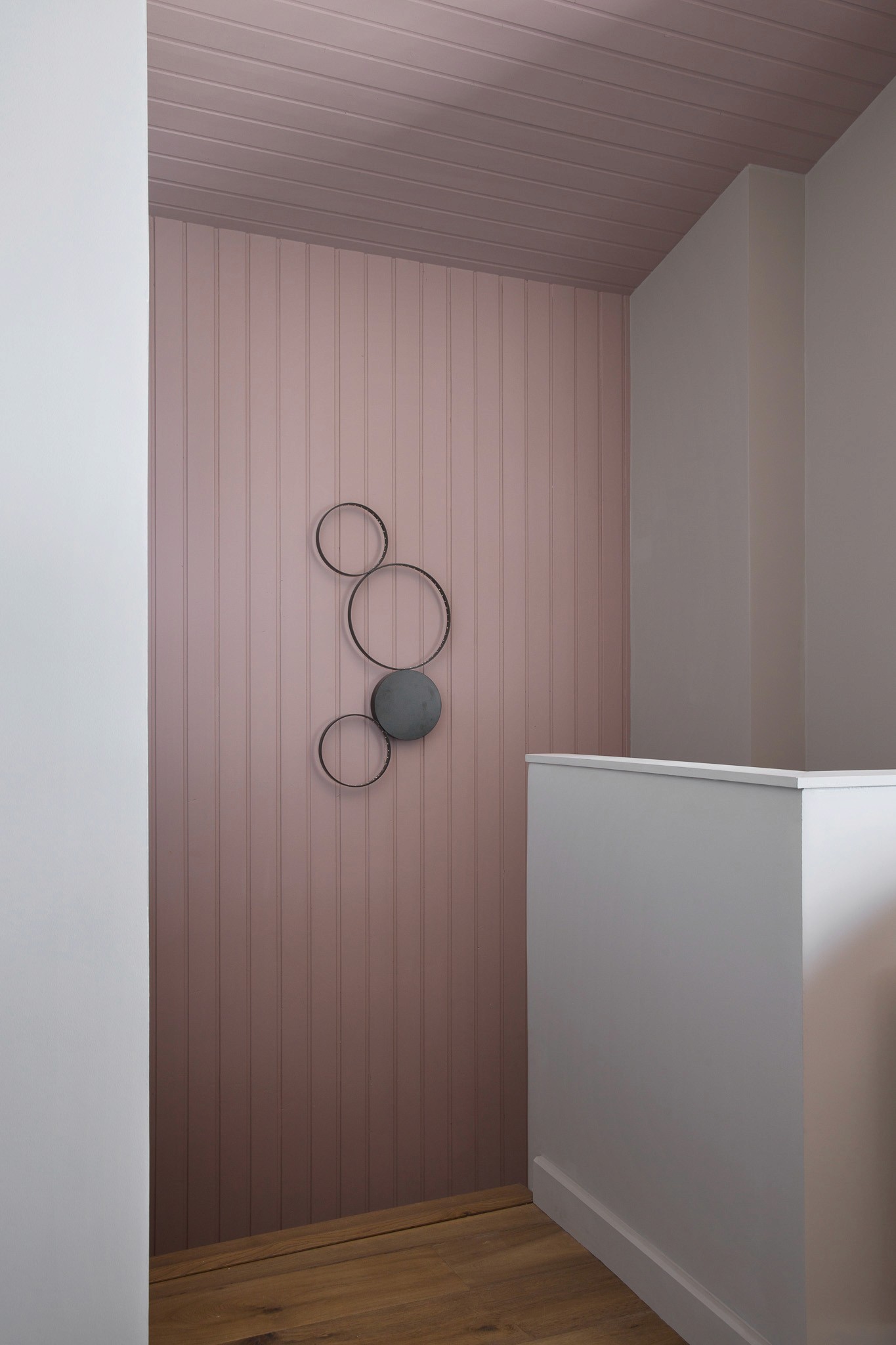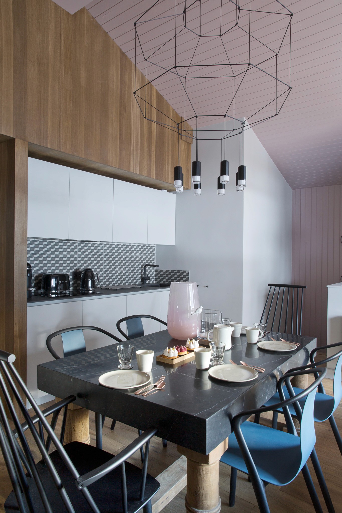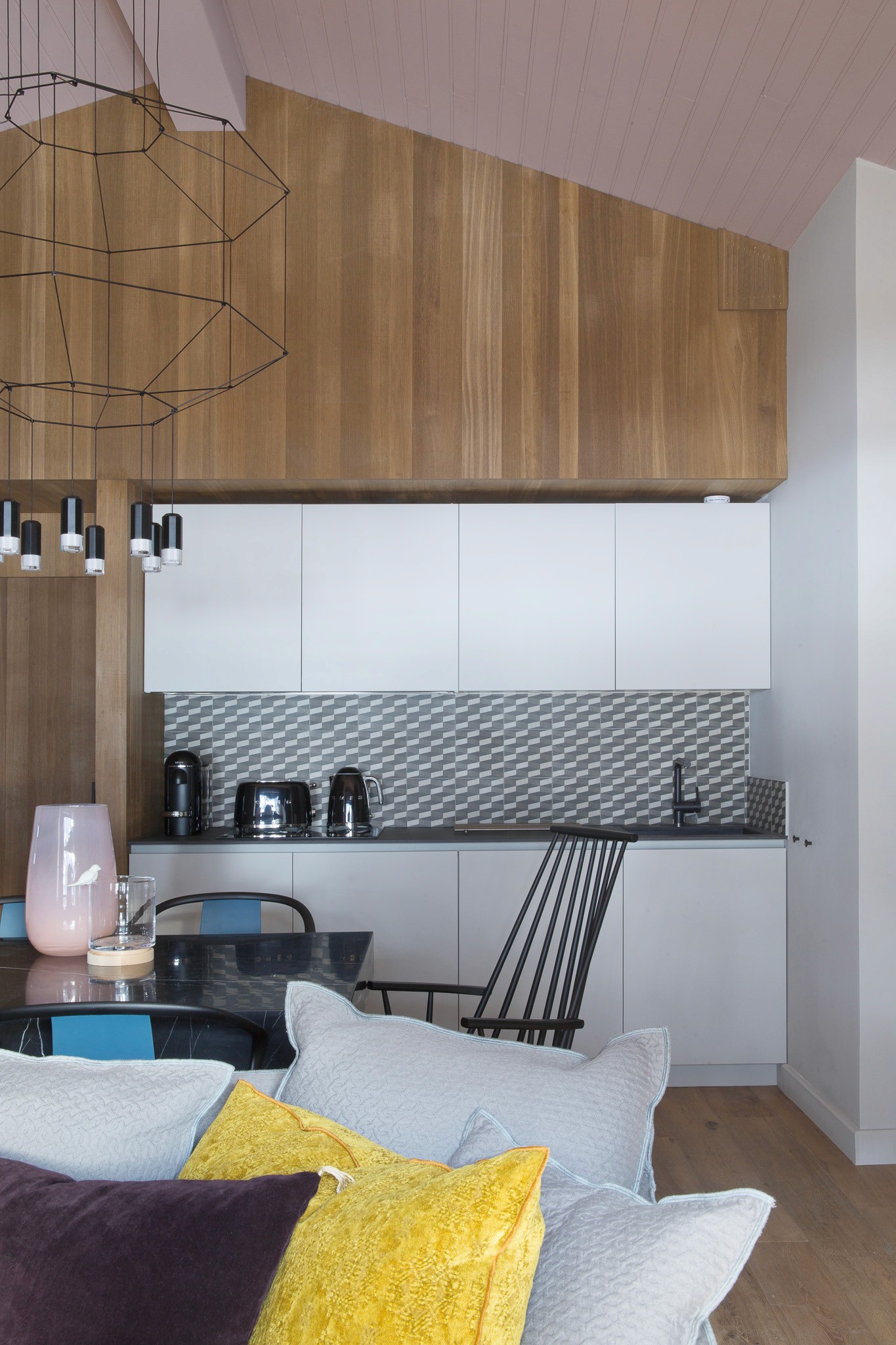 Entièrement rénové pour de la location haut de gamme, cet appartement situé au coeur de Chamonix optimise chaque mètre carré avec style et intelligence. Pour maîtriser les coûts tout en créant un fort impact visuel, tous les lambris ont été repeints et le plafond ose un rose profond et audacieux, qui donne du caractère à la pièce principale.