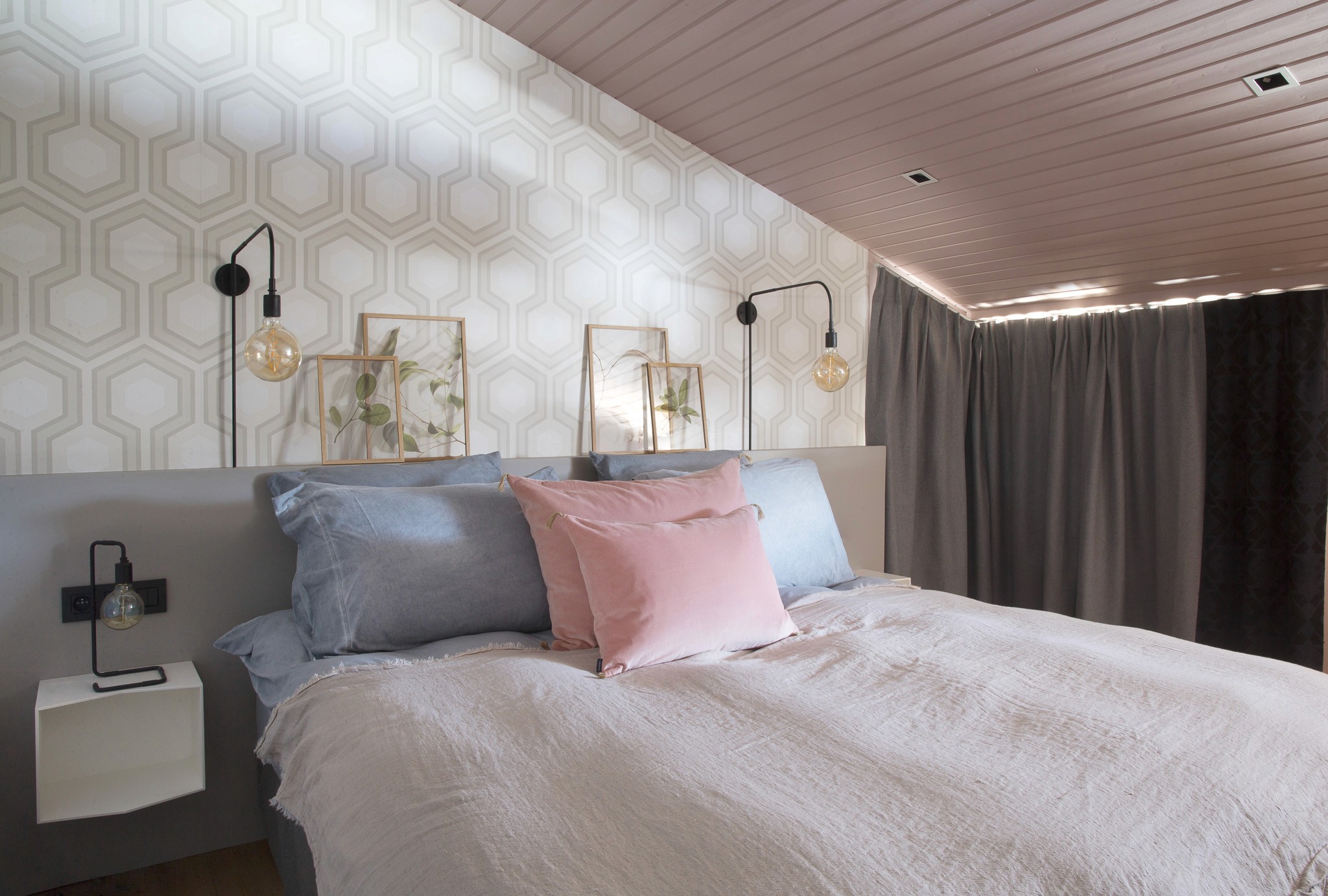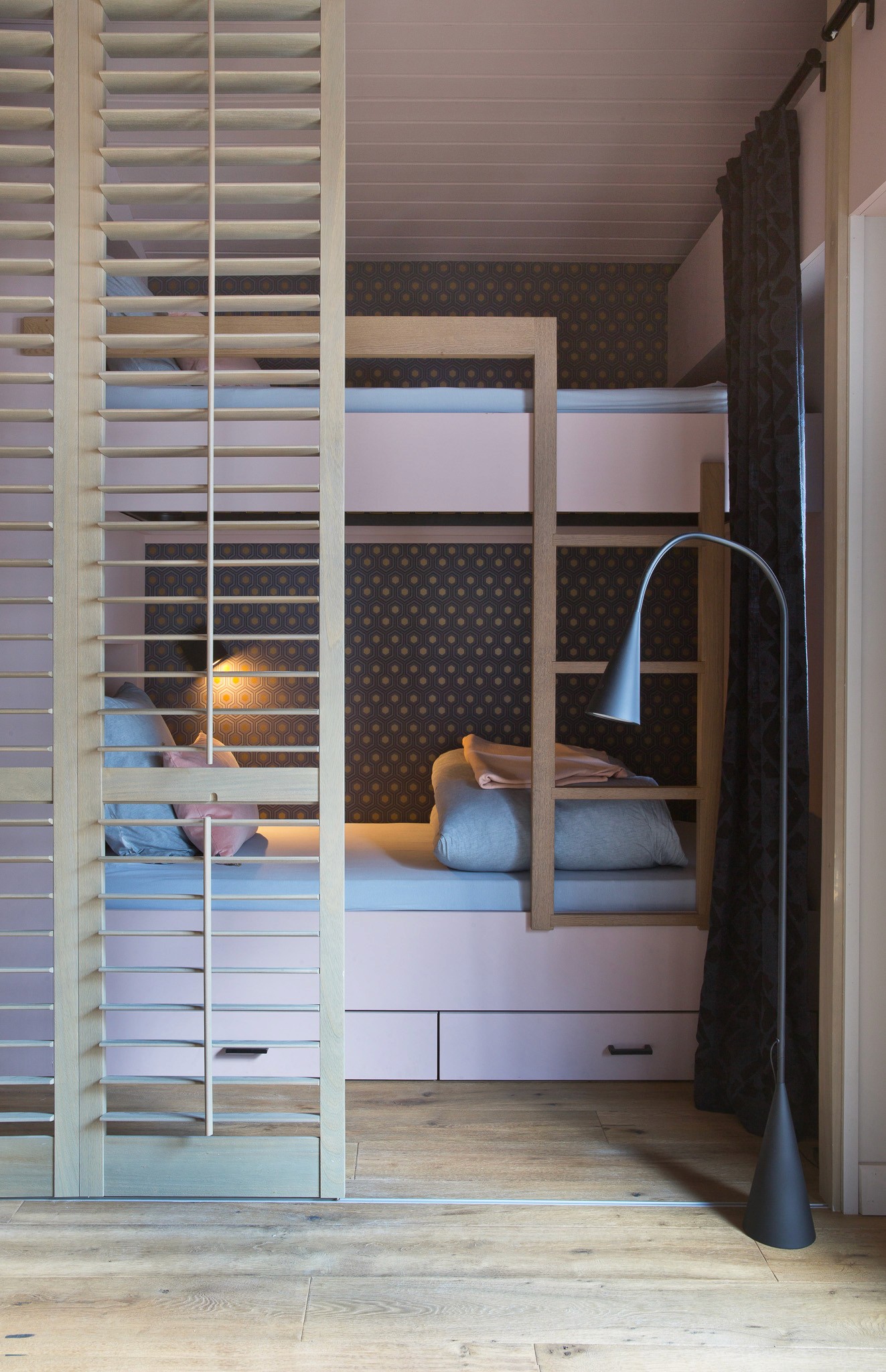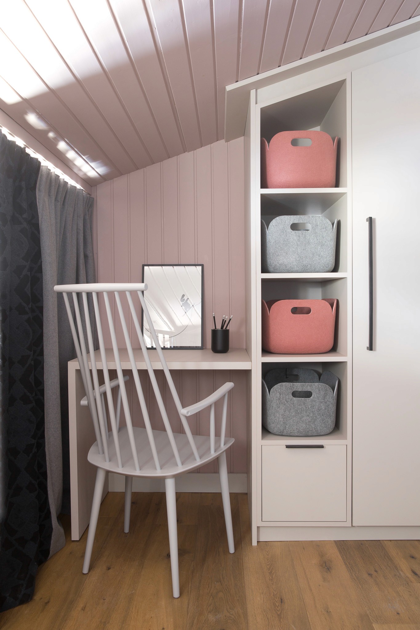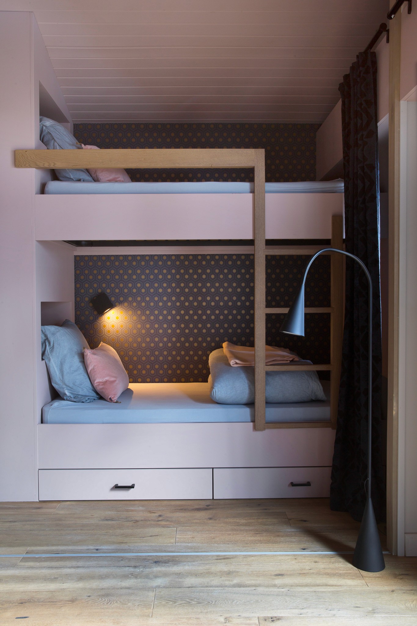 Entièrement rénové pour de la location haut de gamme, cet appartement situé au coeur de Chamonix optimise chaque mètre carré avec style et intelligence. Pour maîtriser les coûts tout en créant un fort impact visuel, tous les lambris ont été repeints et le plafond ose un rose profond et audacieux, qui donne du caractère à la pièce principale.