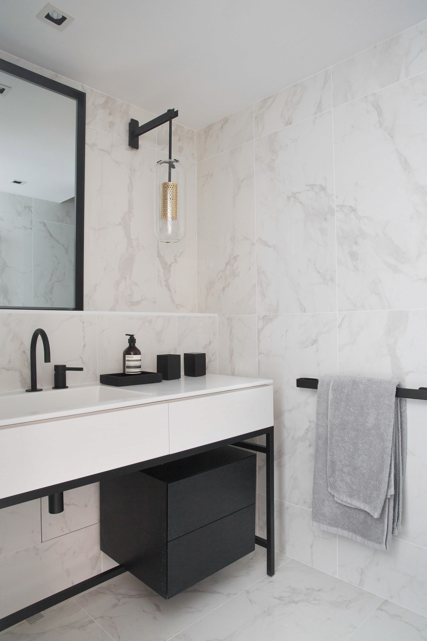 Un coin montagne se dissimule derrière des portes Jasno, tandis que la salle de bain, cachée derrière la cuisine, et la petite chambre discrètement intégrée, laissent toute la place à la grande pièce de vie. Haute sous plafond, elle donne une sensation d'espace inattendue pour ce petit appartement où tout a été pensé sur mesure
