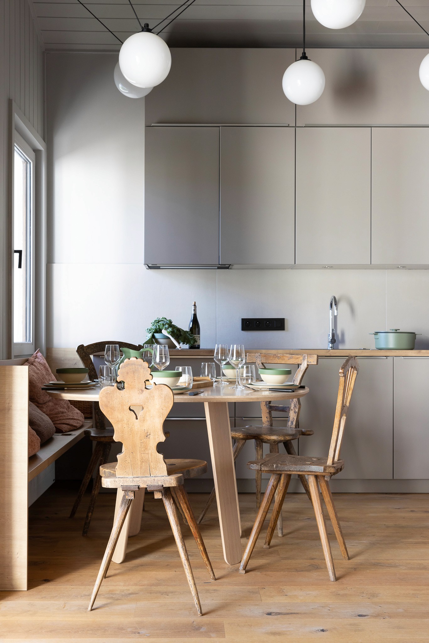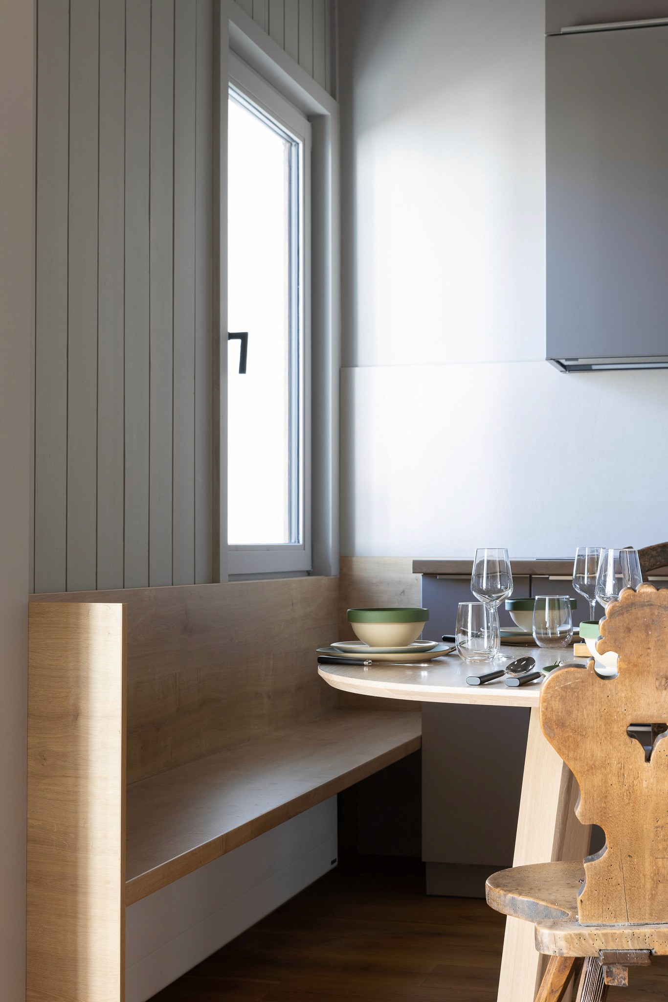 Seule la cuisine, en tons sur tons et développée sur une grande hauteur, vient créer une rupture visuelle forte, affirmant son identité dans un langage plus sobre et graphique.