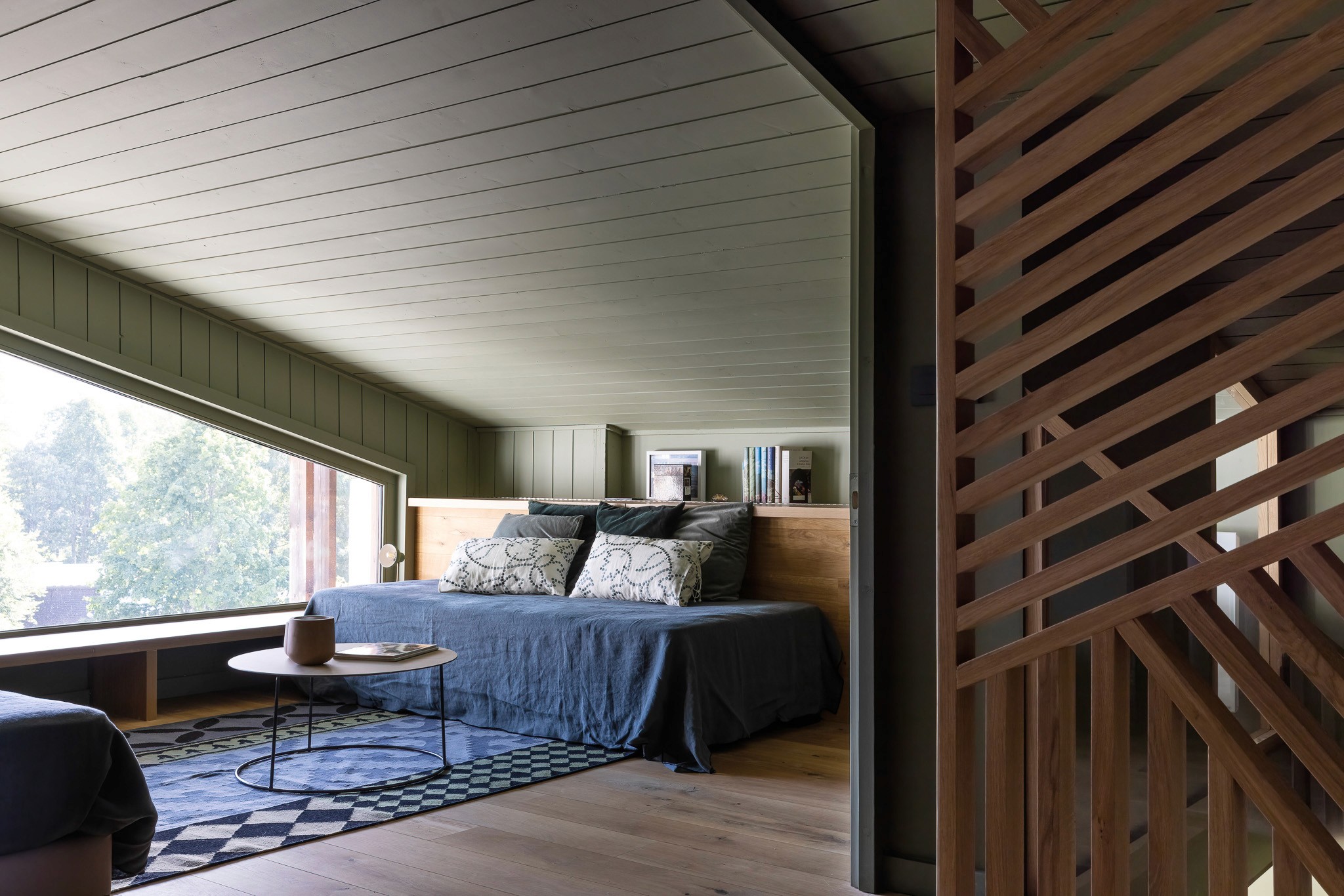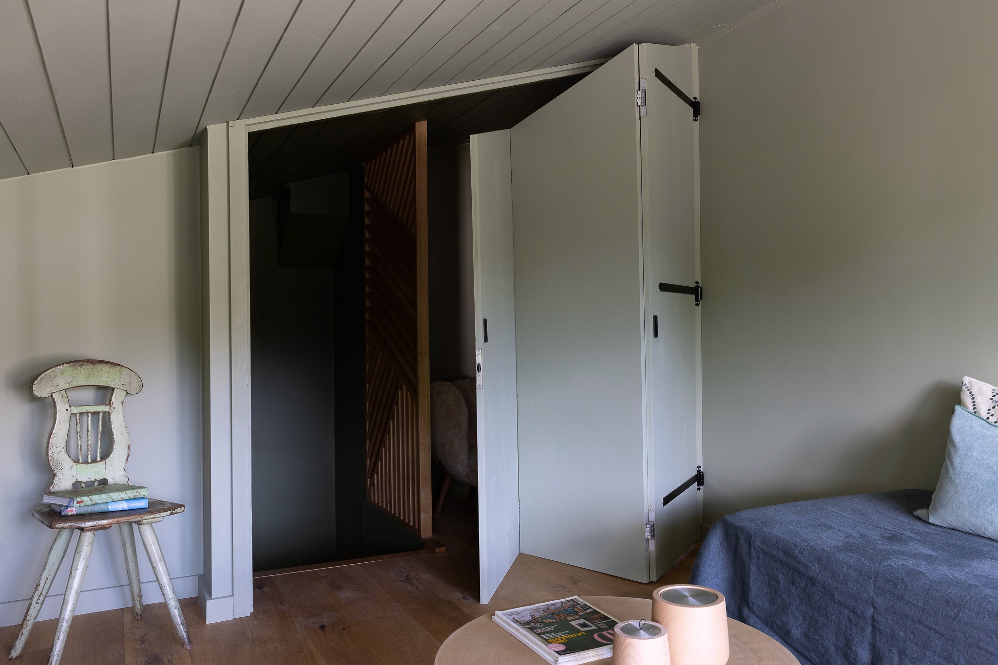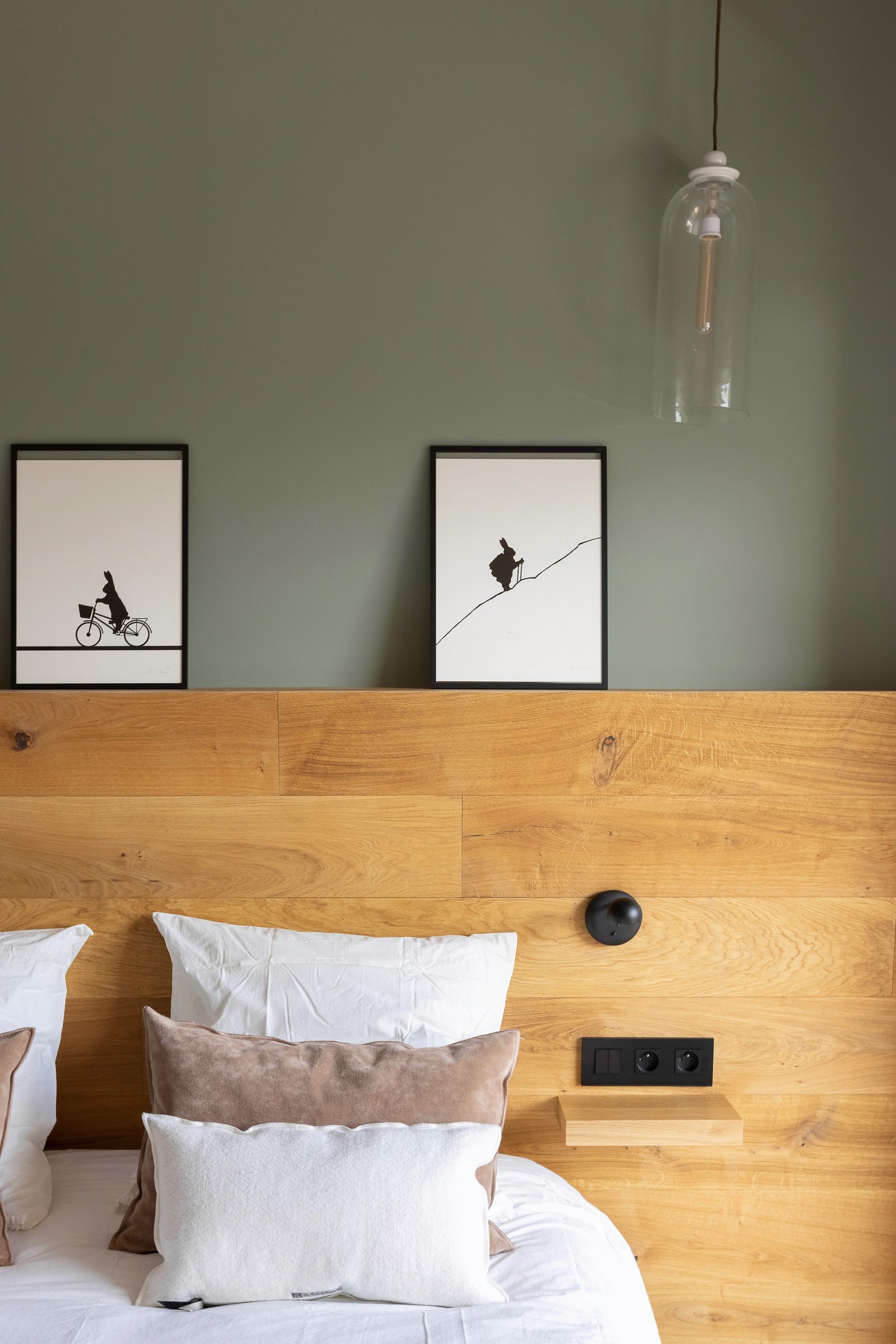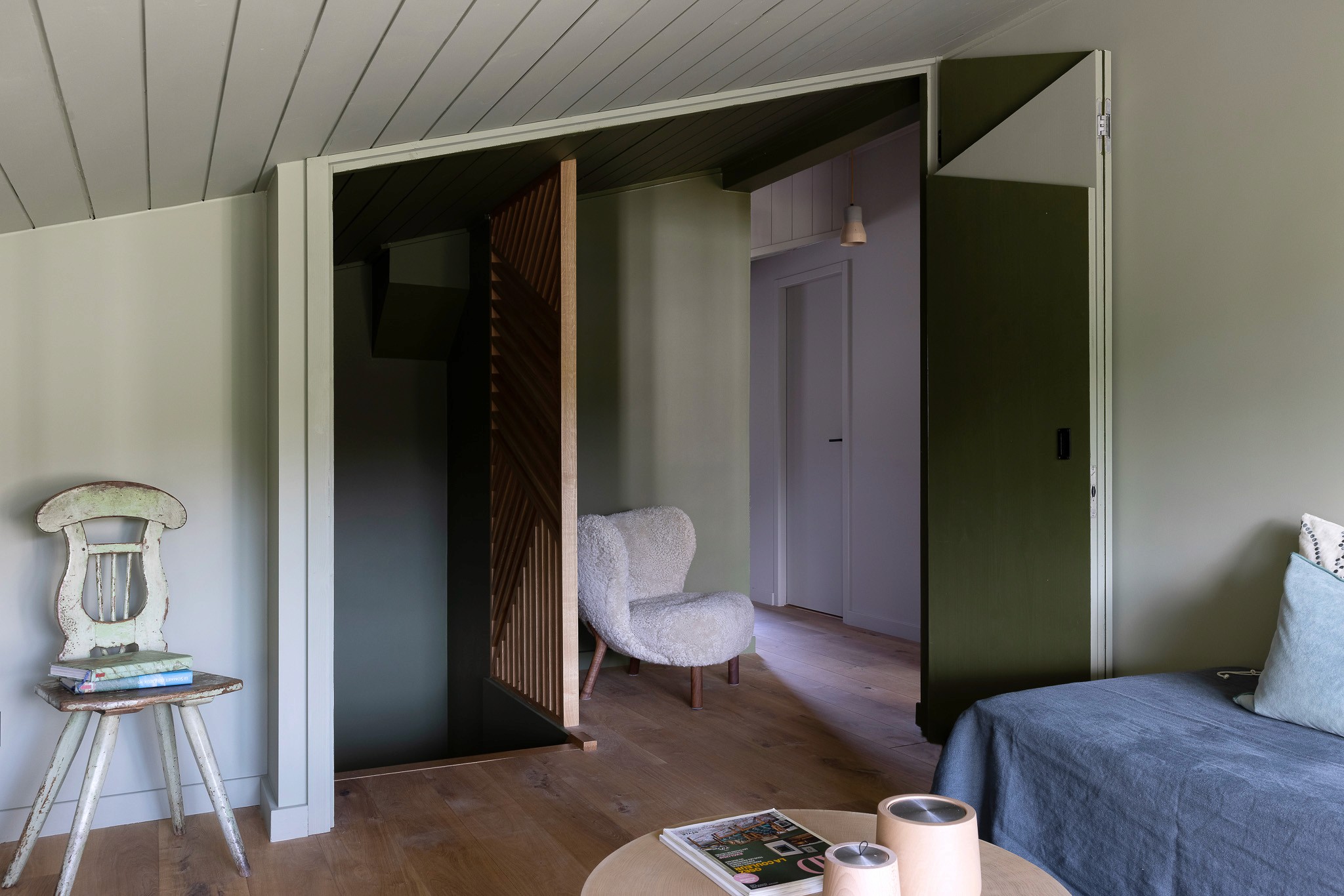 À l’étage, une déclinaison de verts subtils vient structurer les espaces, apportant profondeur et caractère. La mezzanine, pensée de façon ingénieuse, peut être entièrement fermée grâce à un système discret de portes battantes, offrant ainsi flexibilité et intimité selon les besoins.