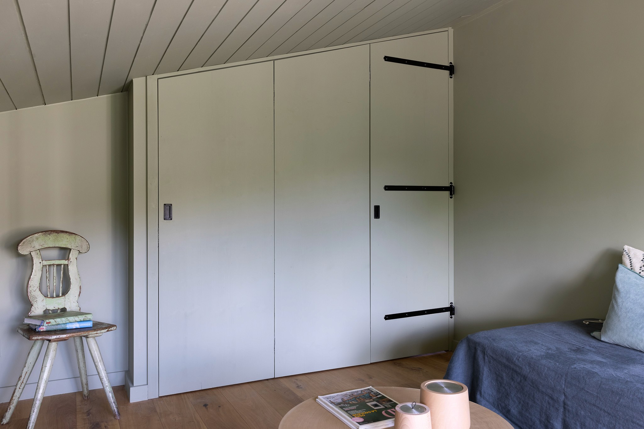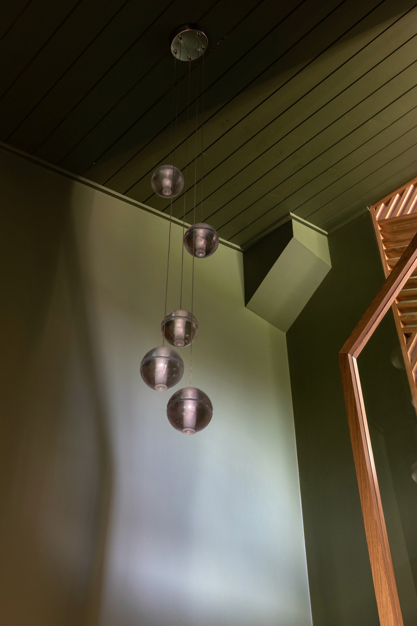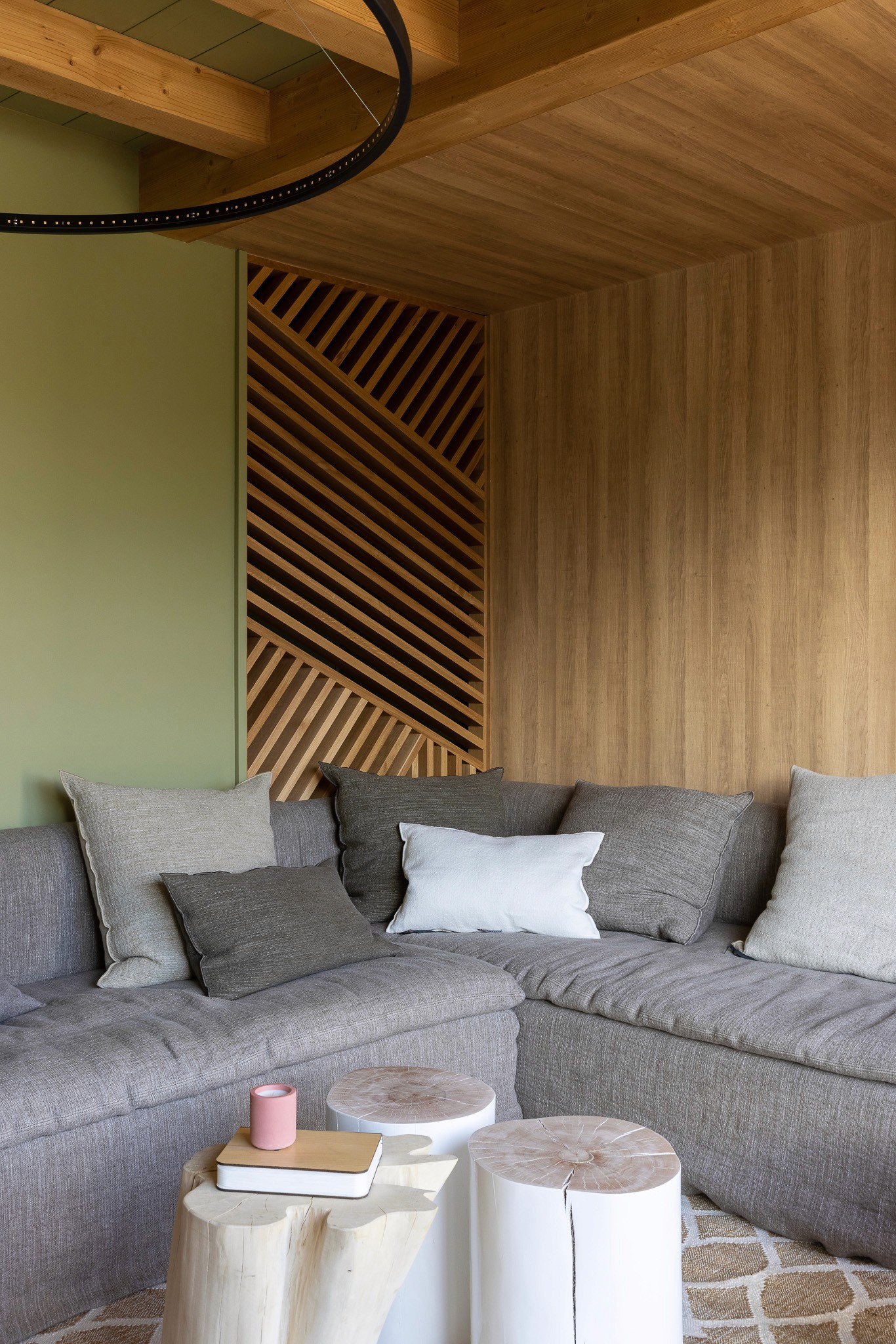 À l’étage, une déclinaison de verts subtils vient structurer les espaces, apportant profondeur et caractère. La mezzanine, pensée de façon ingénieuse, peut être entièrement fermée grâce à un système discret de portes battantes, offrant ainsi flexibilité et intimité selon les besoins.