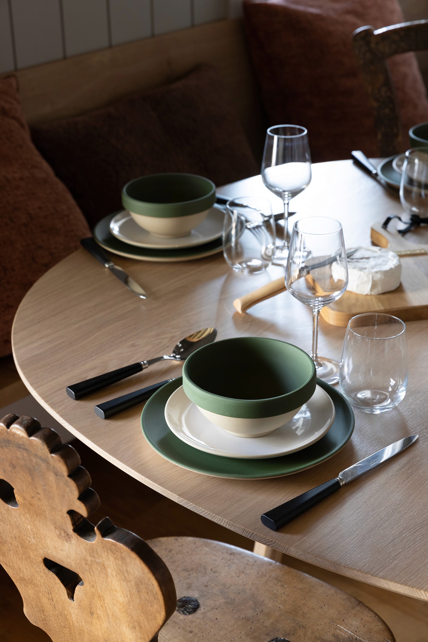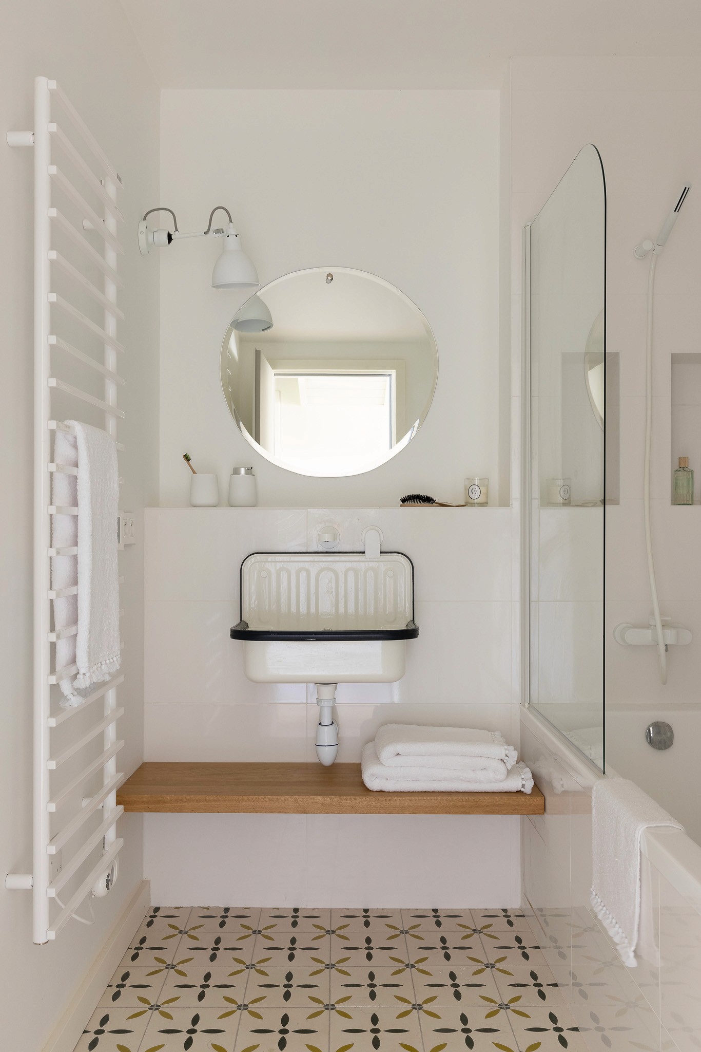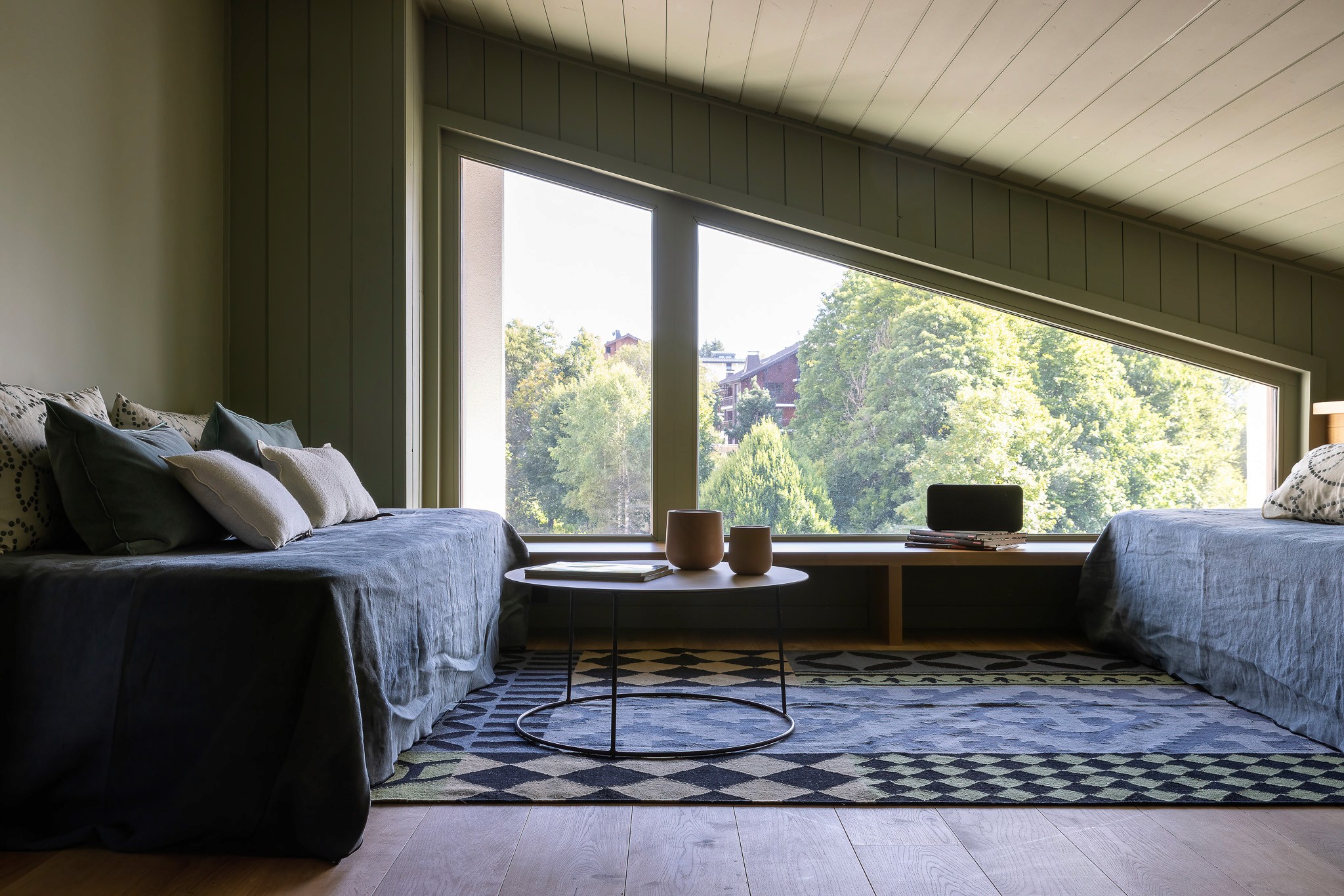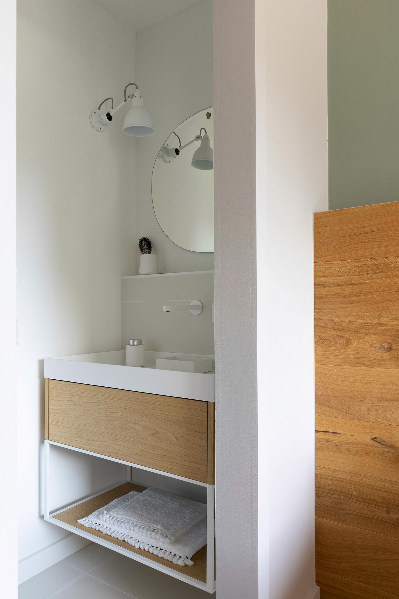 À l’étage, une déclinaison de verts subtils vient structurer les espaces, apportant profondeur et caractère. La mezzanine, pensée de façon ingénieuse, peut être entièrement fermée grâce à un système discret de portes battantes, offrant ainsi flexibilité et intimité selon les besoins.