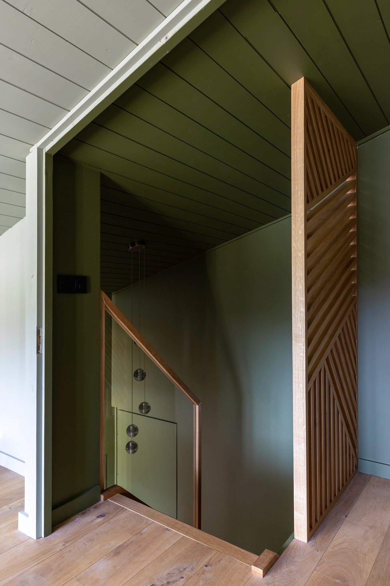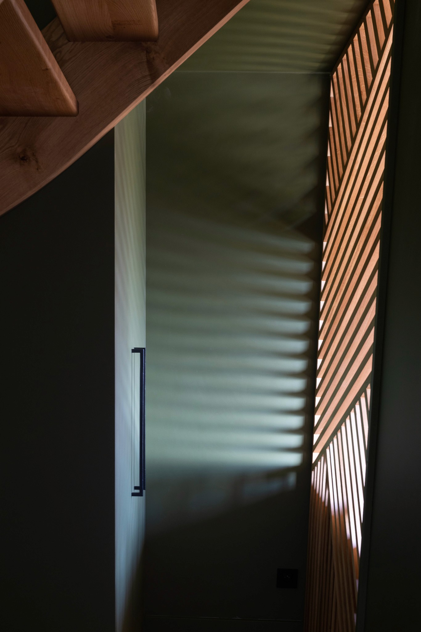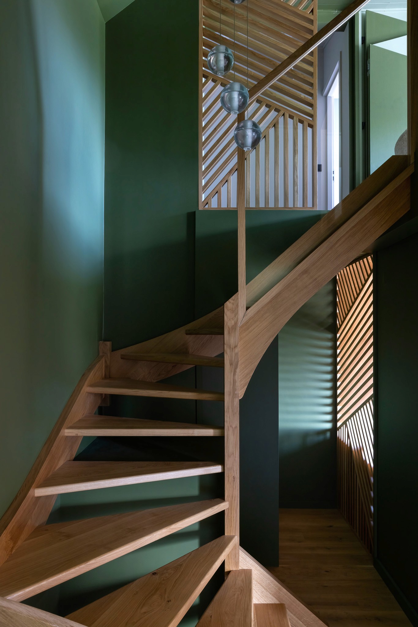 L’escalier, véritable pièce sculpturale, rythme la circulation avec ses jeux de claire-voie, d’ombre et de lumière, et devient un élément architectural à part entière.