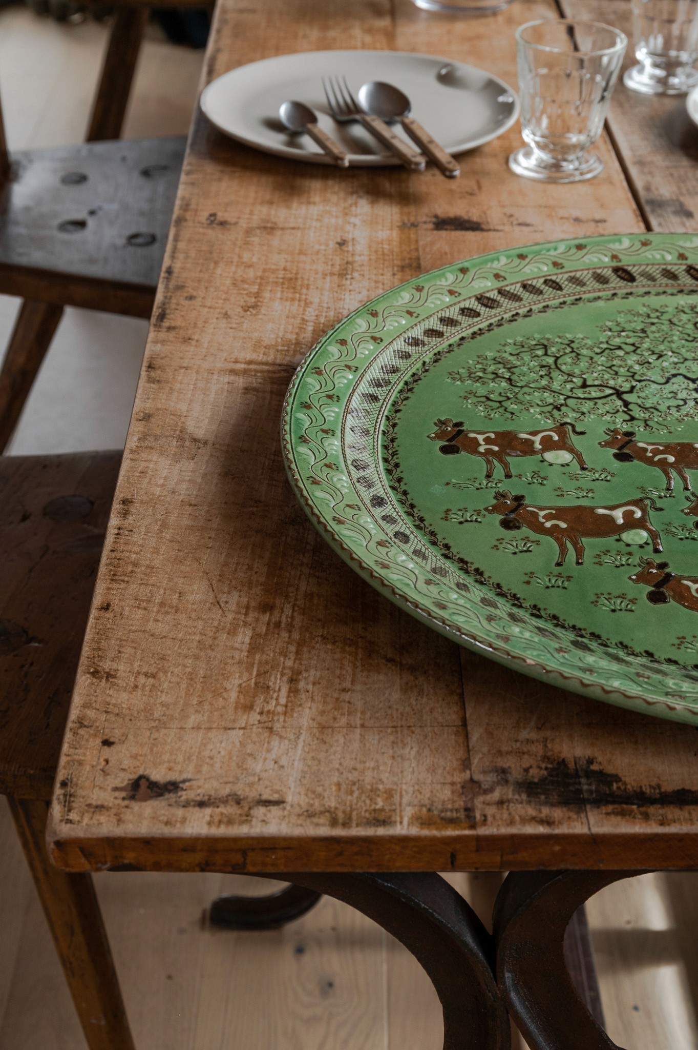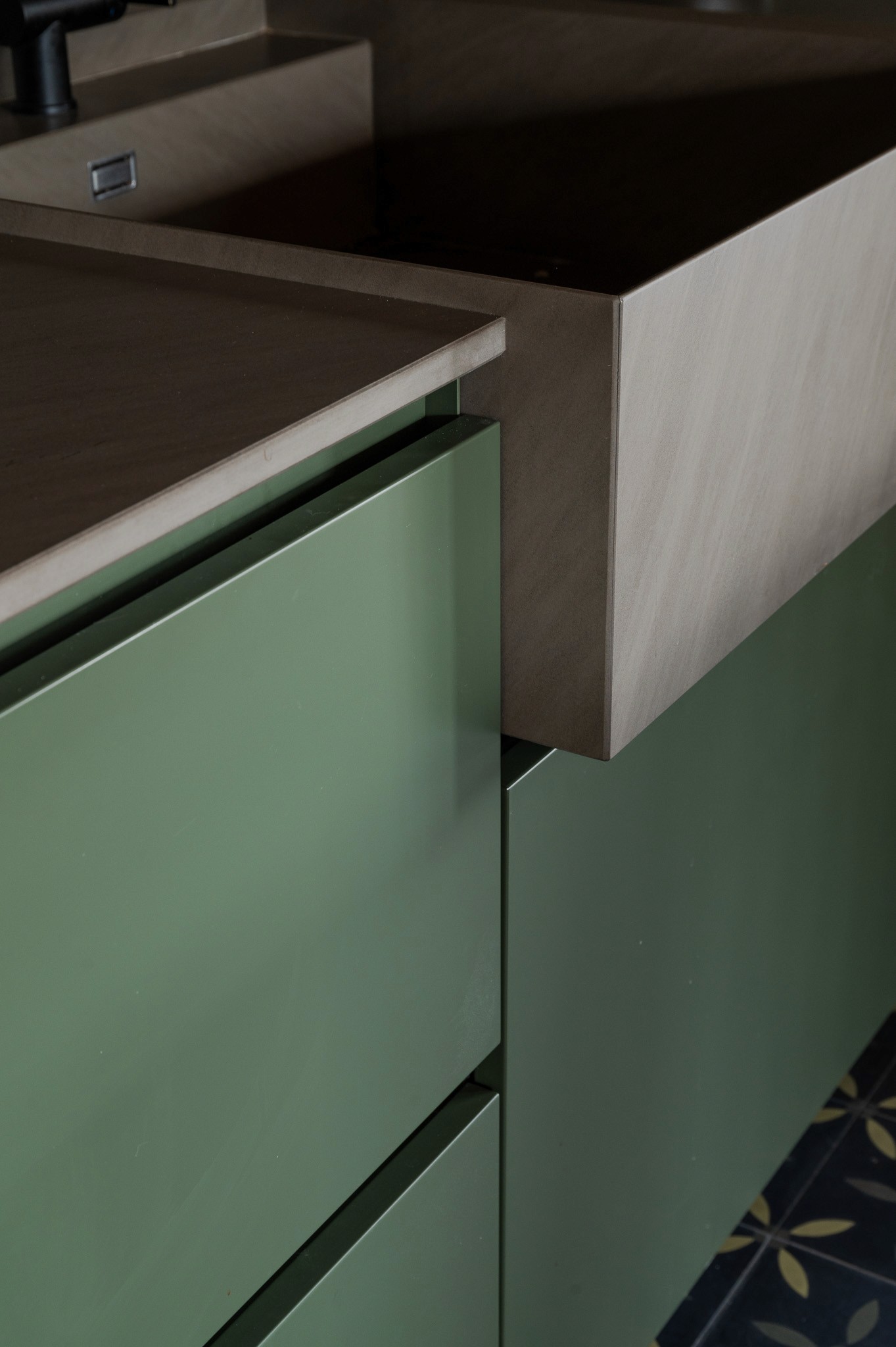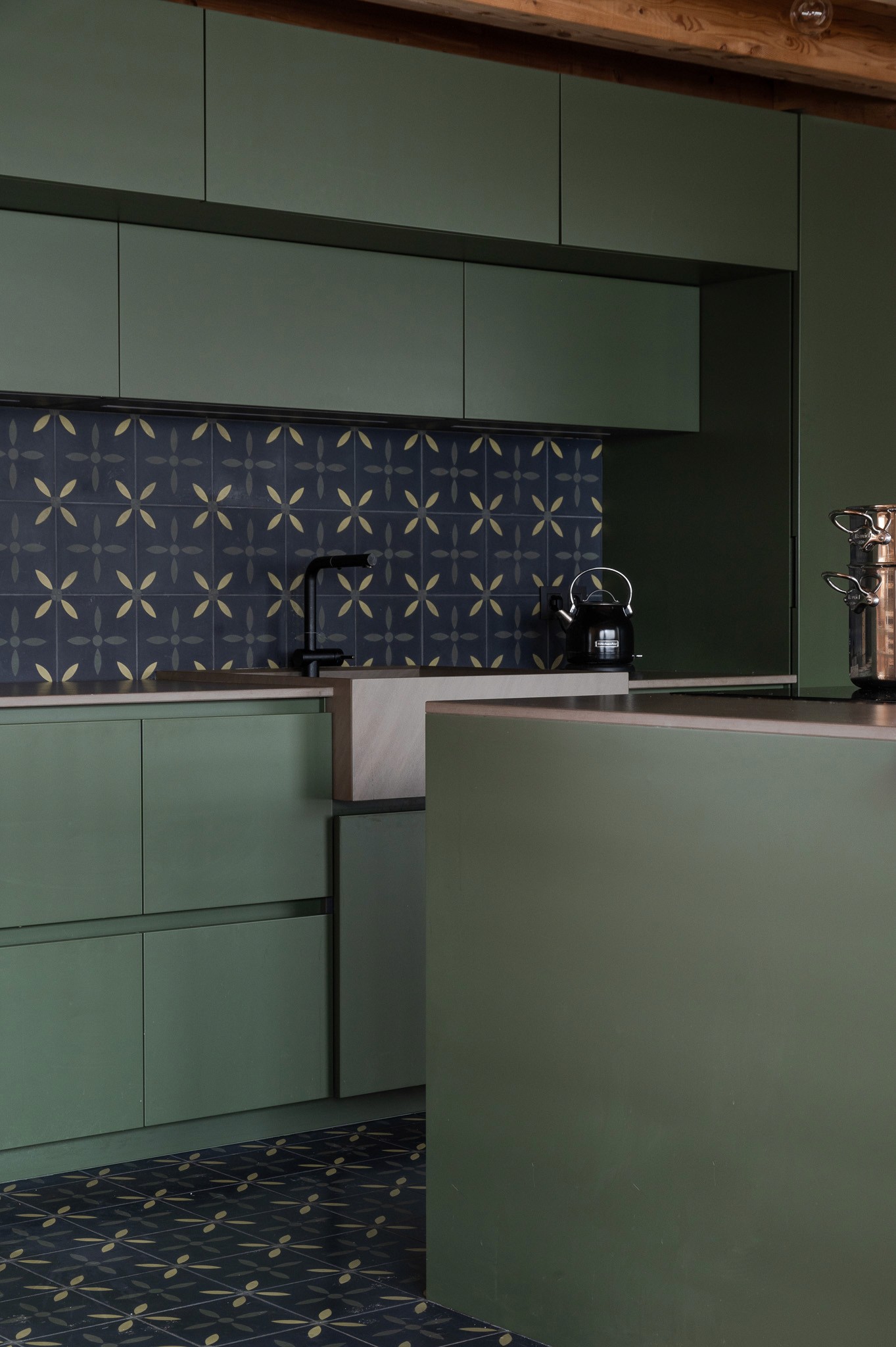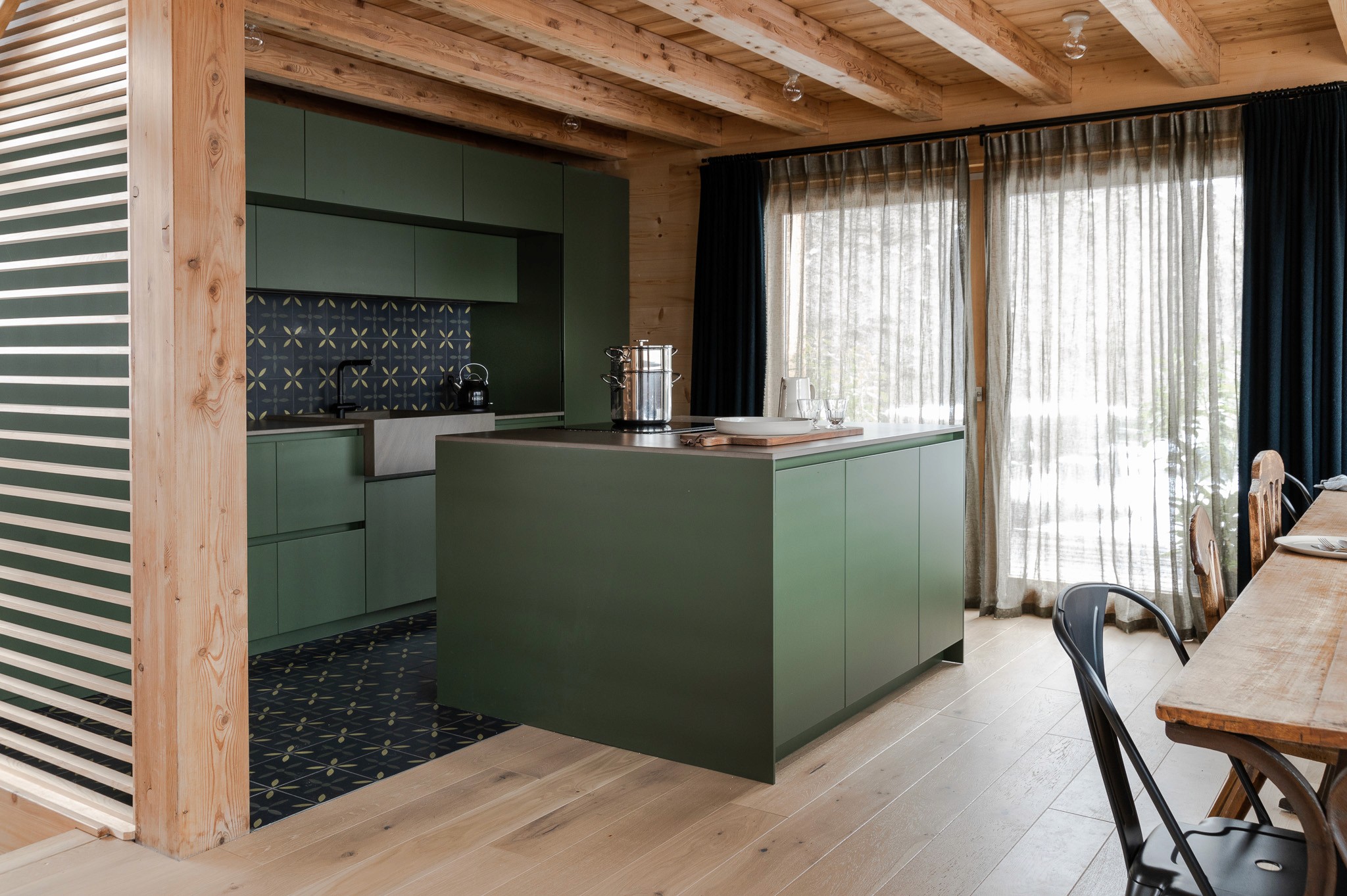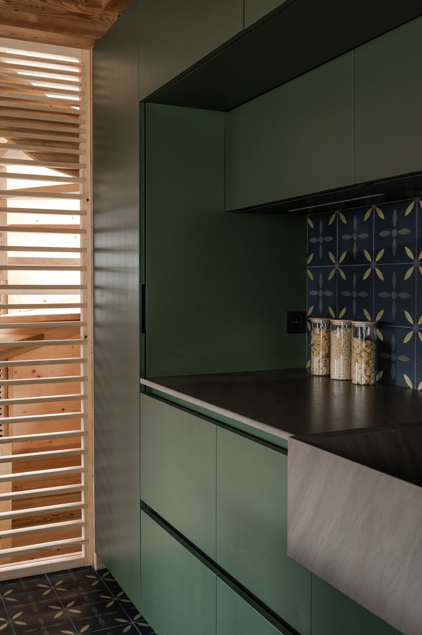 La cuisine, ultra contemporaine, s’impose dans un vert profond assumé. Elle contraste avec poésie avec le choix de meubles anciens chinés, qui apportent au lieu une âme et une dimension intemporelle.