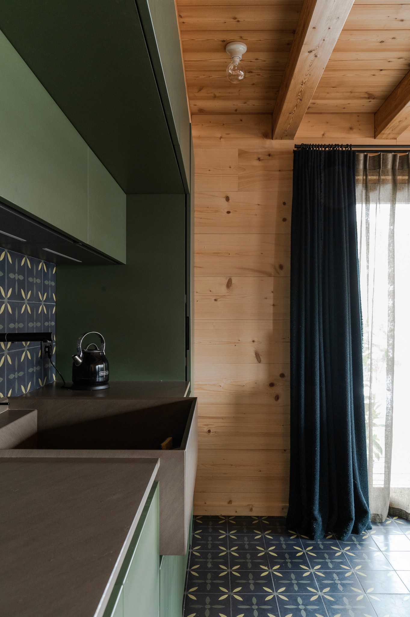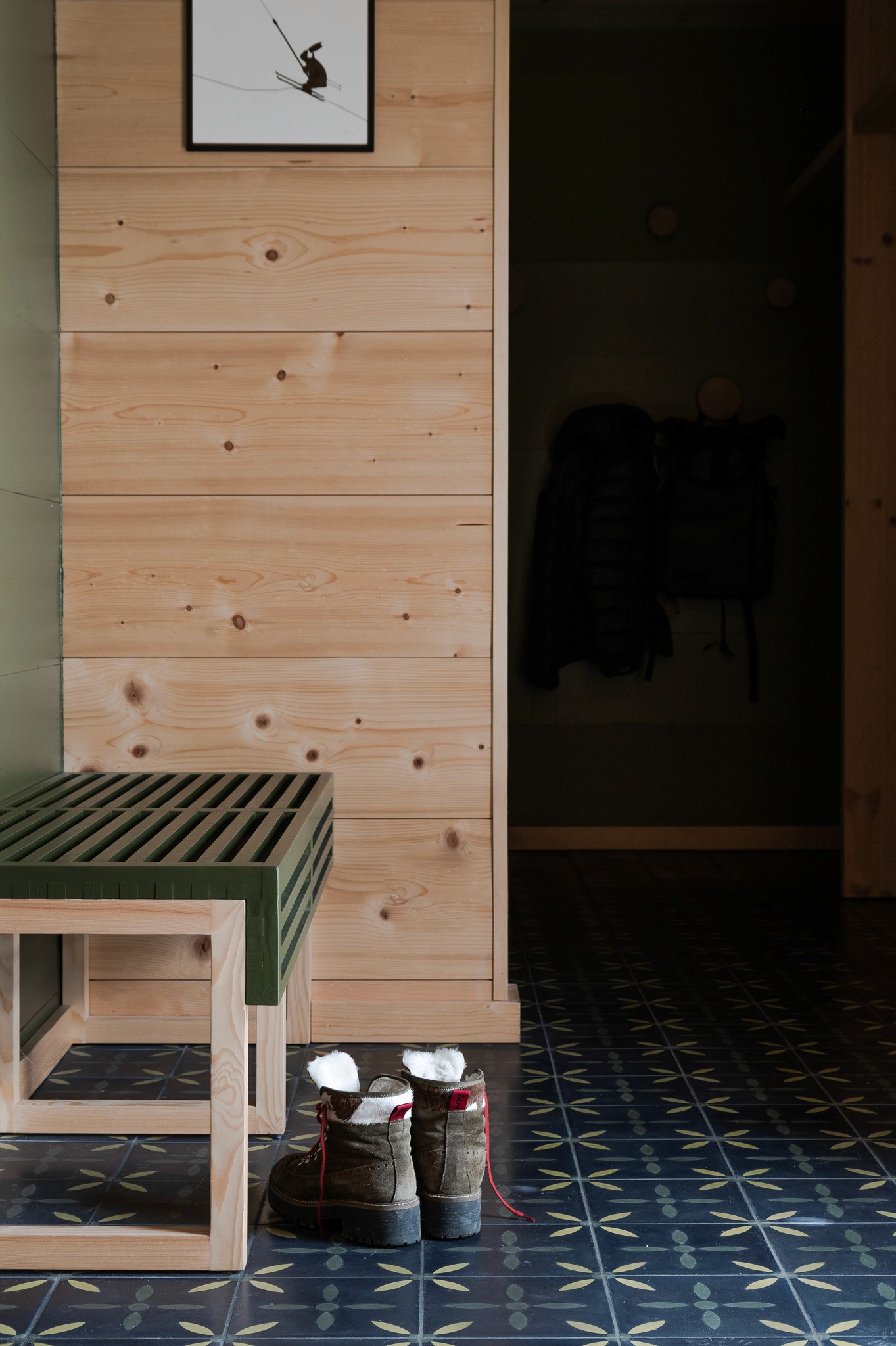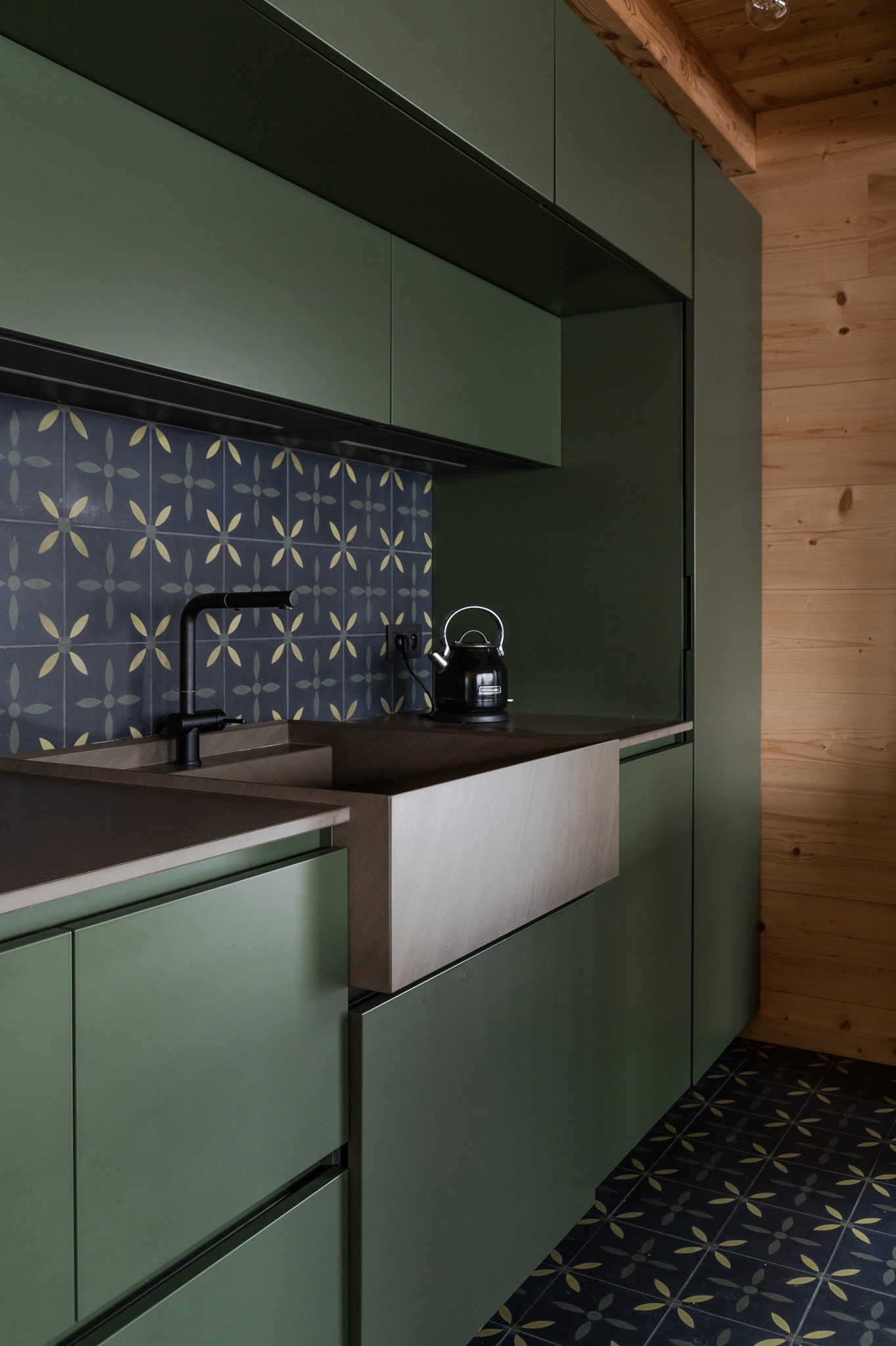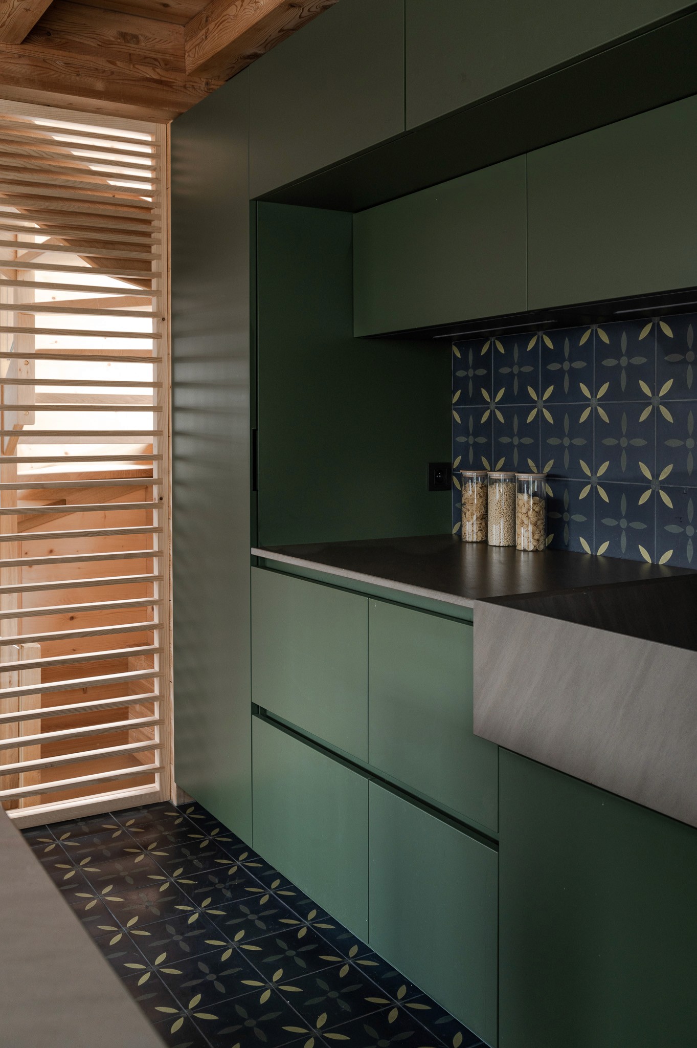 Les teintes de bleu et de vert, déclinées tout au long du projet, participent à une atmosphère douce et cohérente. L’agence a même imaginé des carreaux de ciment sur mesure, dessinés exclusivement pour ce chalet, soulignant la volonté de créer un lieu véritablement unique.