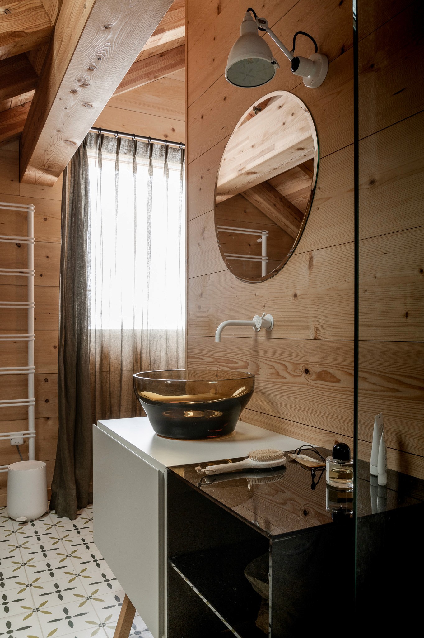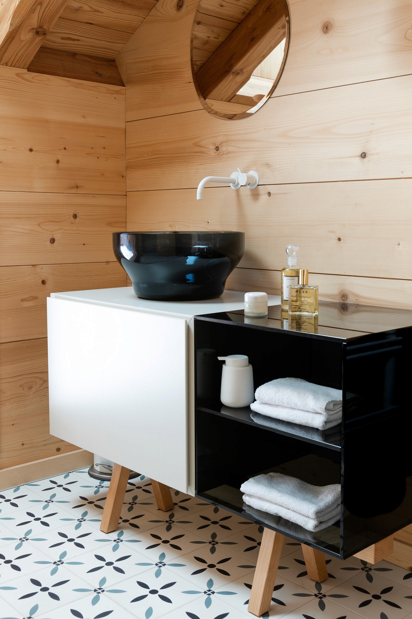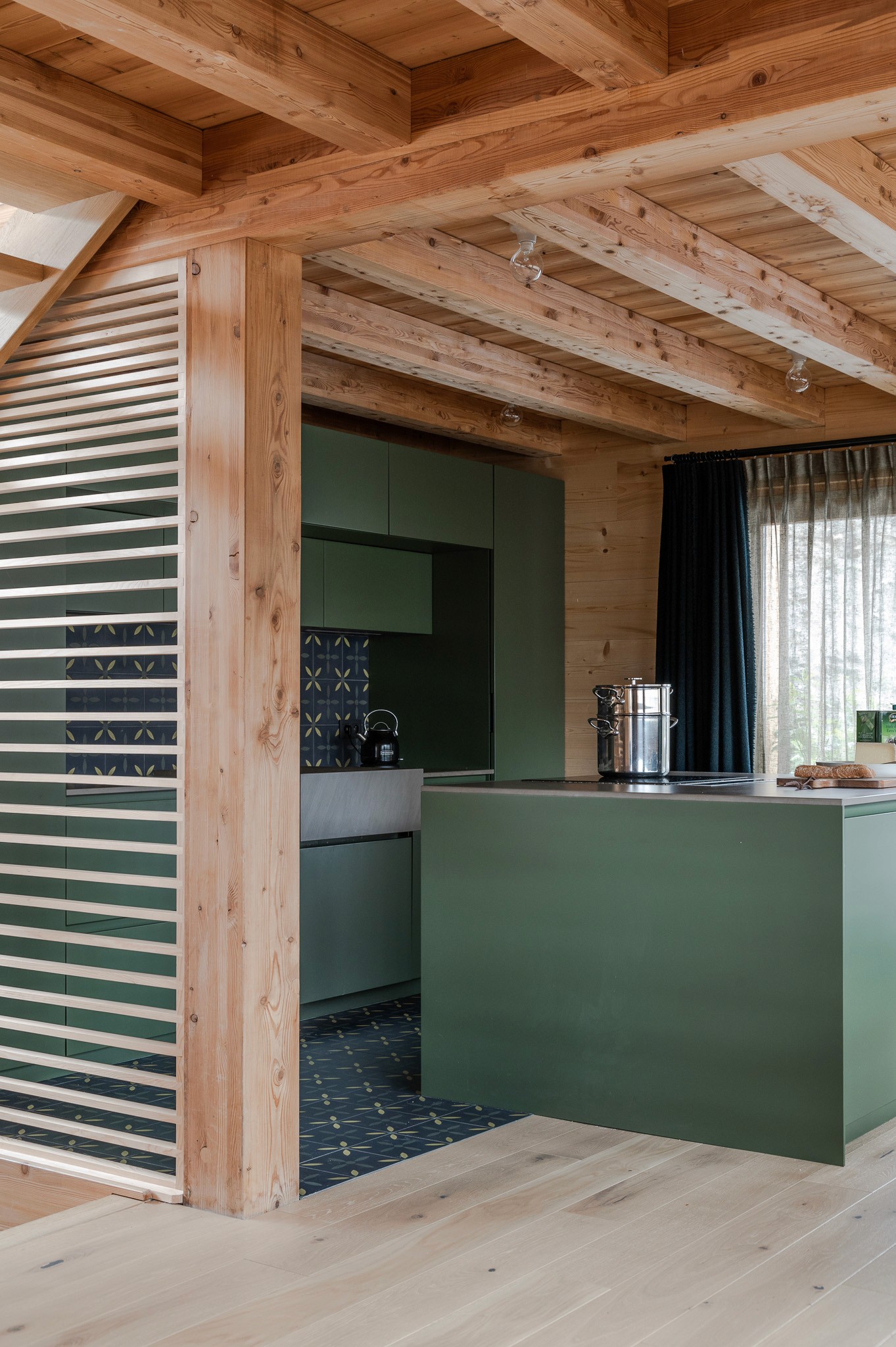 Les teintes de bleu et de vert, déclinées tout au long du projet, participent à une atmosphère douce et cohérente. L’agence a même imaginé des carreaux de ciment sur mesure, dessinés exclusivement pour ce chalet, soulignant la volonté de créer un lieu véritablement unique.
