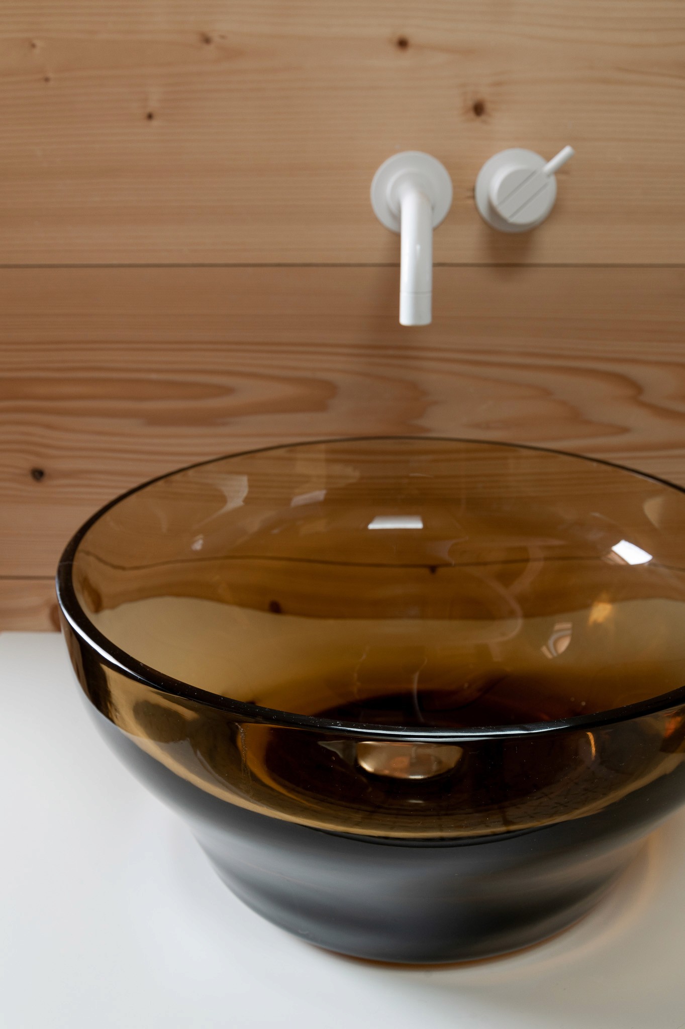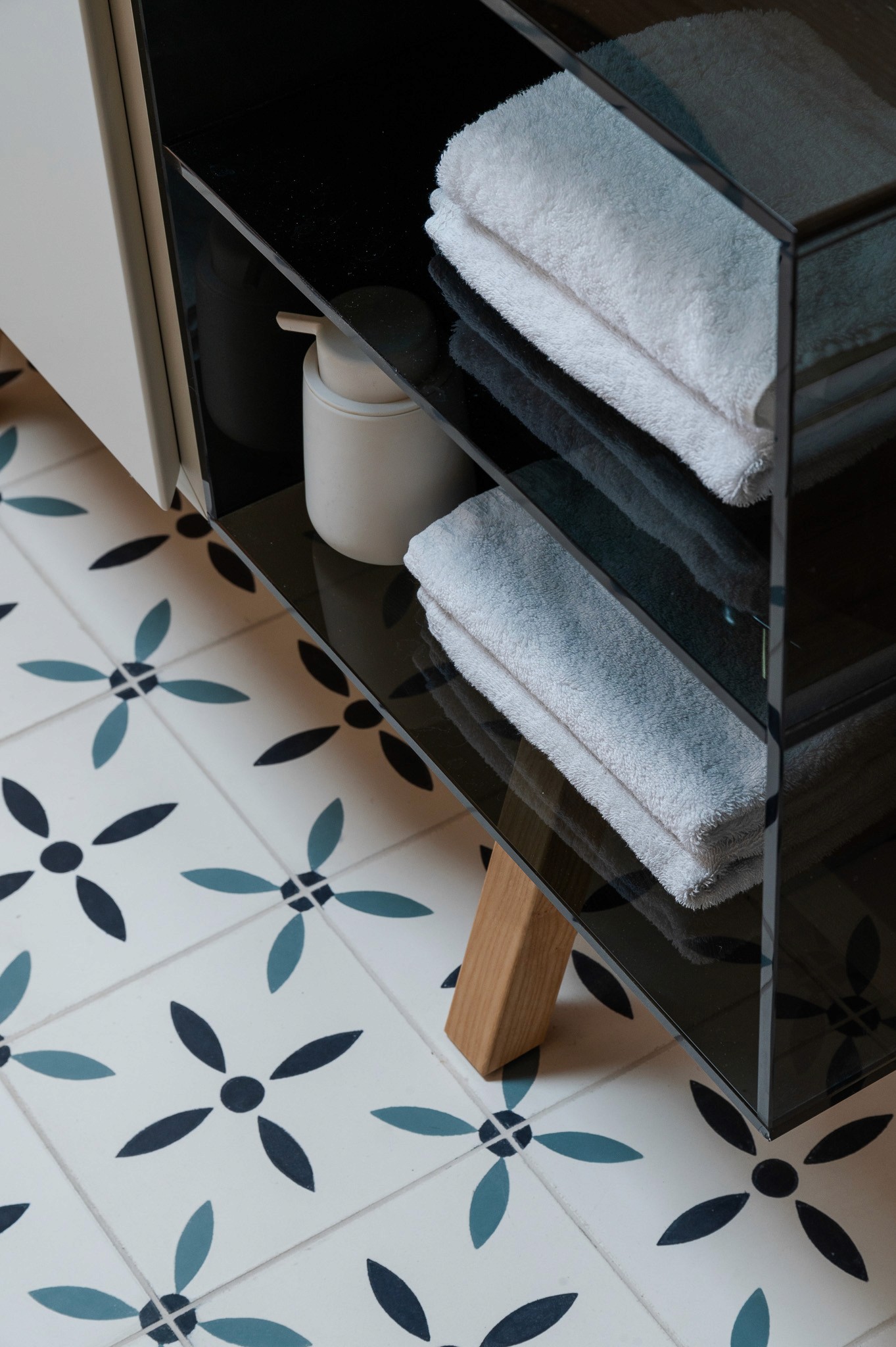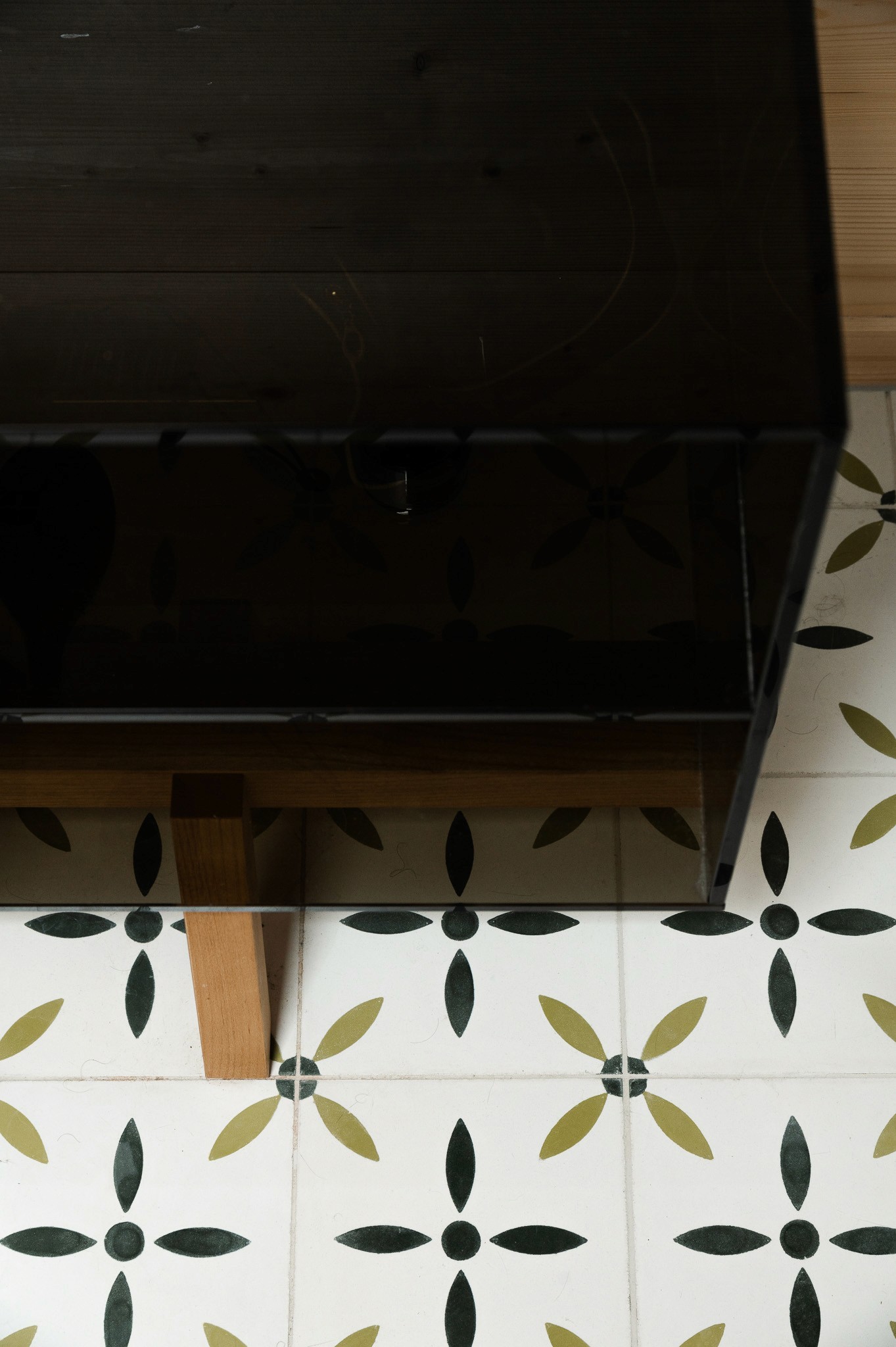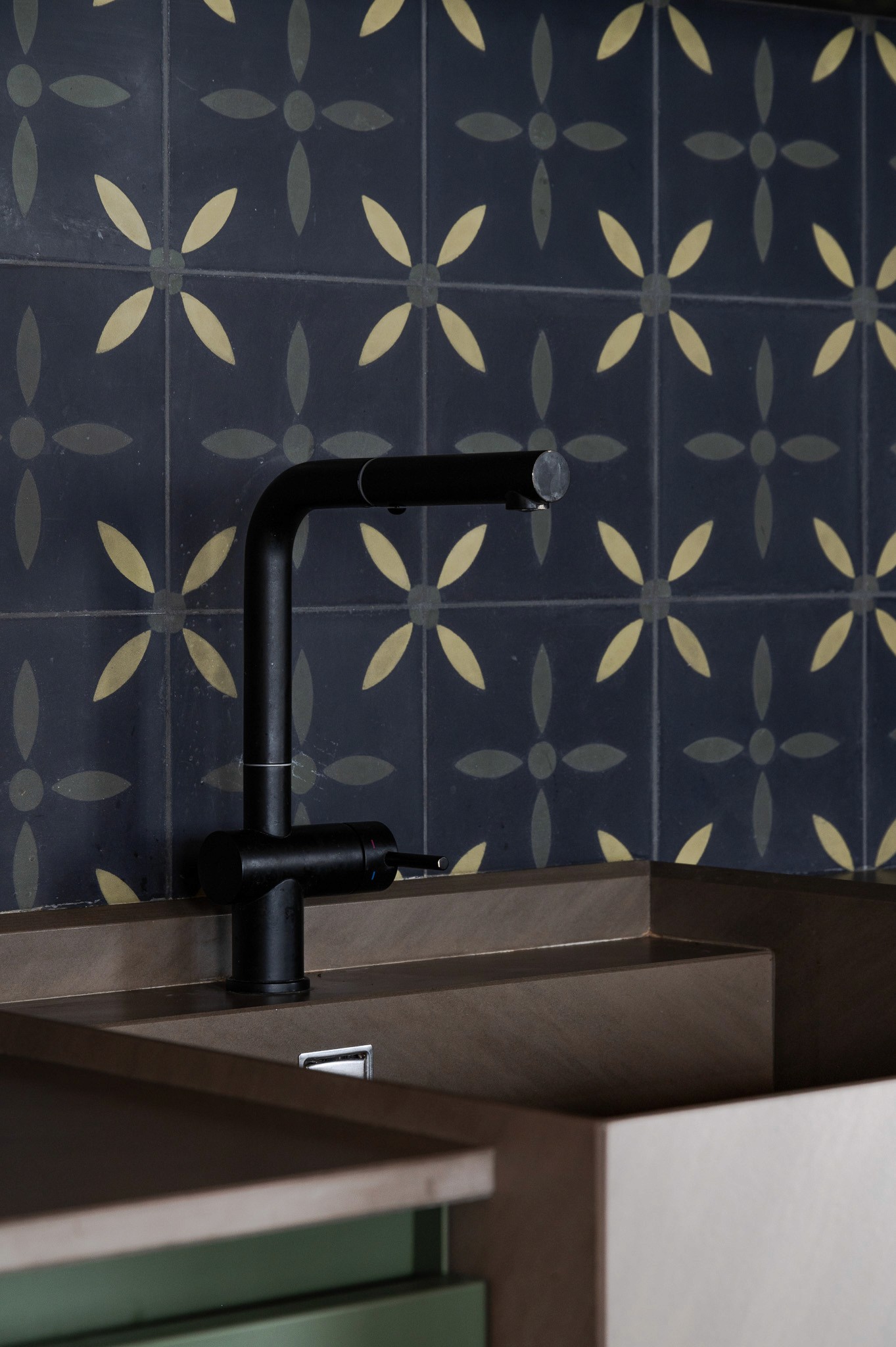 Les teintes de bleu et de vert, déclinées tout au long du projet, participent à une atmosphère douce et cohérente. L’agence a même imaginé des carreaux de ciment sur mesure, dessinés exclusivement pour ce chalet, soulignant la volonté de créer un lieu véritablement unique.