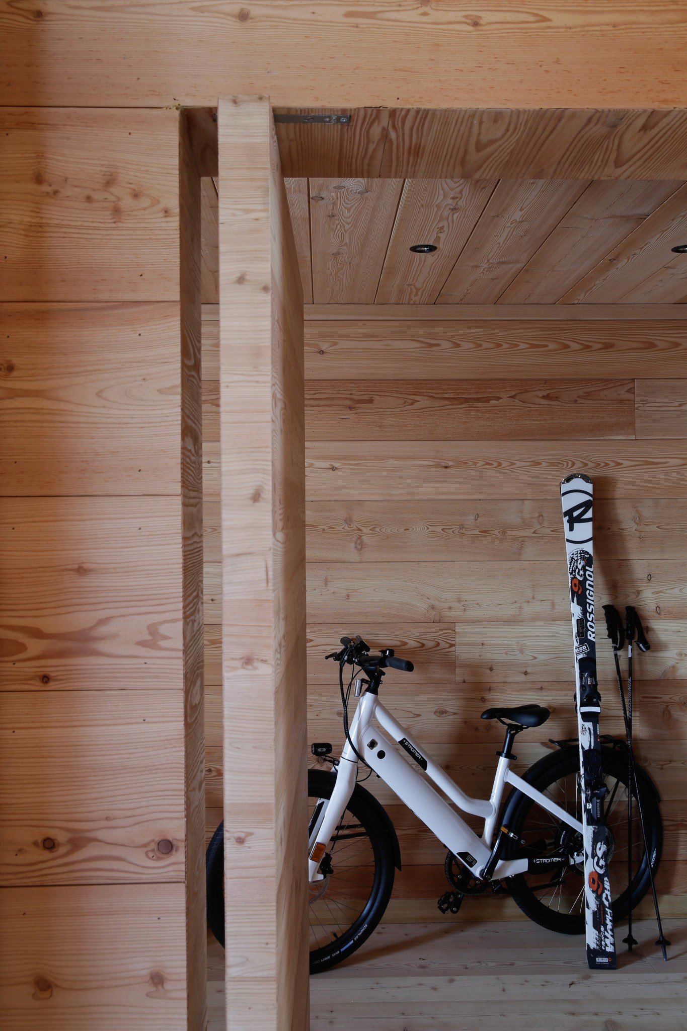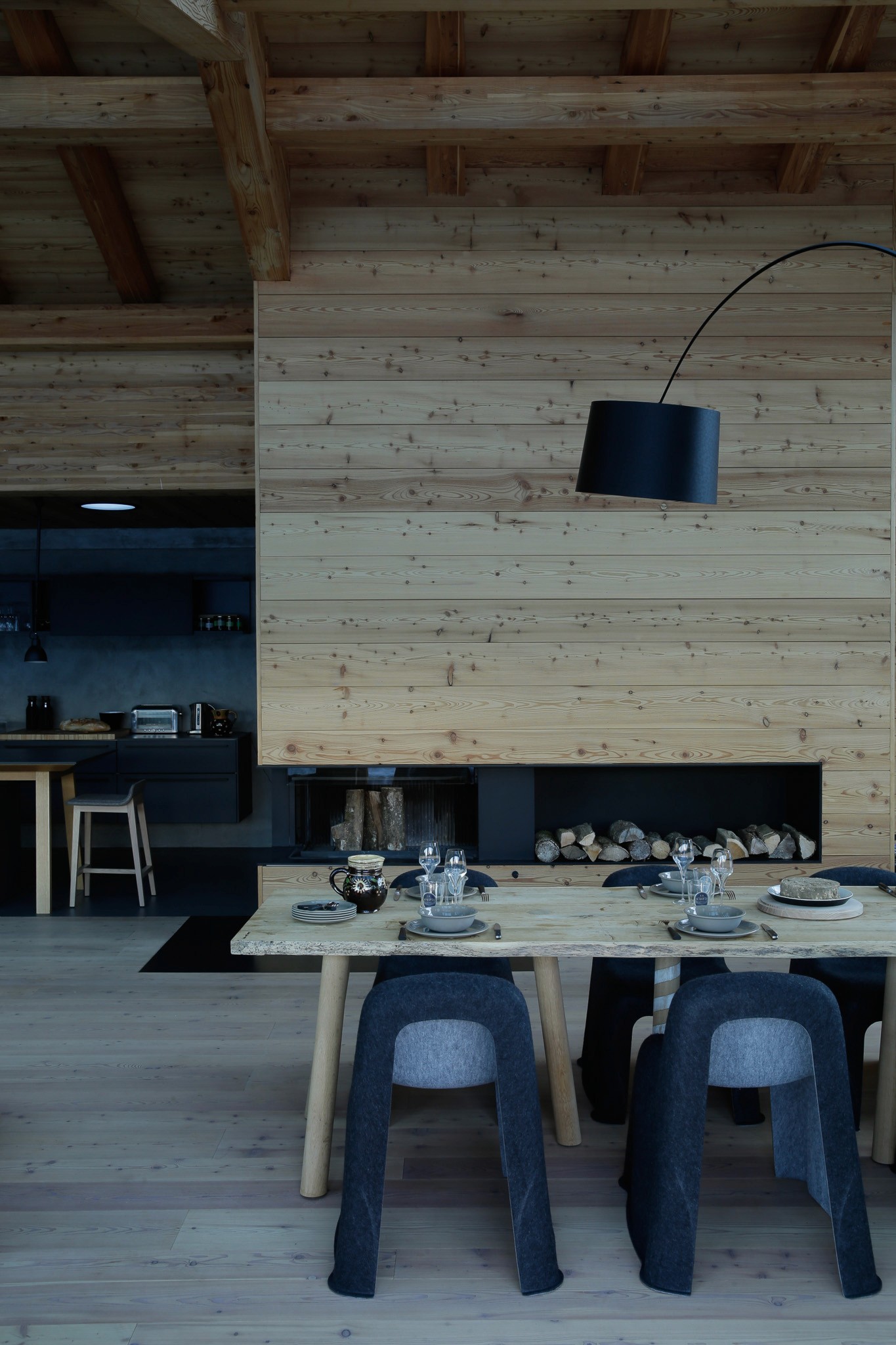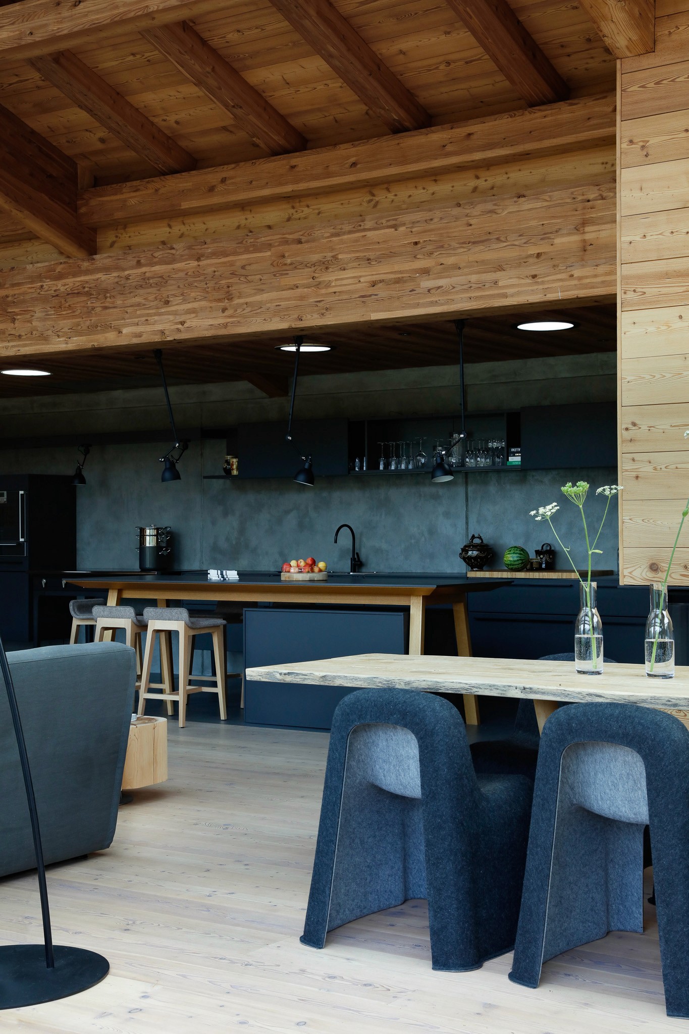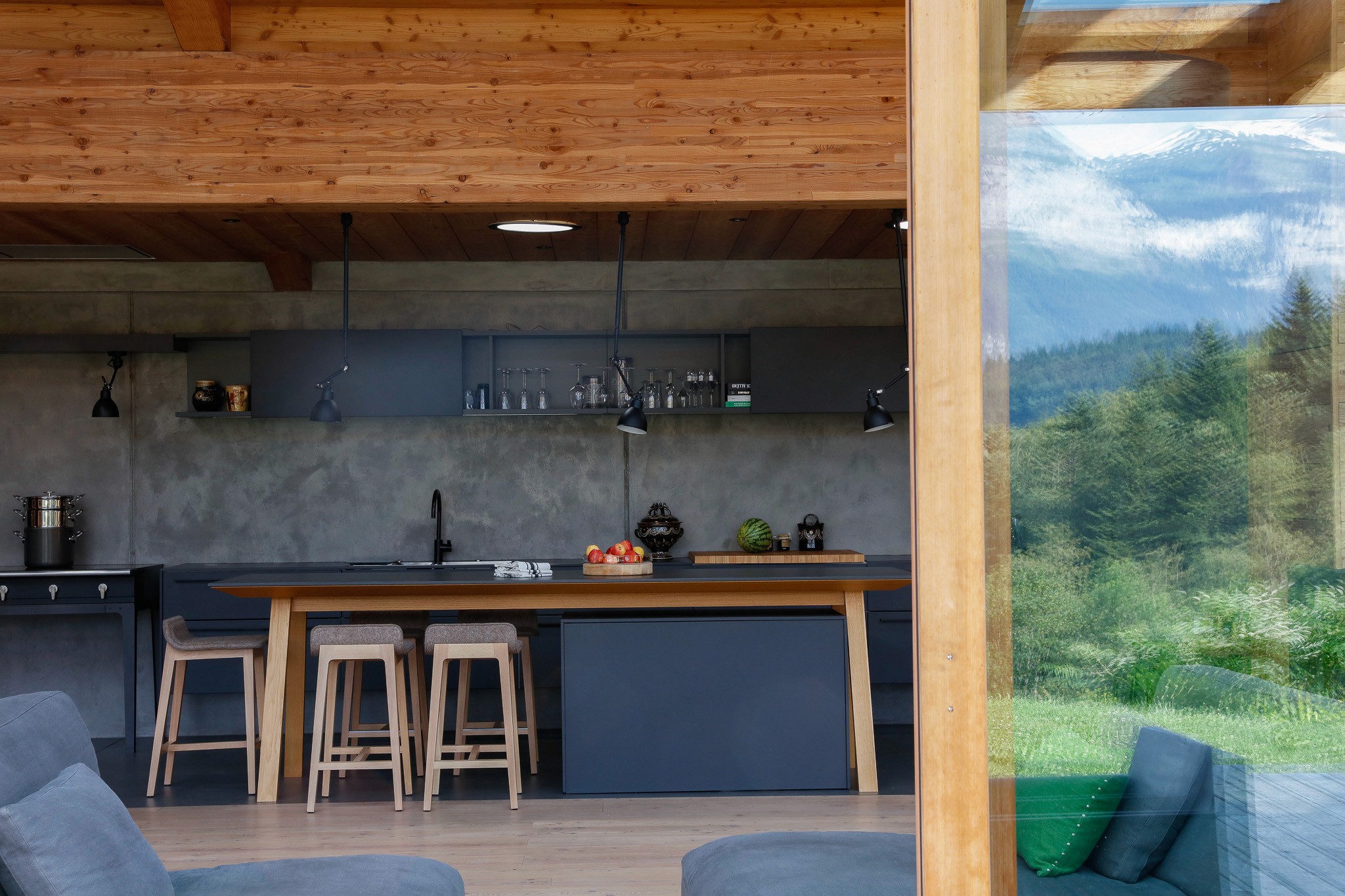 Le chalet abrite une seule chambre, conçue comme une « boîte en bois » avec sa propre salle de bain, apportant intimité et chaleur au coeur de ce volume ouvert. La cuisine ultra contemporaine, équipée d’une table La Cornue et d’un rôtissoire Flamberge, devient le centre névralgique du lieu — entre performance culinaire et esthétique sculpturale.