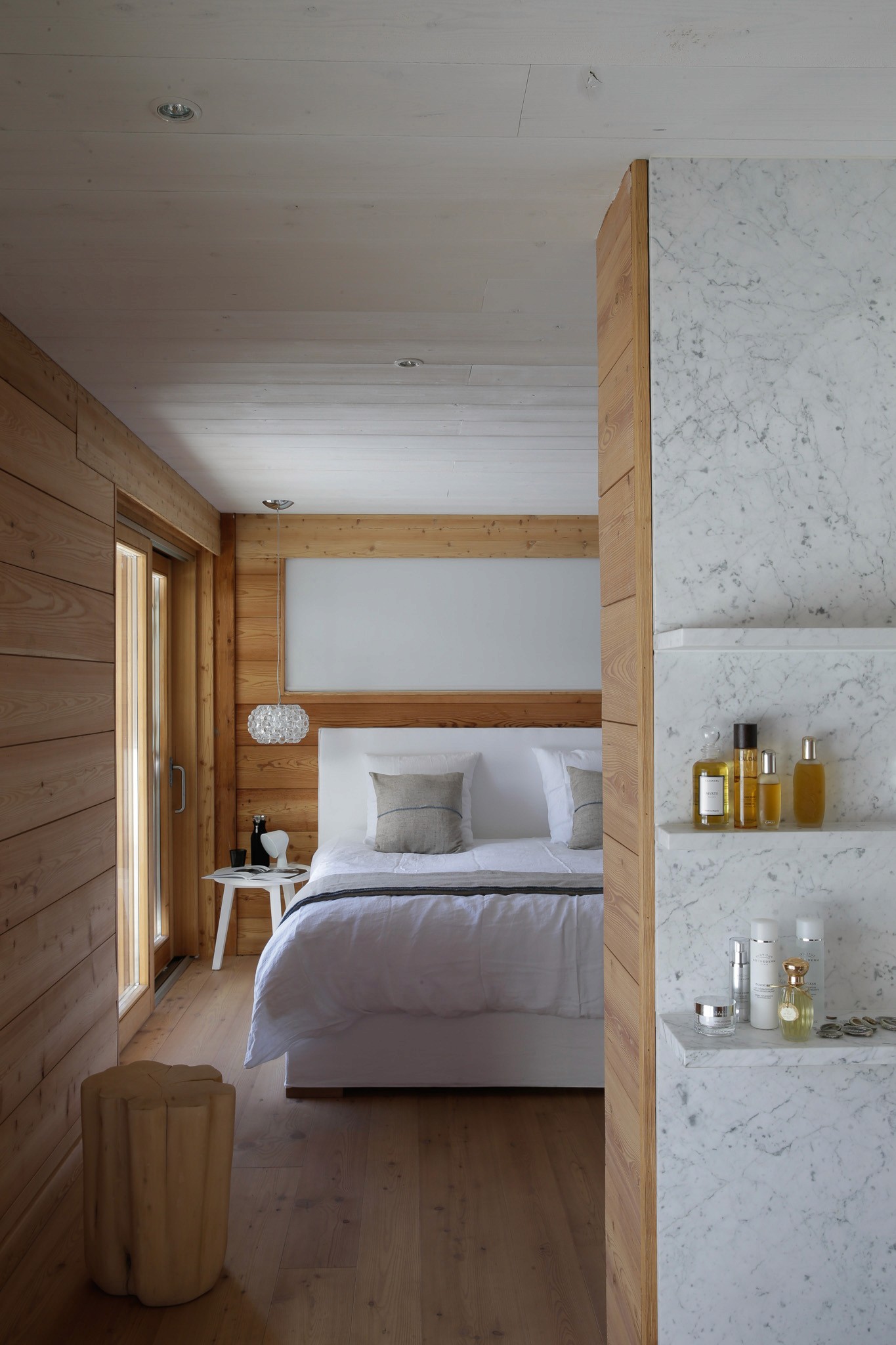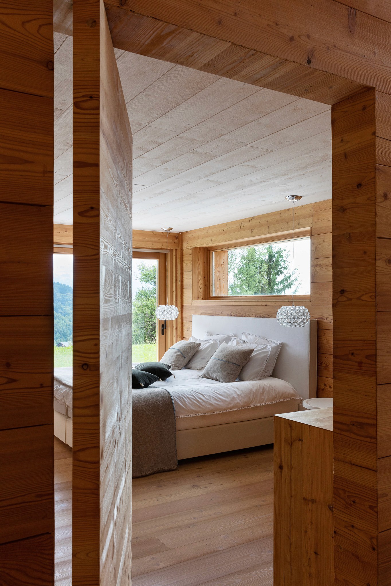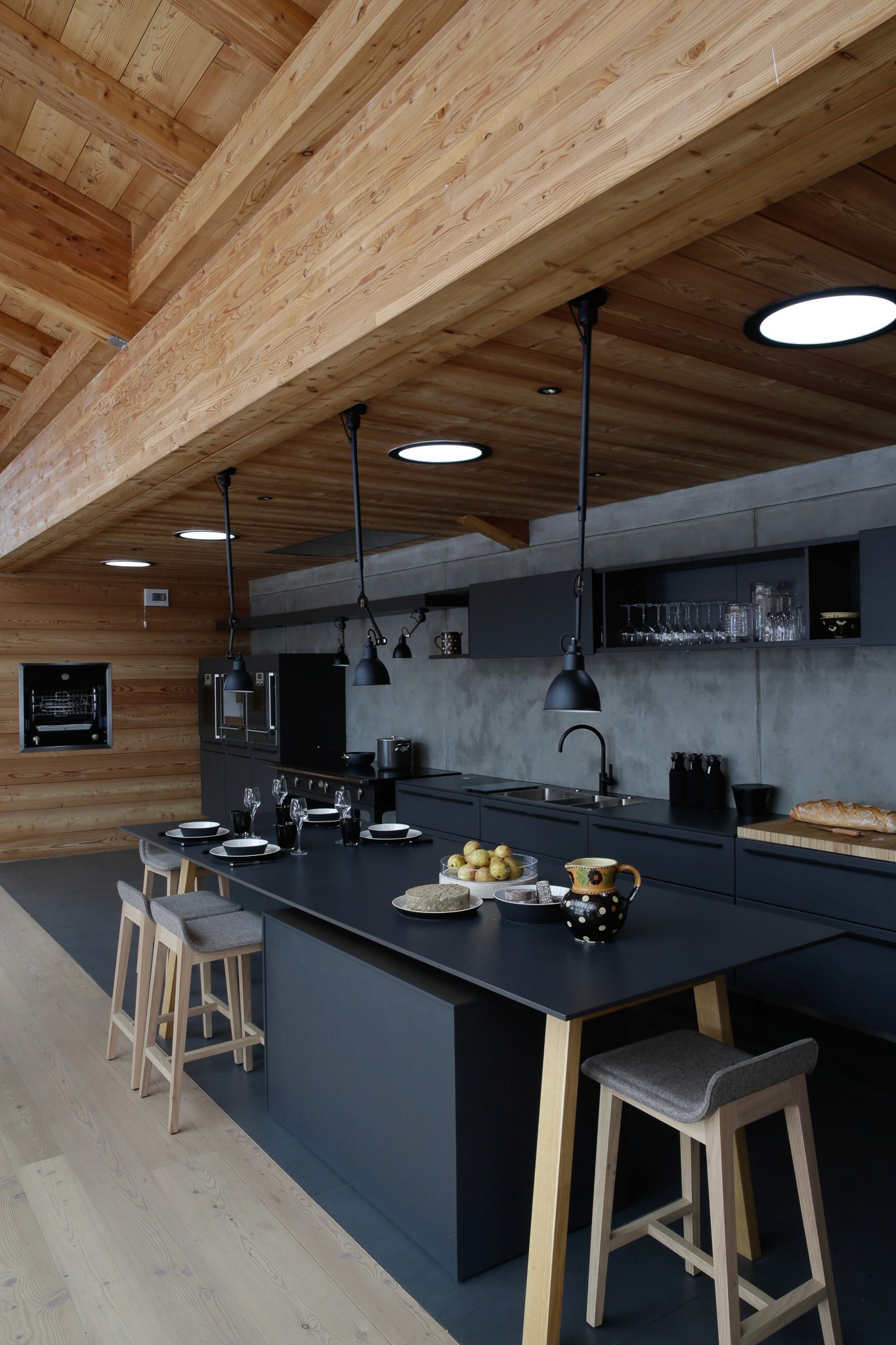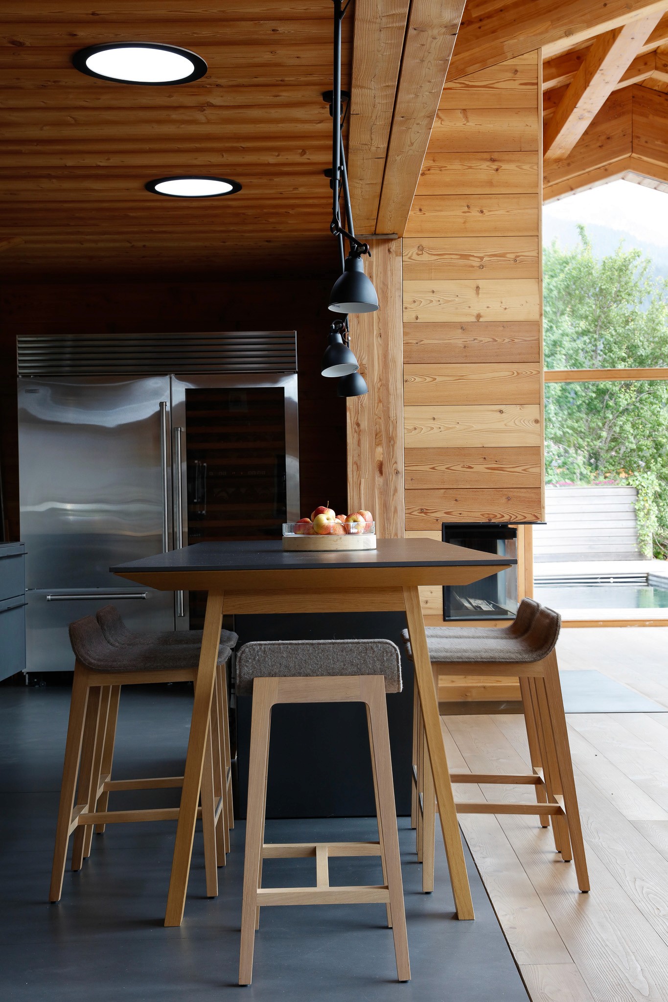 Le chalet abrite une seule chambre, conçue comme une « boîte en bois » avec sa propre salle de bain, apportant intimité et chaleur au coeur de ce volume ouvert. La cuisine ultra contemporaine, équipée d’une table La Cornue et d’un rôtissoire Flamberge, devient le centre névralgique du lieu — entre performance culinaire et esthétique sculpturale.