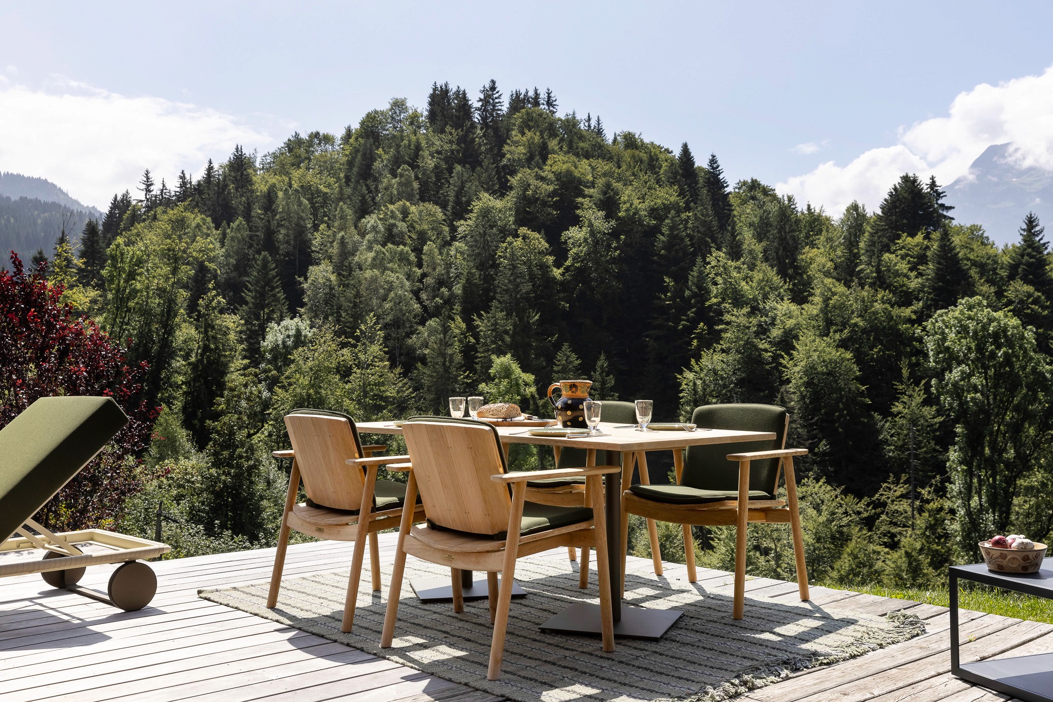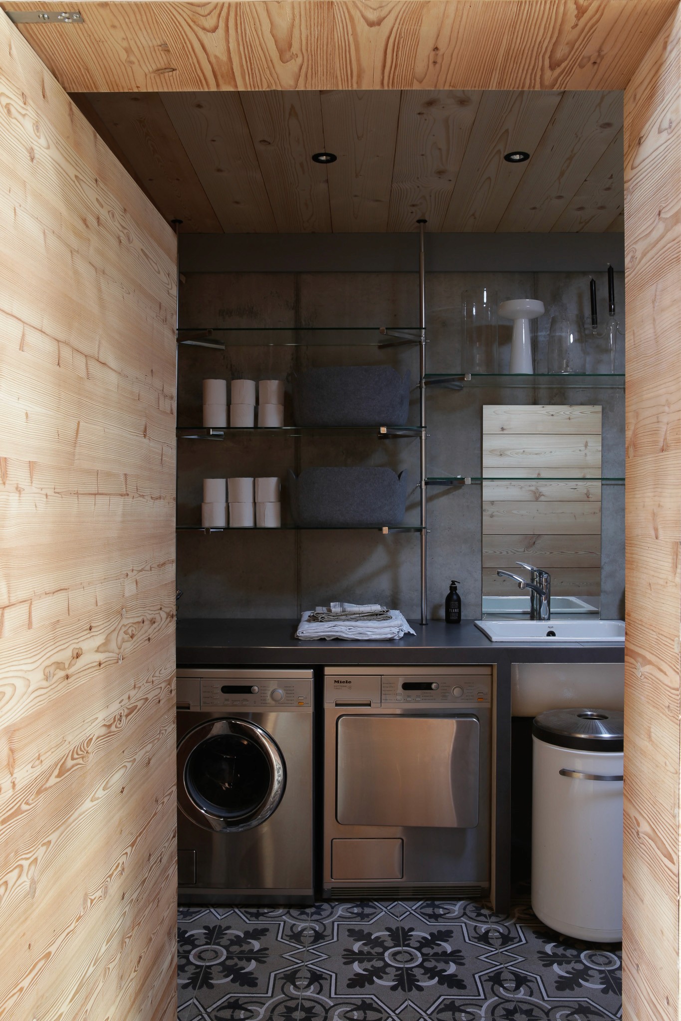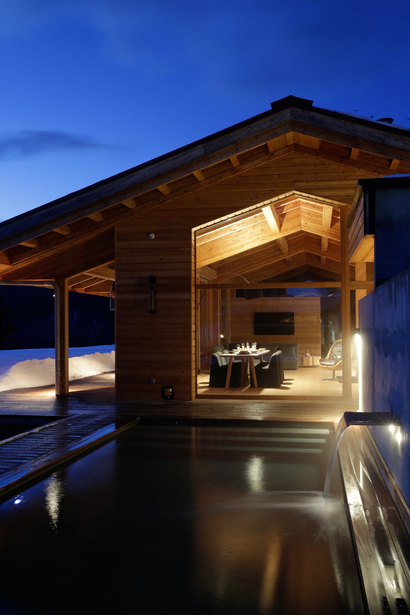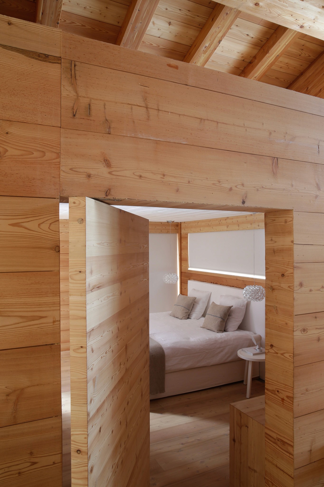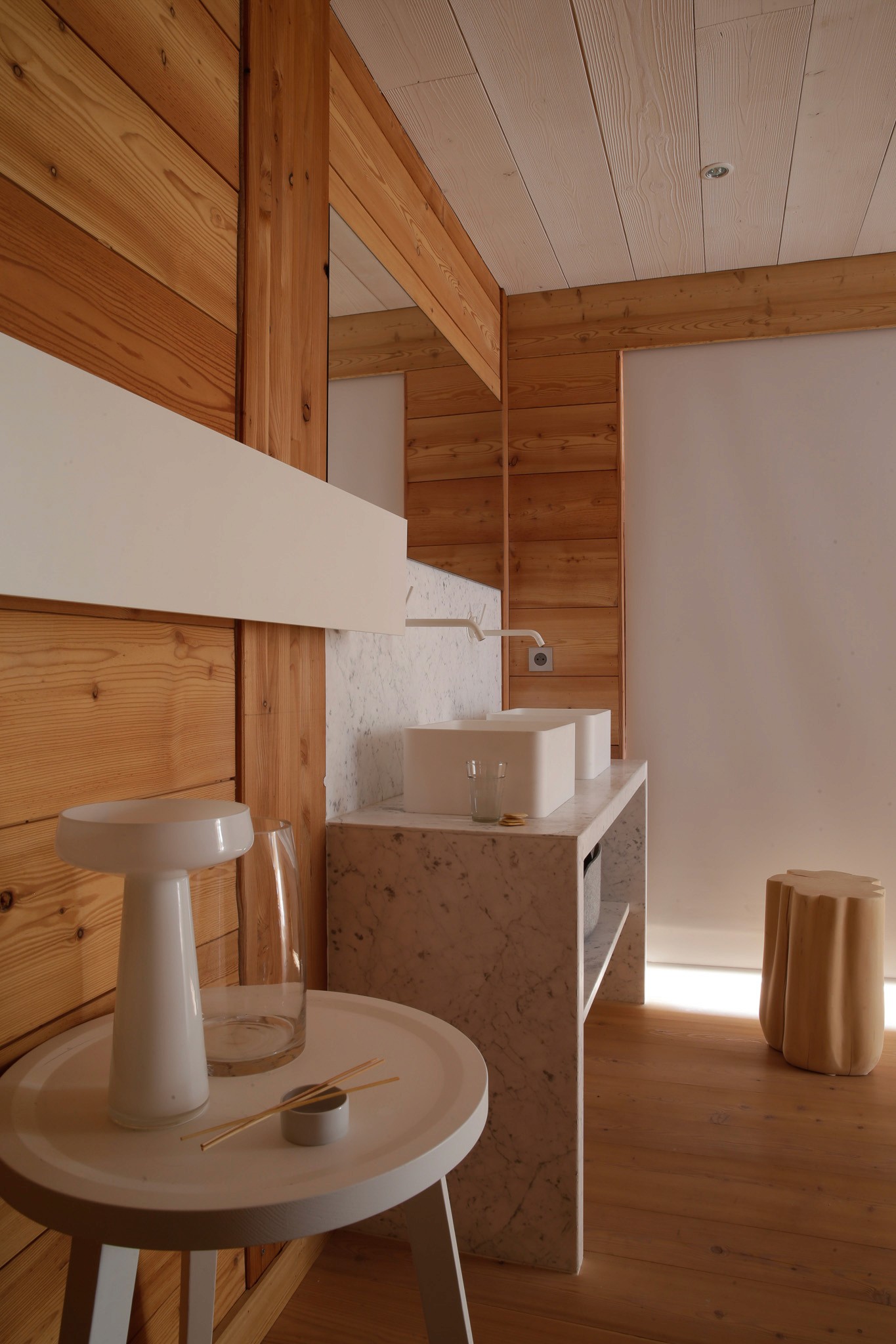 Le chalet abrite une seule chambre, conçue comme une « boîte en bois » avec sa propre salle de bain, apportant intimité et chaleur au coeur de ce volume ouvert. La cuisine ultra contemporaine, équipée d’une table La Cornue et d’un rôtissoire Flamberge, devient le centre névralgique du lieu — entre performance culinaire et esthétique sculpturale.