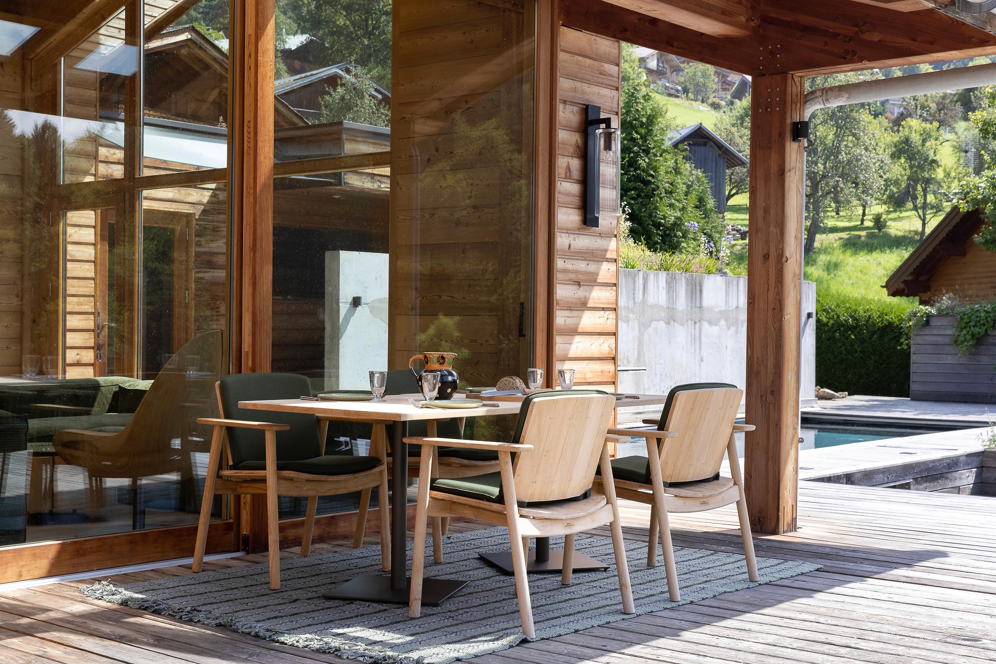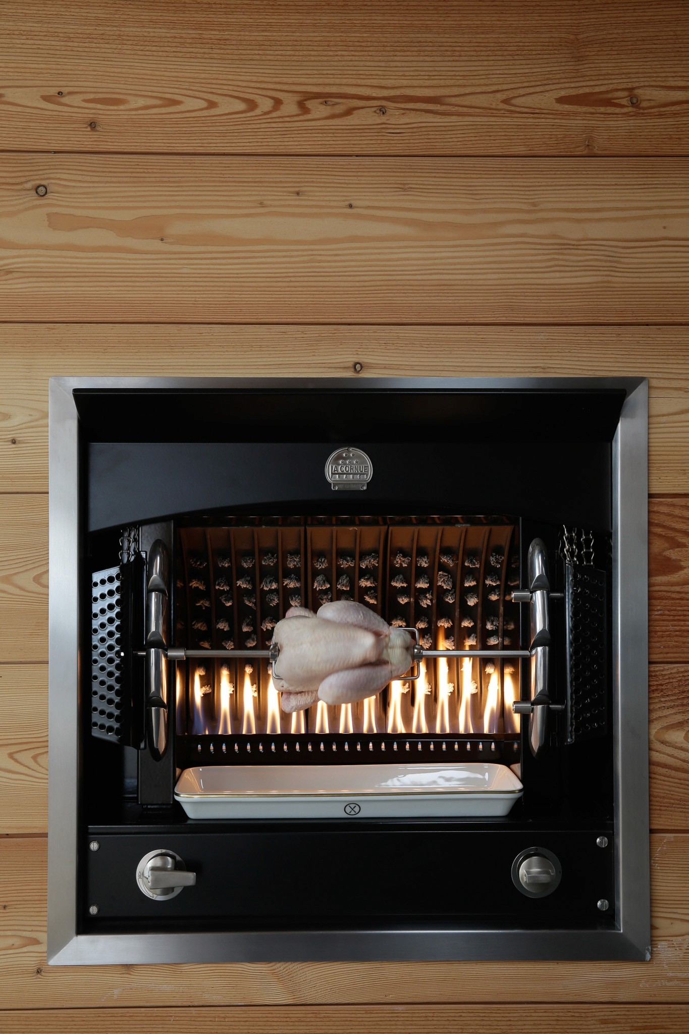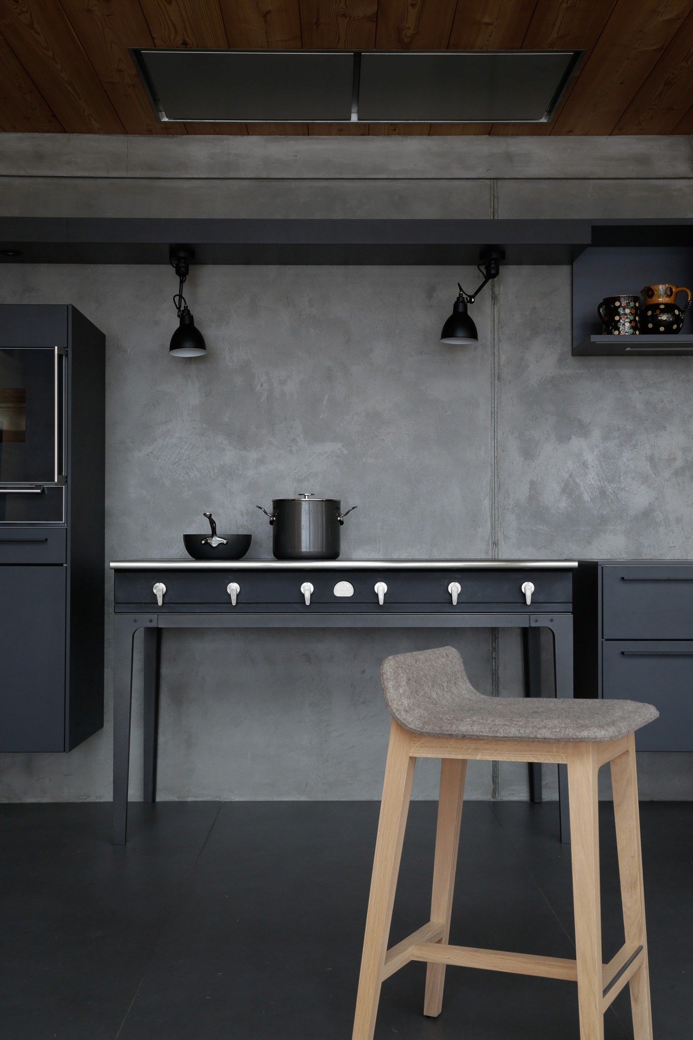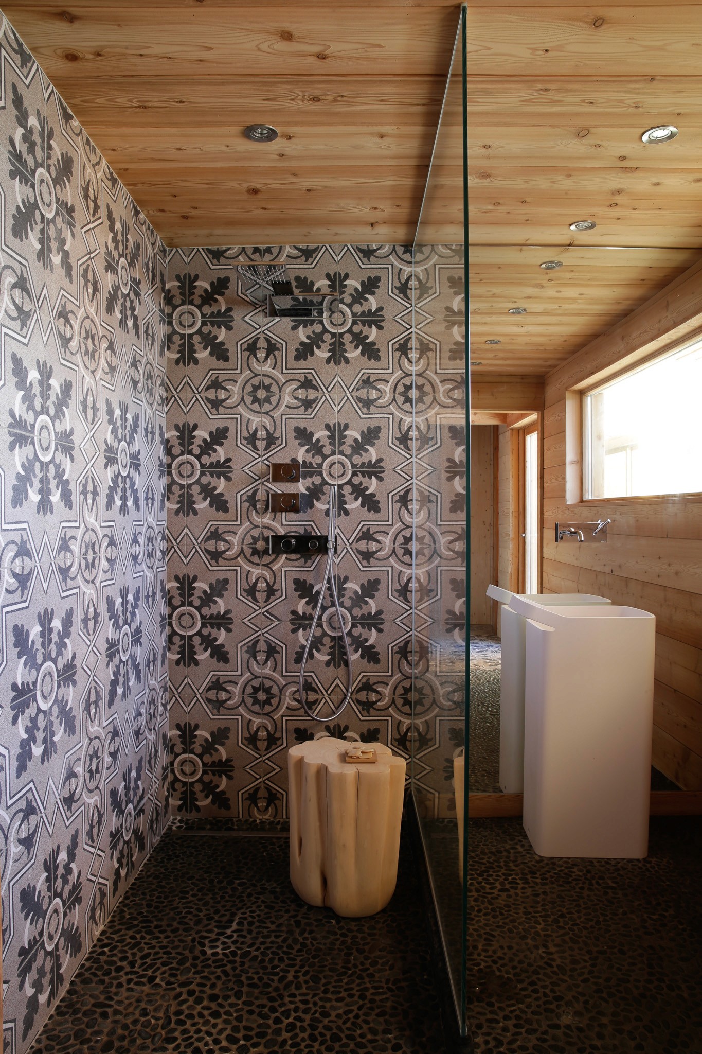 Le chalet abrite une seule chambre, conçue comme une « boîte en bois » avec sa propre salle de bain, apportant intimité et chaleur au coeur de ce volume ouvert. La cuisine ultra contemporaine, équipée d’une table La Cornue et d’un rôtissoire Flamberge, devient le centre névralgique du lieu — entre performance culinaire et esthétique sculpturale.