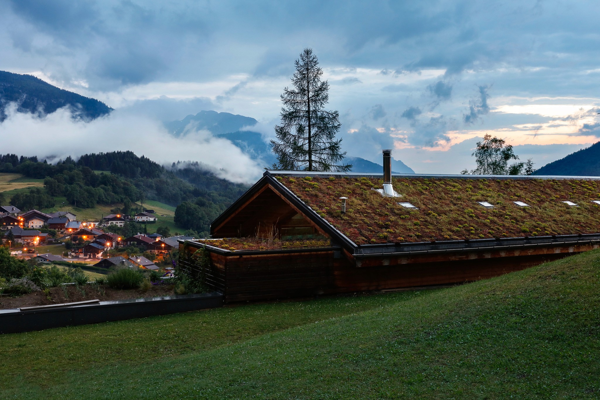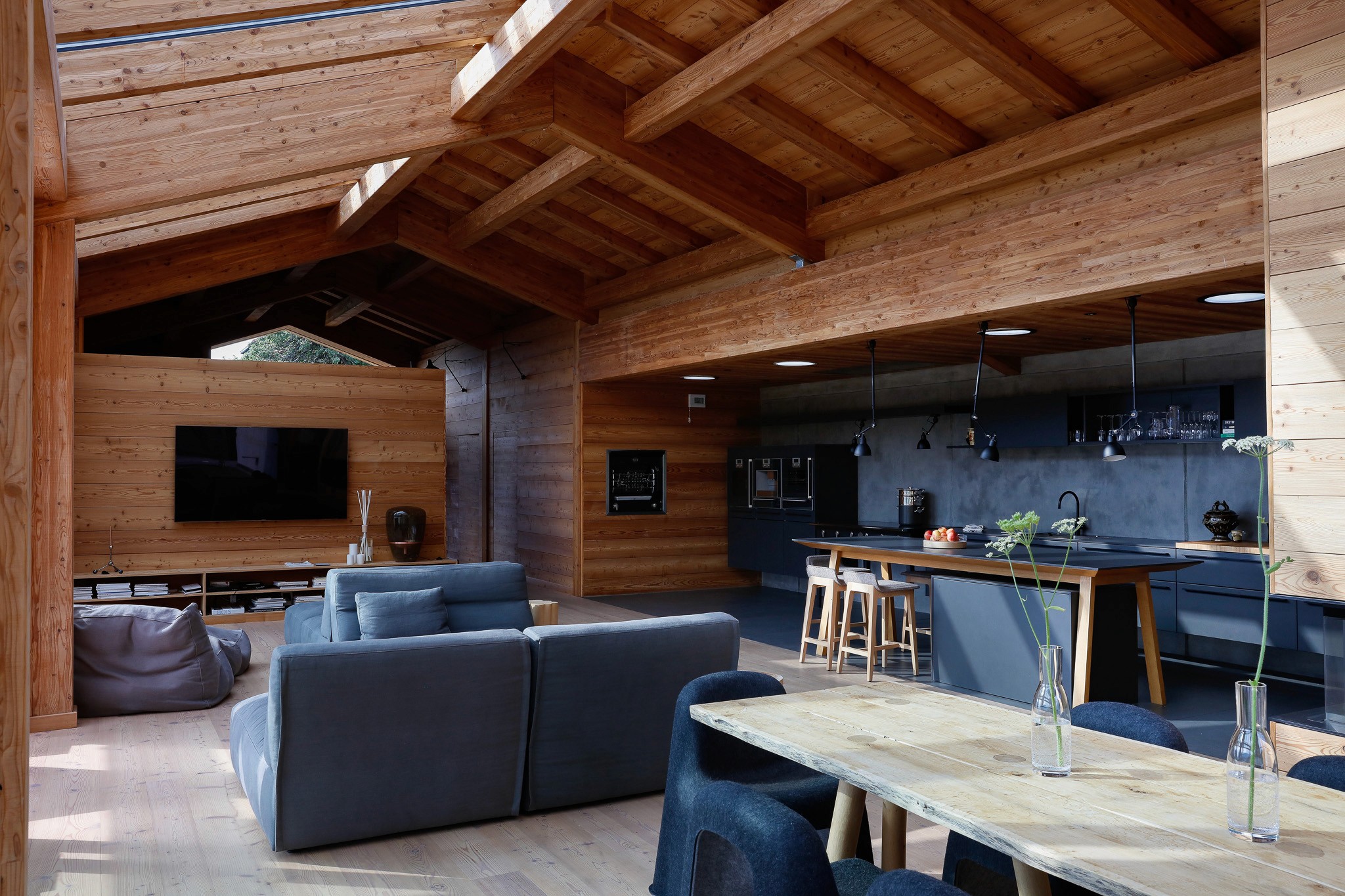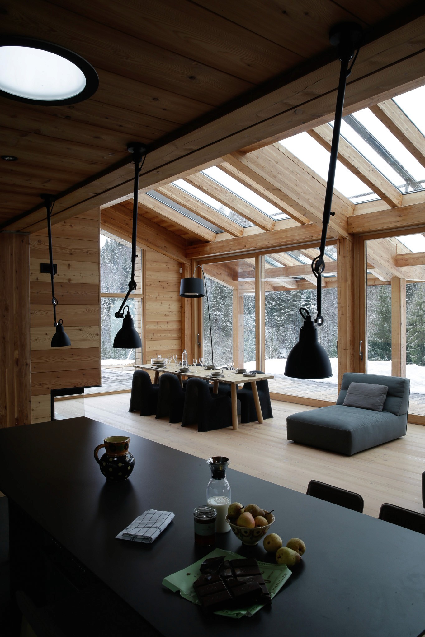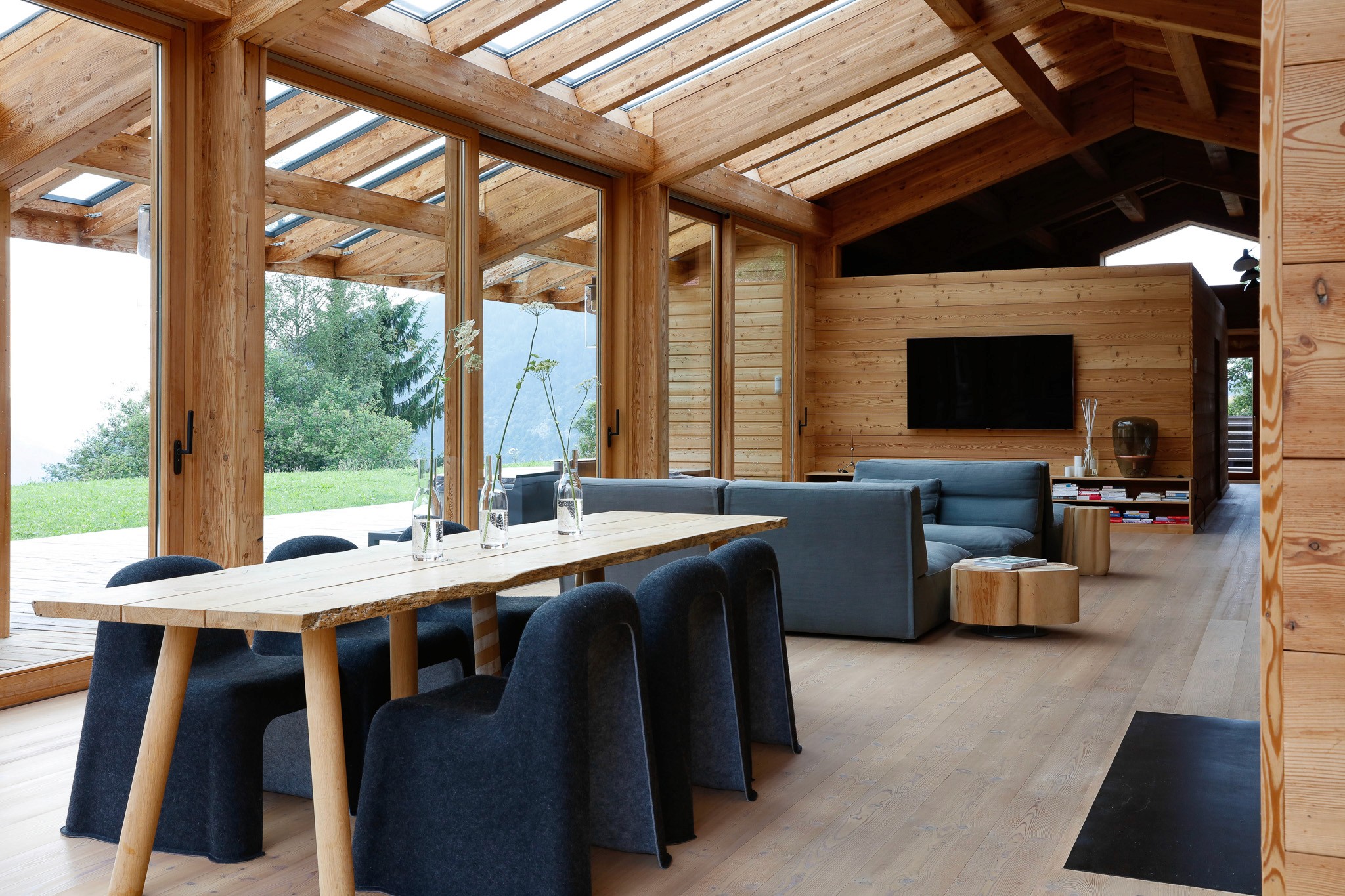Véritable objet architectural, ce volume en mélèze se distingue par son toit singulier, à moitié végétalisé et à moitié vitré, offrant à la fois ouverture sur la nature et lumière naturelle exceptionnelle. À l’intérieur, les espaces sont volontairement décloisonnés, pensés comme un lieu de vie fluide, baigné de lumière.