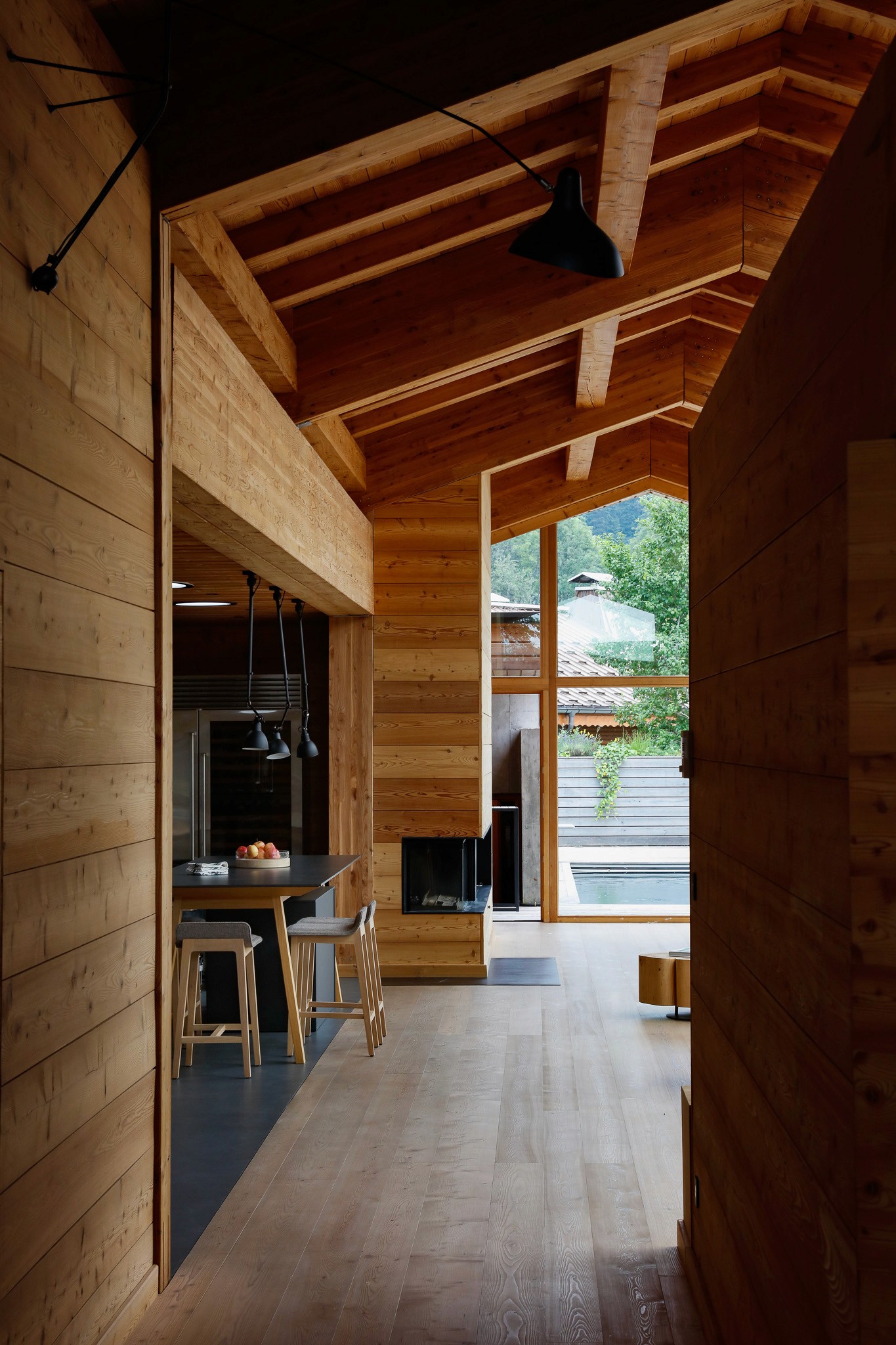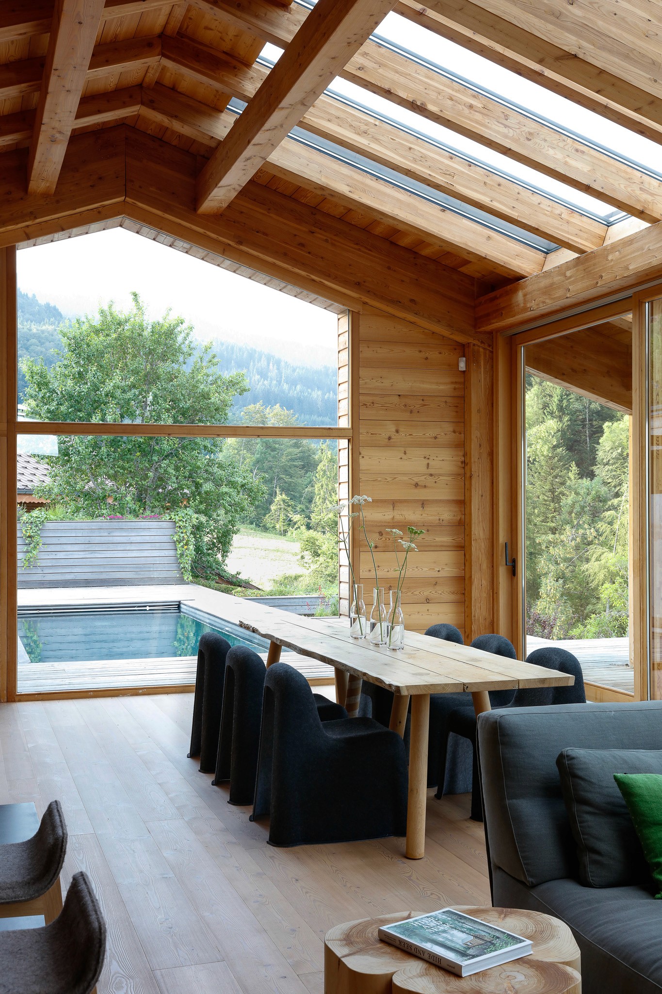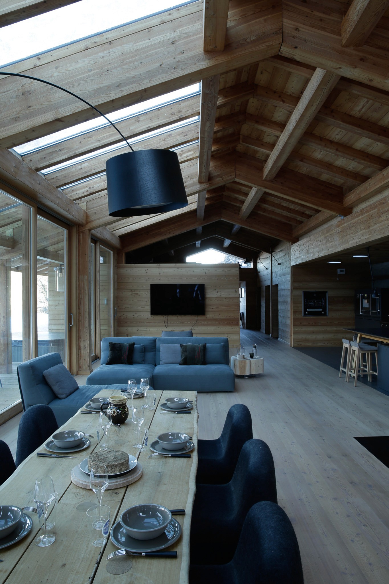 Véritable objet architectural, ce volume en mélèze se distingue par son toit singulier, à moitié végétalisé et à moitié vitré, offrant à la fois ouverture sur la nature et lumière naturelle exceptionnelle. À l’intérieur, les espaces sont volontairement décloisonnés, pensés comme un lieu de vie fluide, baigné de lumière.