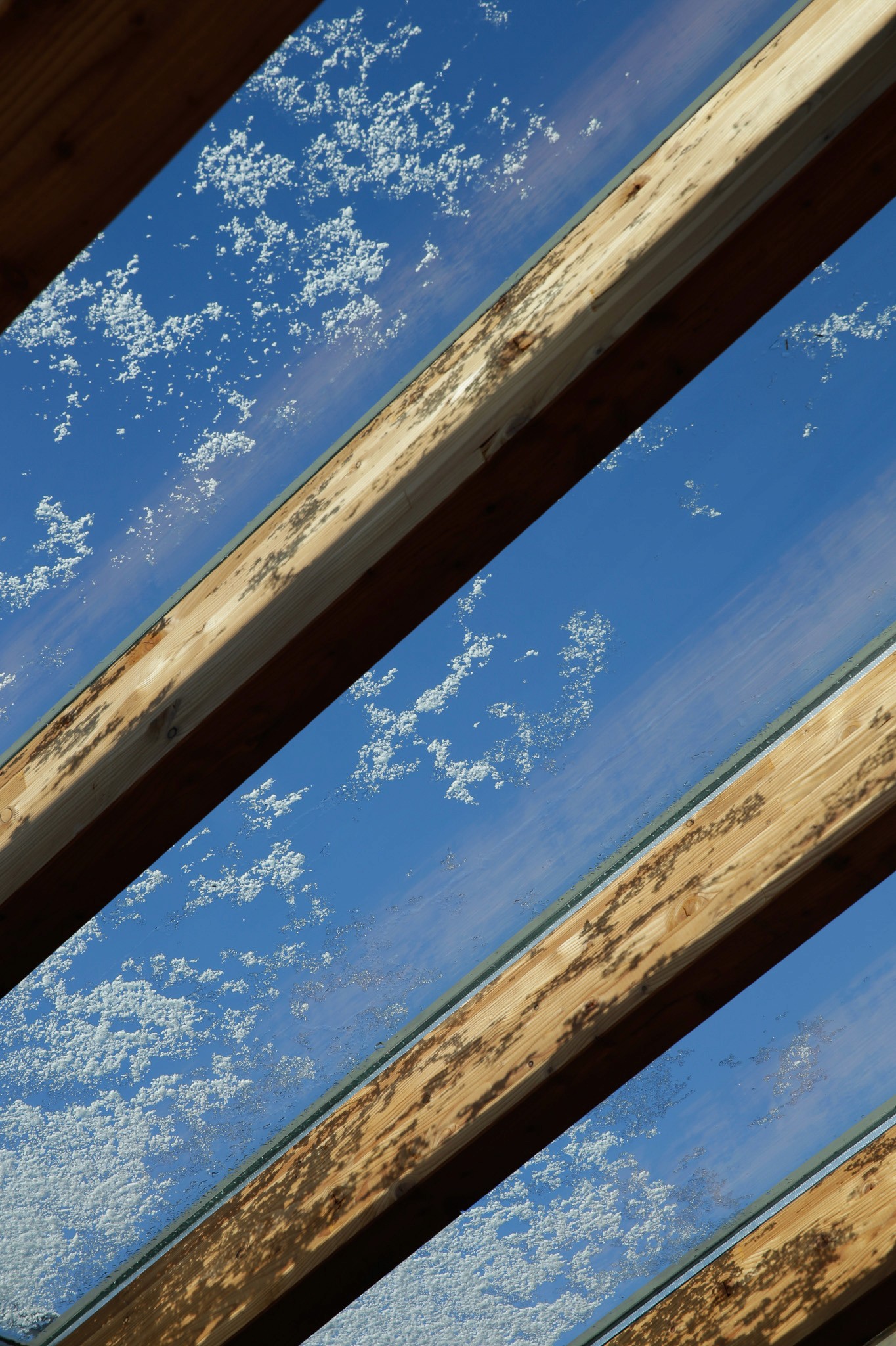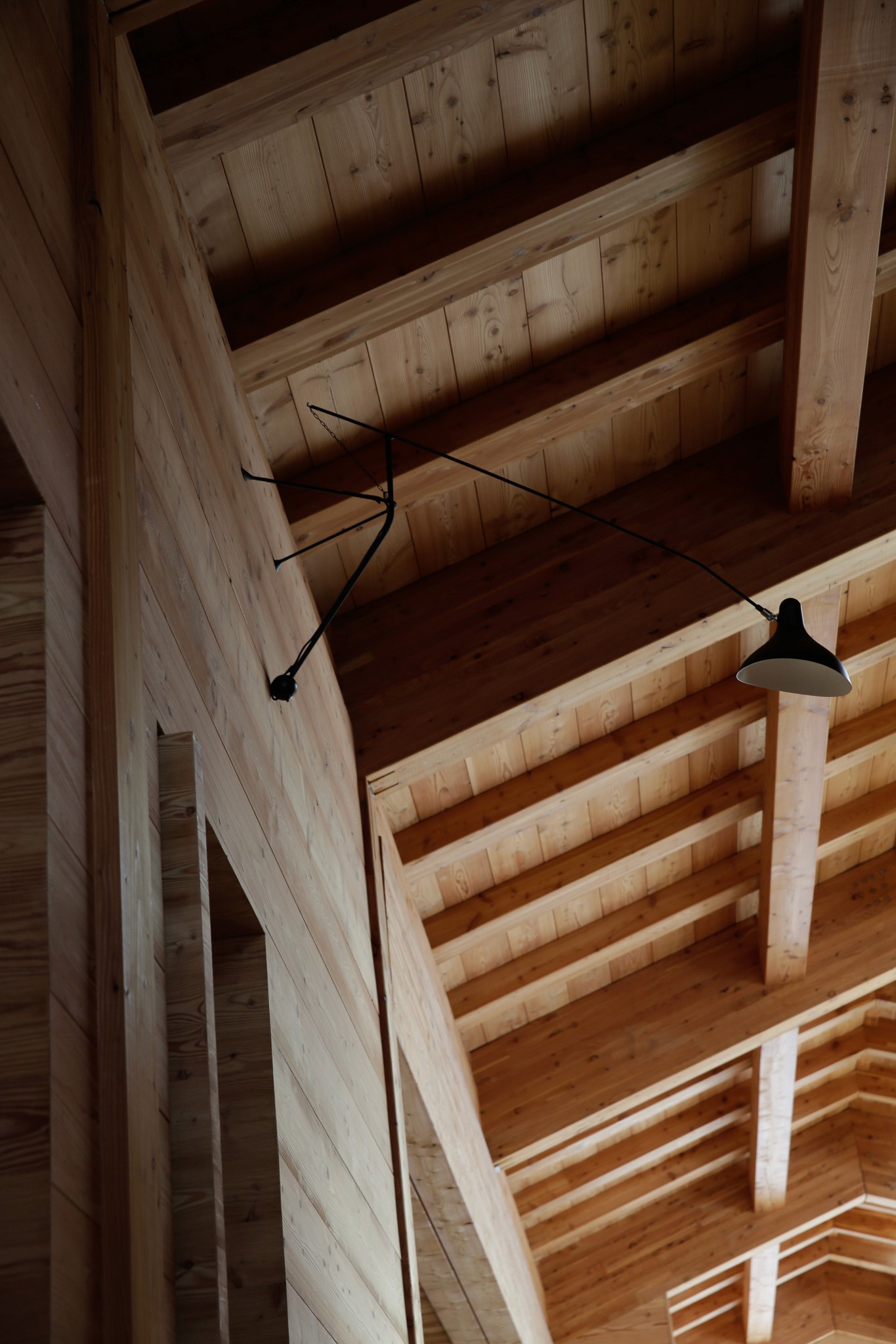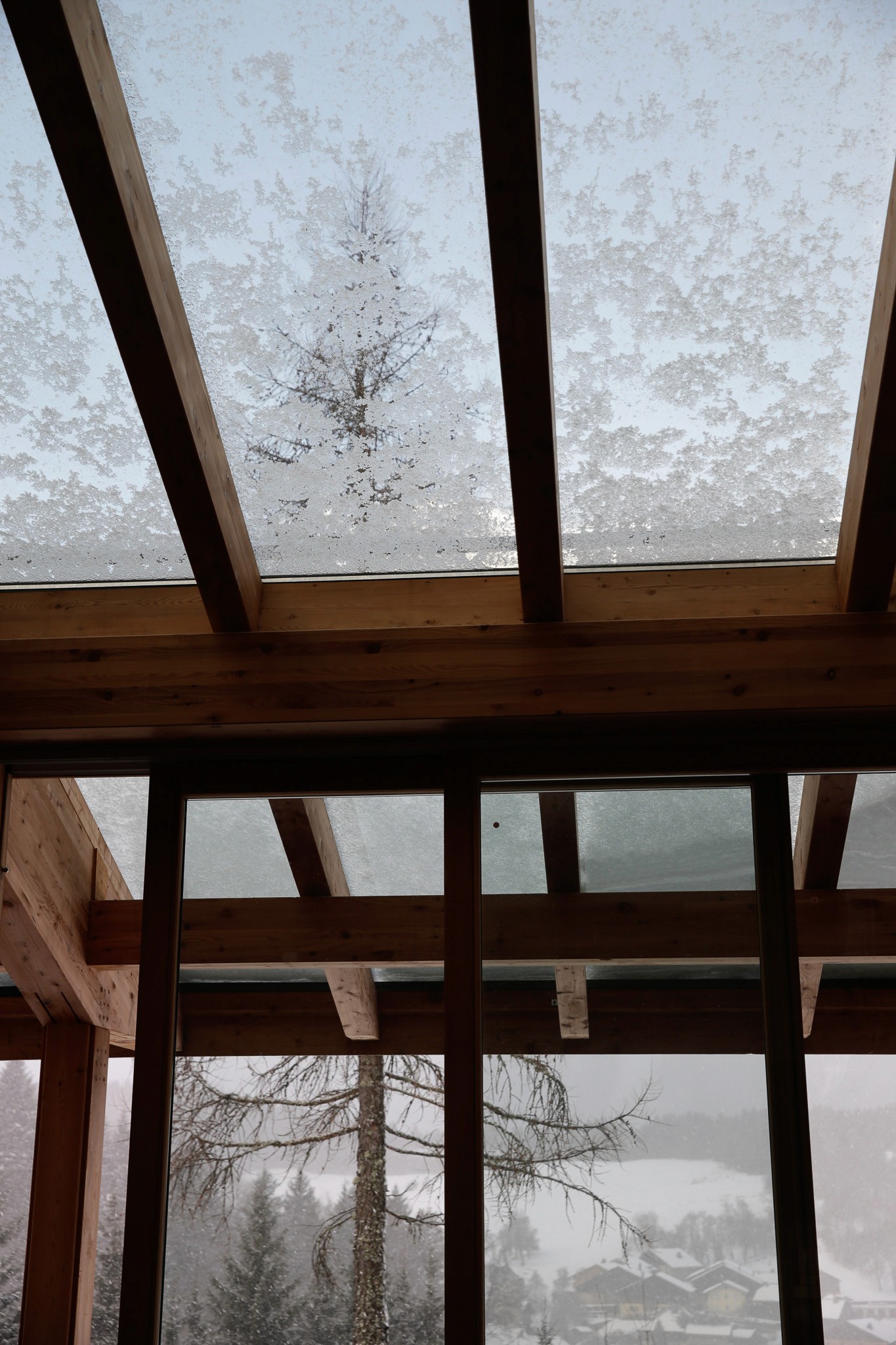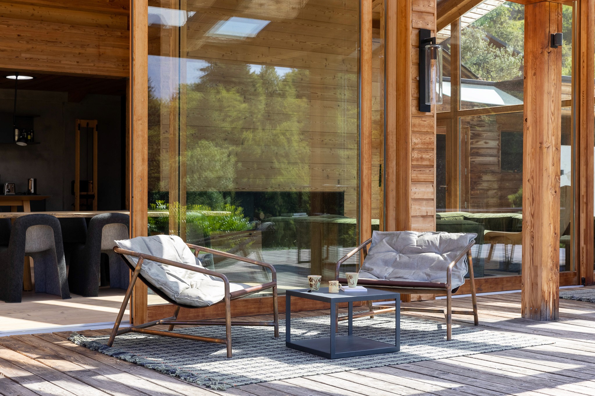 Véritable objet architectural, ce volume en mélèze se distingue par son toit singulier, à moitié végétalisé et à moitié vitré, offrant à la fois ouverture sur la nature et lumière naturelle exceptionnelle. À l’intérieur, les espaces sont volontairement décloisonnés, pensés comme un lieu de vie fluide, baigné de lumière.