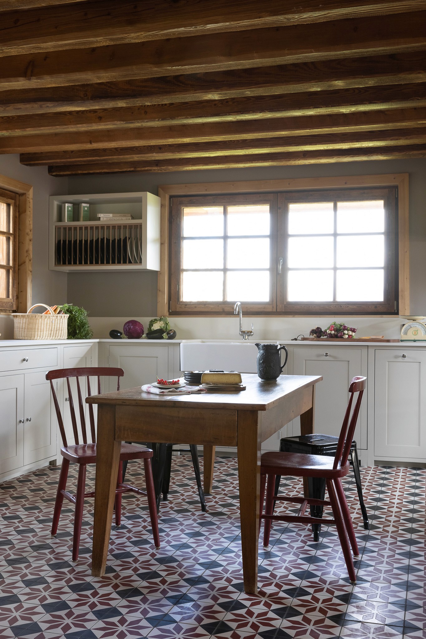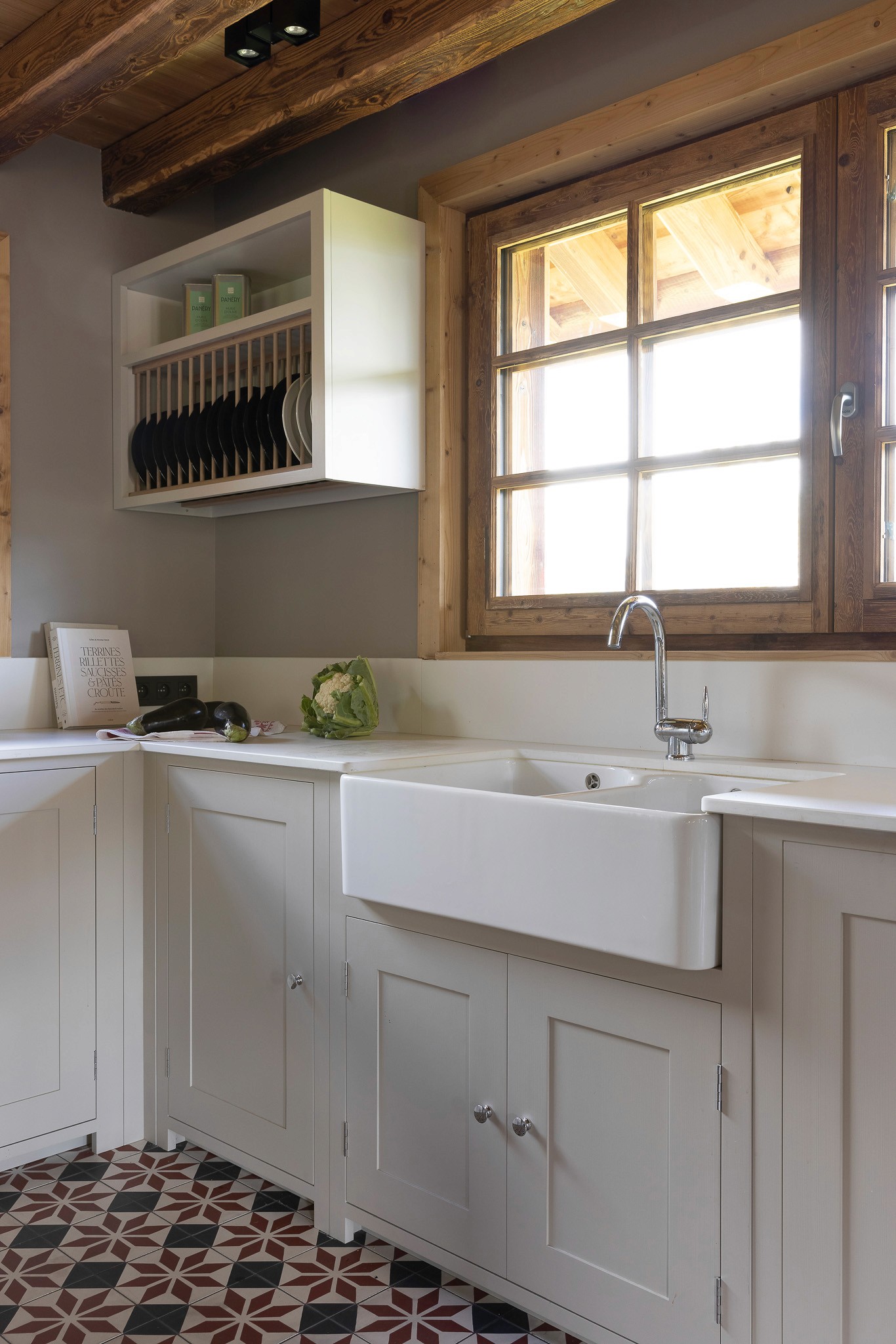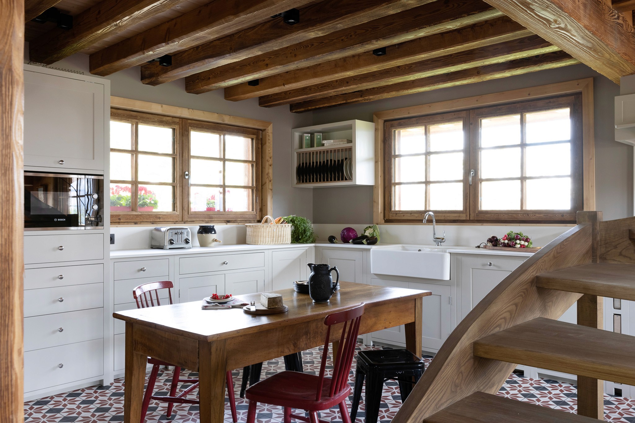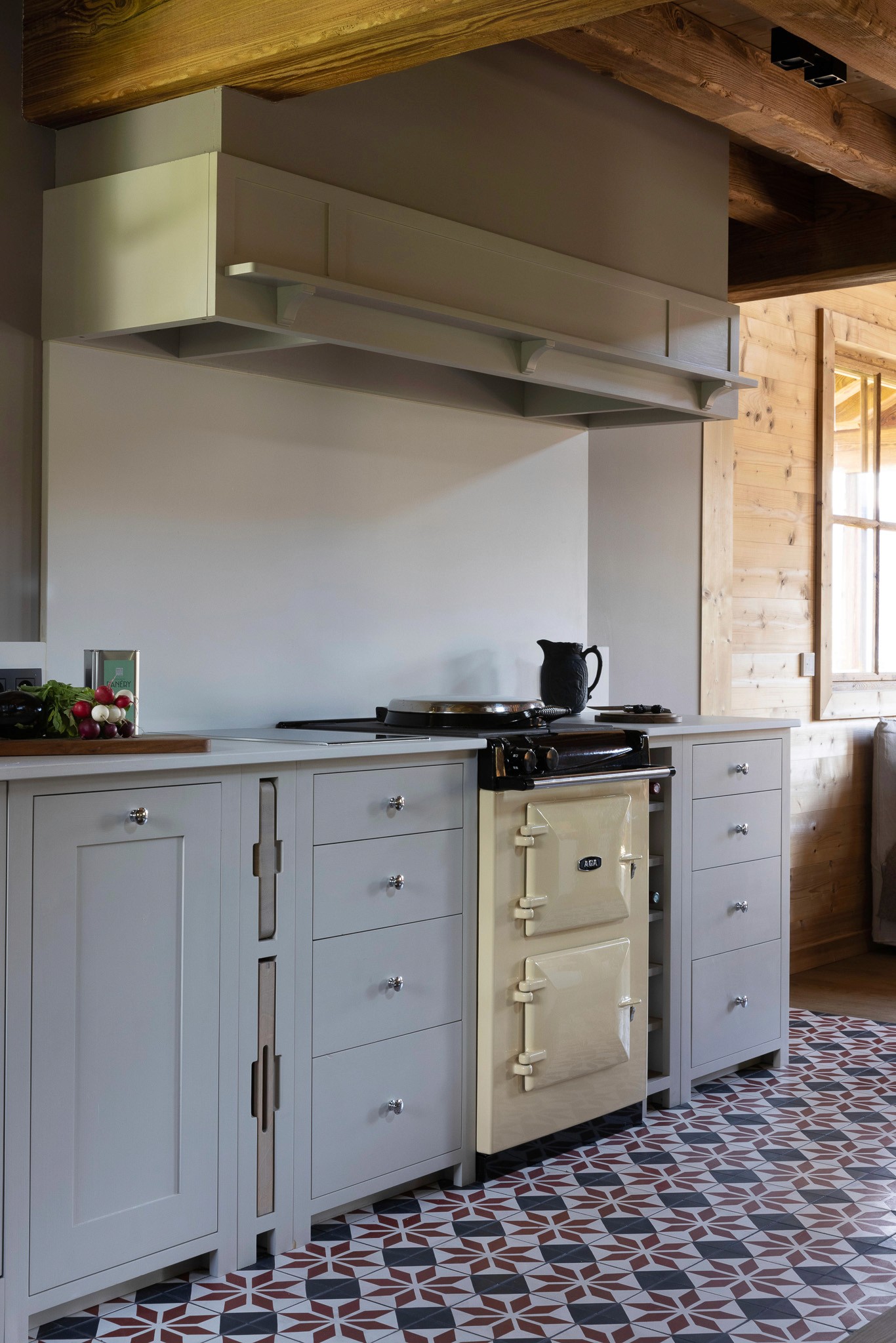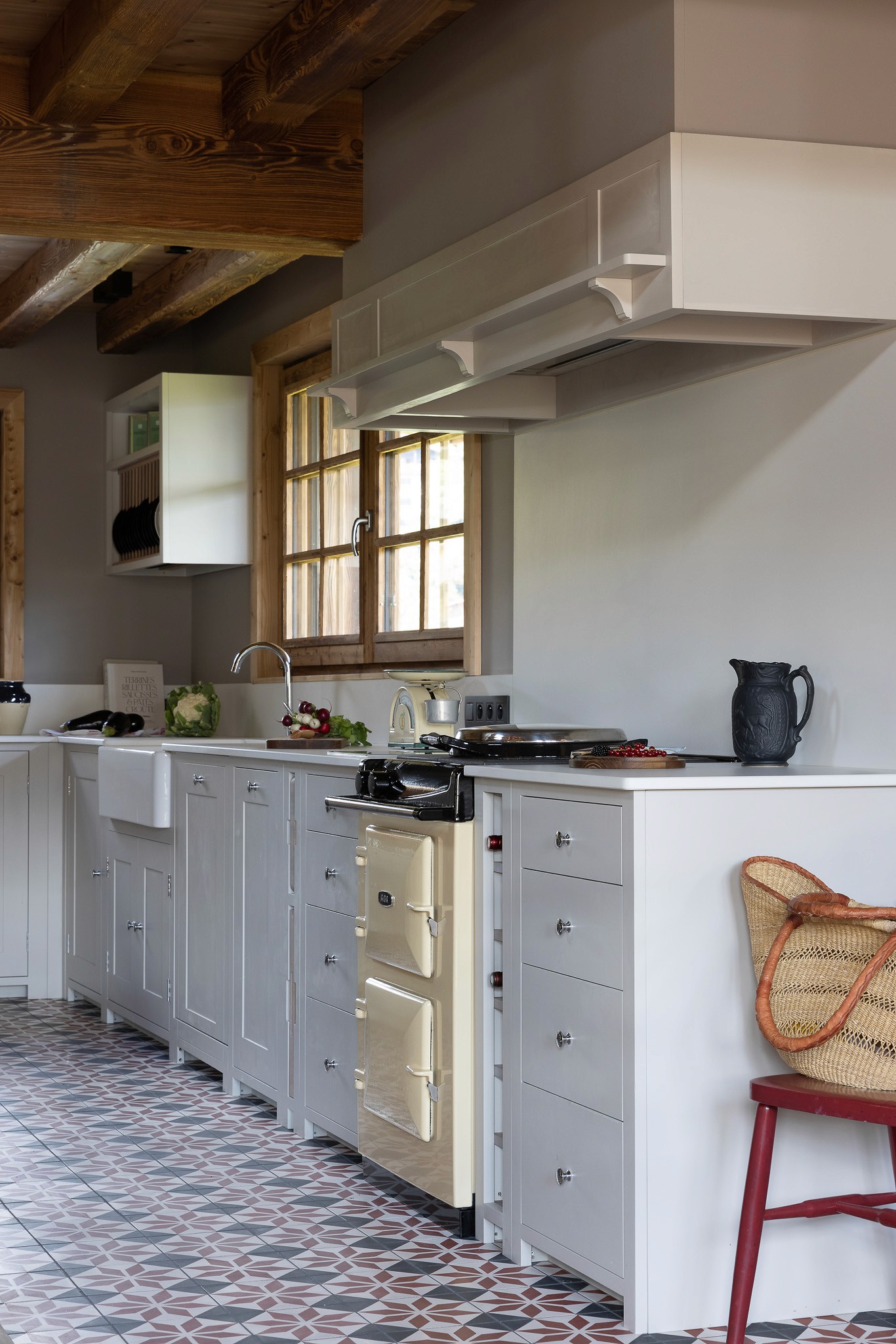 La cuisinière Aga crème et l’évier timbre ajoutent une touche d’authenticité à cette cuisine pensée pour recevoir. Le sol en carreaux de ciment renforce l’esprit traditionnel, tandis que le plafond en vieux bois, assez bas, est subtilement allégé par le choix de meubles clairs et d’un plan de travail en céramique blanche.