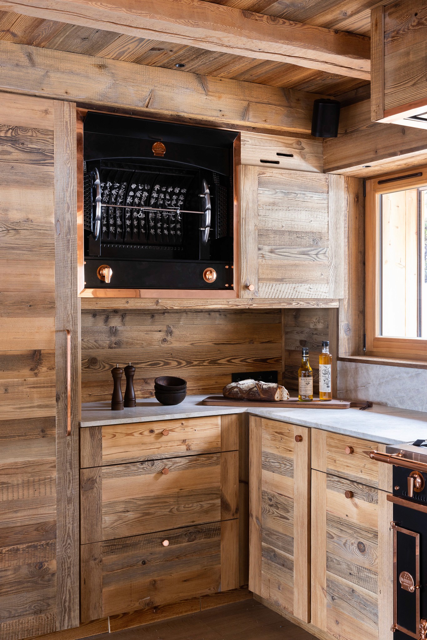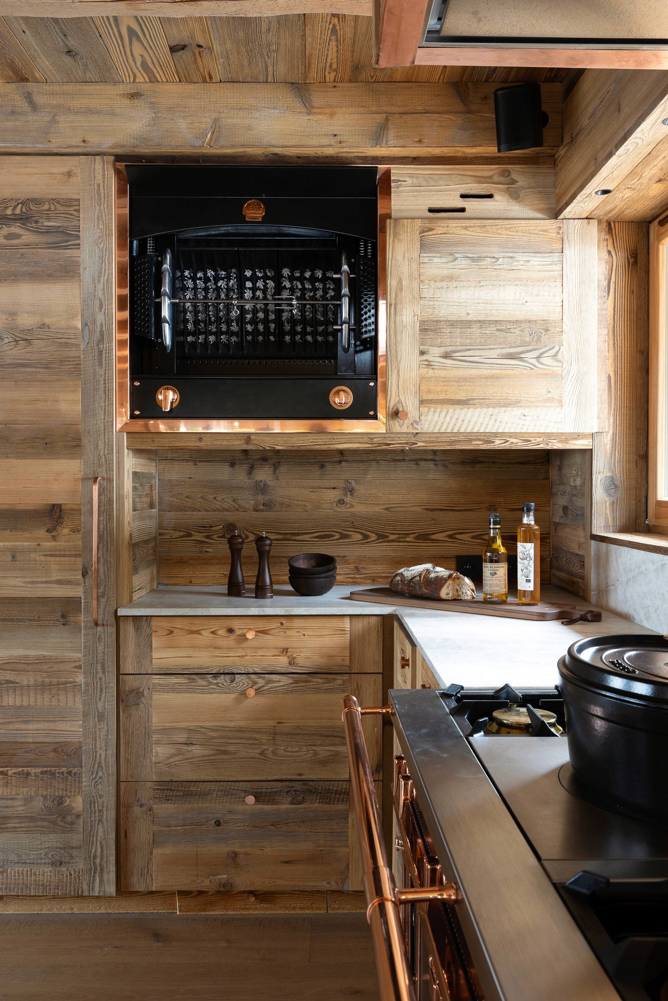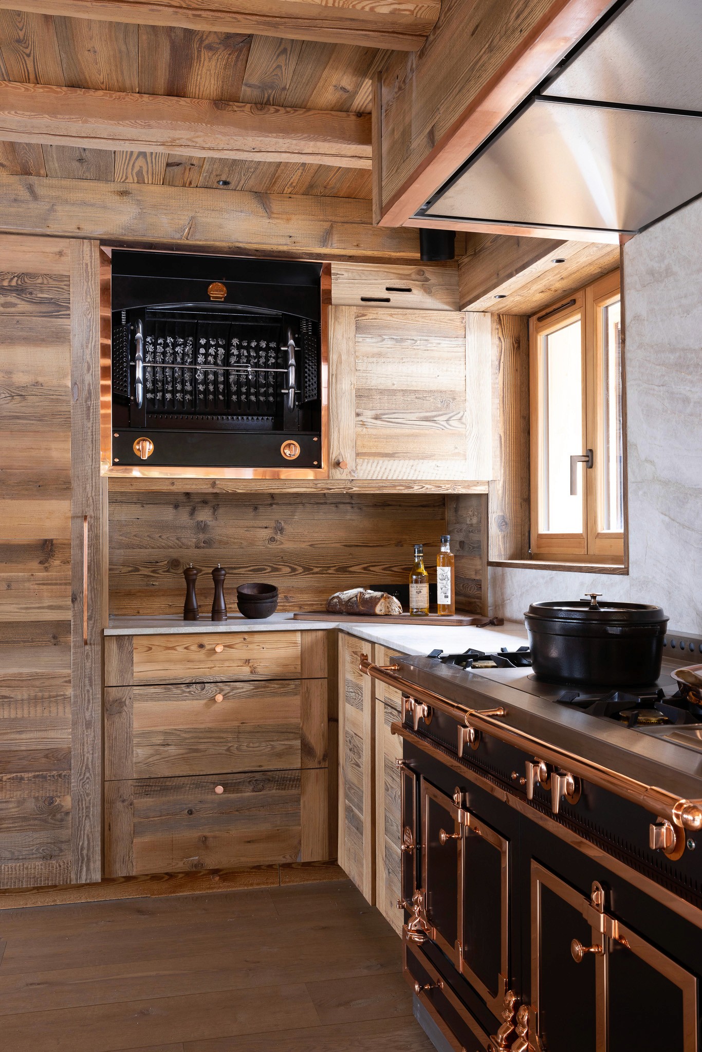 Dans le cadre de la rénovation complète d’un vieux chalet à Megève, cette cuisine sur mesure allie avec justesse le caractère du bois ancien à l’excellence des éléments La Cornue, avec un Château 150 et une Flamberge aux finitions exclusives.