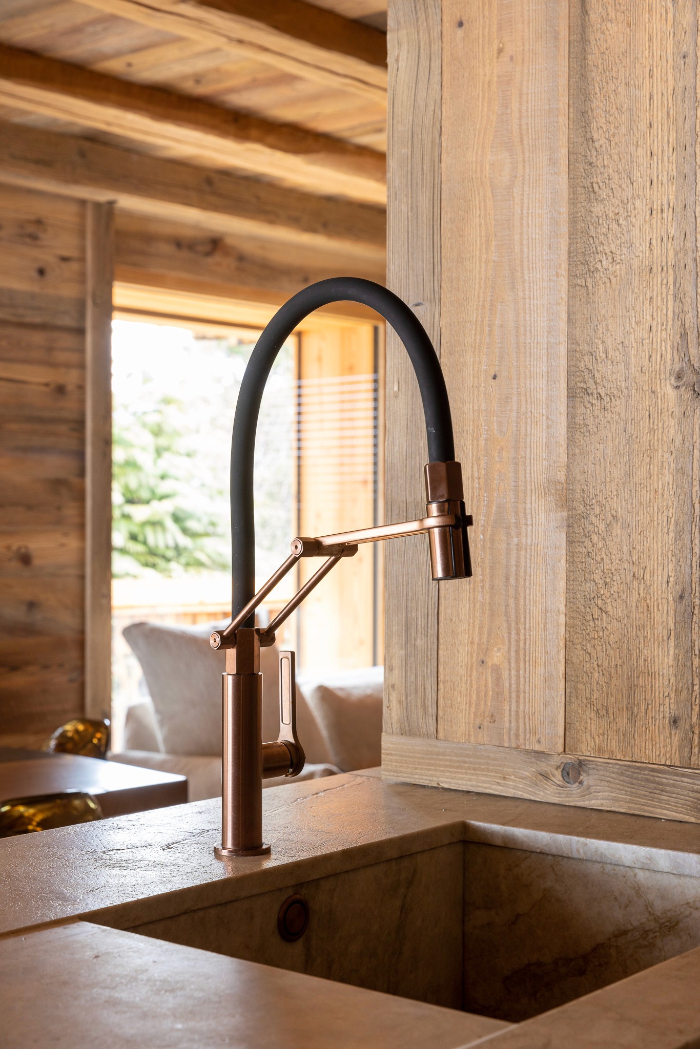 Dans le cadre de la rénovation complète d’un vieux chalet à Megève, cette cuisine sur mesure allie avec justesse le caractère du bois ancien à l’excellence des éléments La Cornue, avec un Château 150 et une Flamberge aux finitions exclusives. Le cuivre, travaillé par touches subtiles sur les poignées et le mitigeur, dialogue avec la pierre naturelle qui illumine l’ensemble. Une cuisine à la fois technique et raffinée, où chaque détail célèbre le charme alpin revisité et l’élégance assumée.