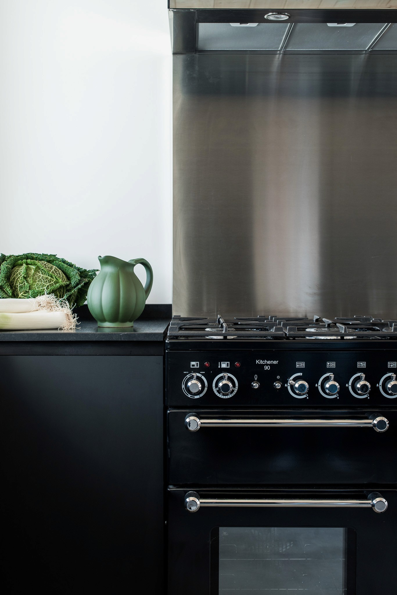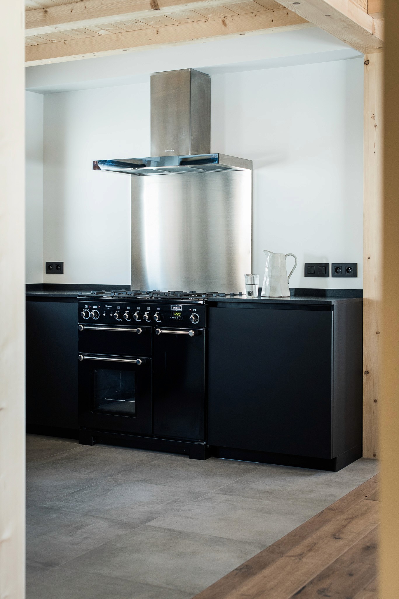 Le mobilier, en laque mate noire sans poignées, affirme une ligne minimaliste et contemporaine. Le plan de travail et la crédence sont en granit noir du Zimbabwe, apportant profondeur et raffinement. Un dosseret en inox a été ajouté derrière le piano, en écho aux éléments métalliques déjà présents : hotte, boutons de cuisson, manettes et mitigeur.