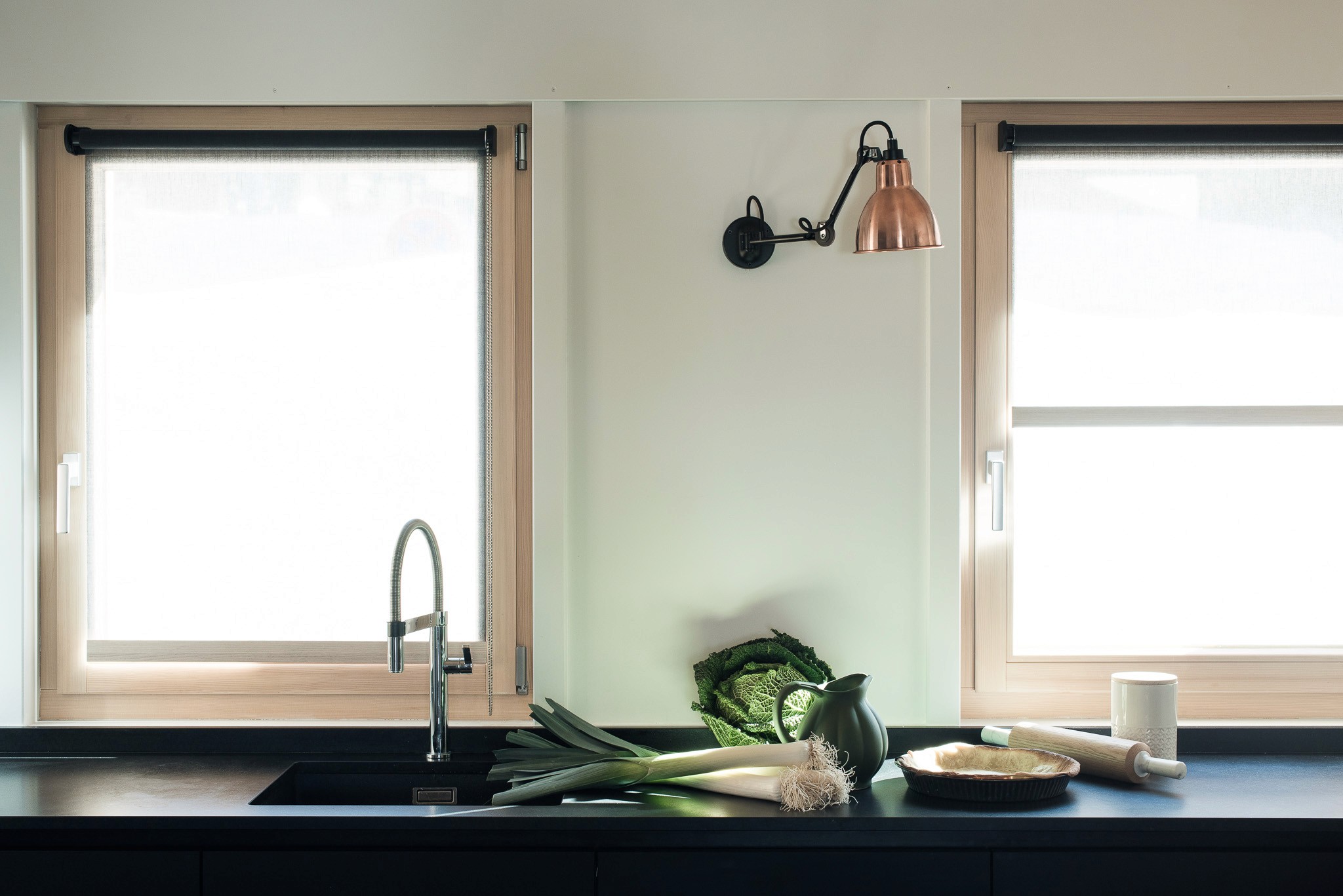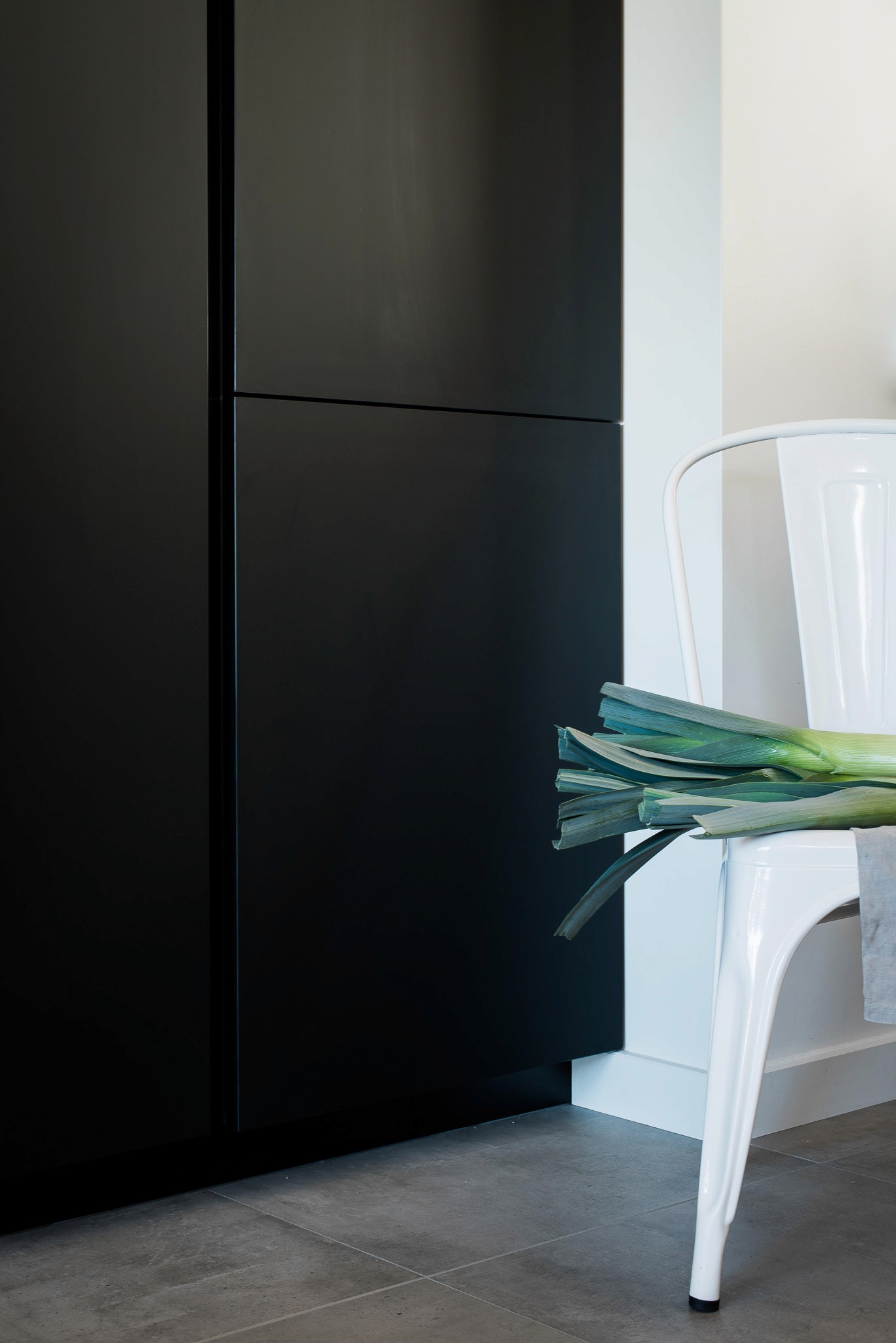 L’évier sous-plan en composite noir se fond presque entièrement dans l’ensemble, renforçant la pureté du dessin. L’uniformité des matériaux et la sobriété des lignes assurent à cette cuisine une lecture fluide, nette et intemporelle.