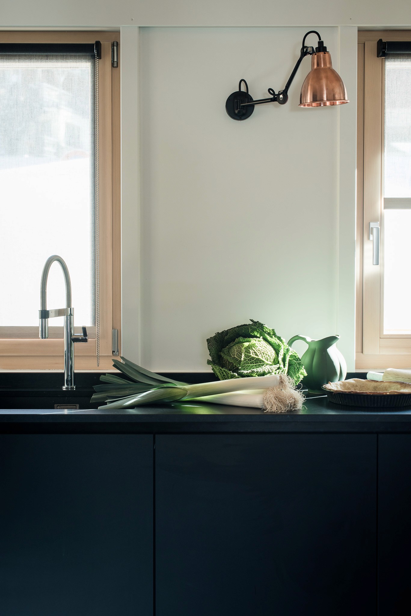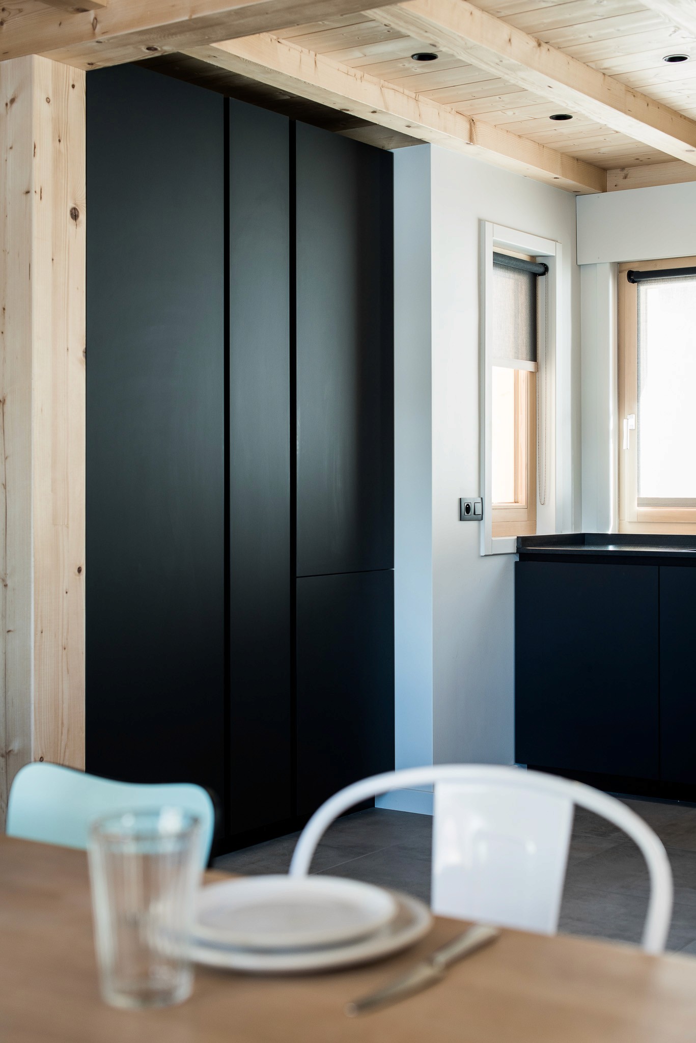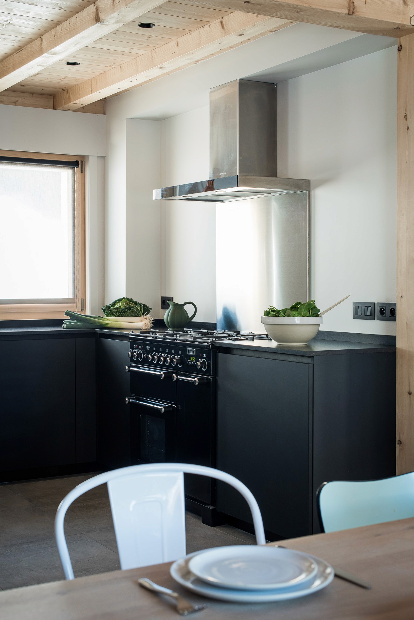Dans ce chalet résolument contemporain, la cuisine s’inscrit avec élégance dans une esthétique sobre et épurée.