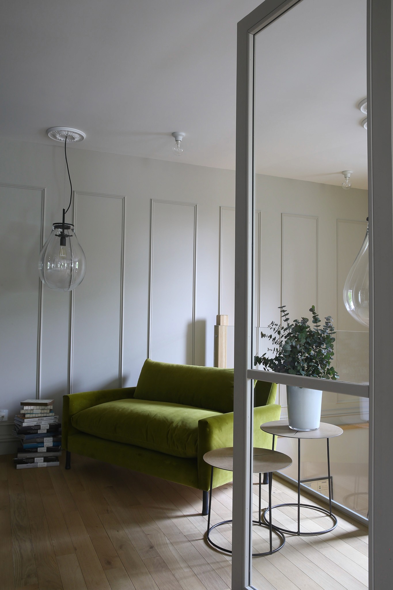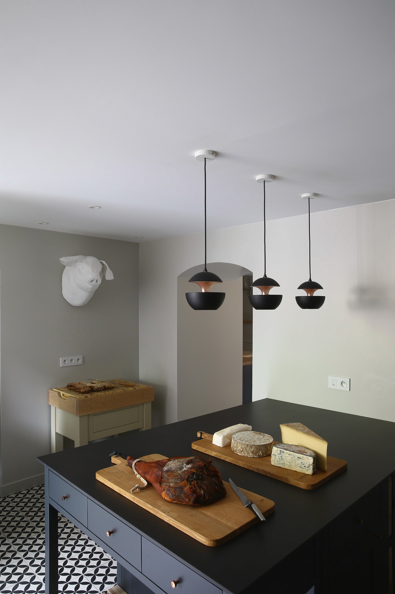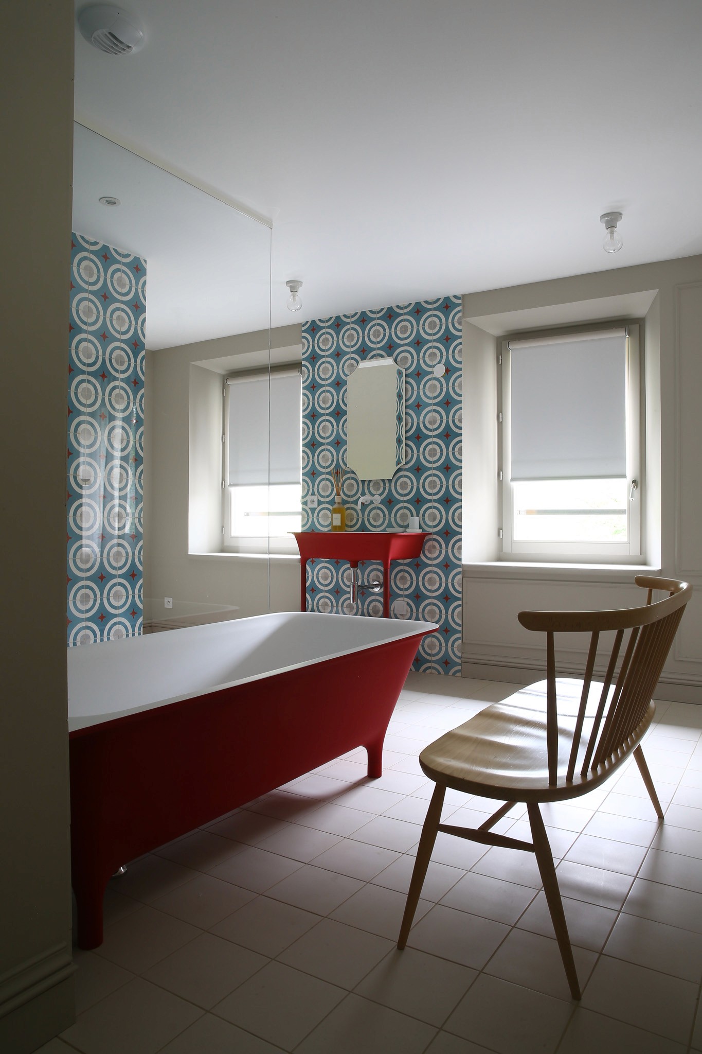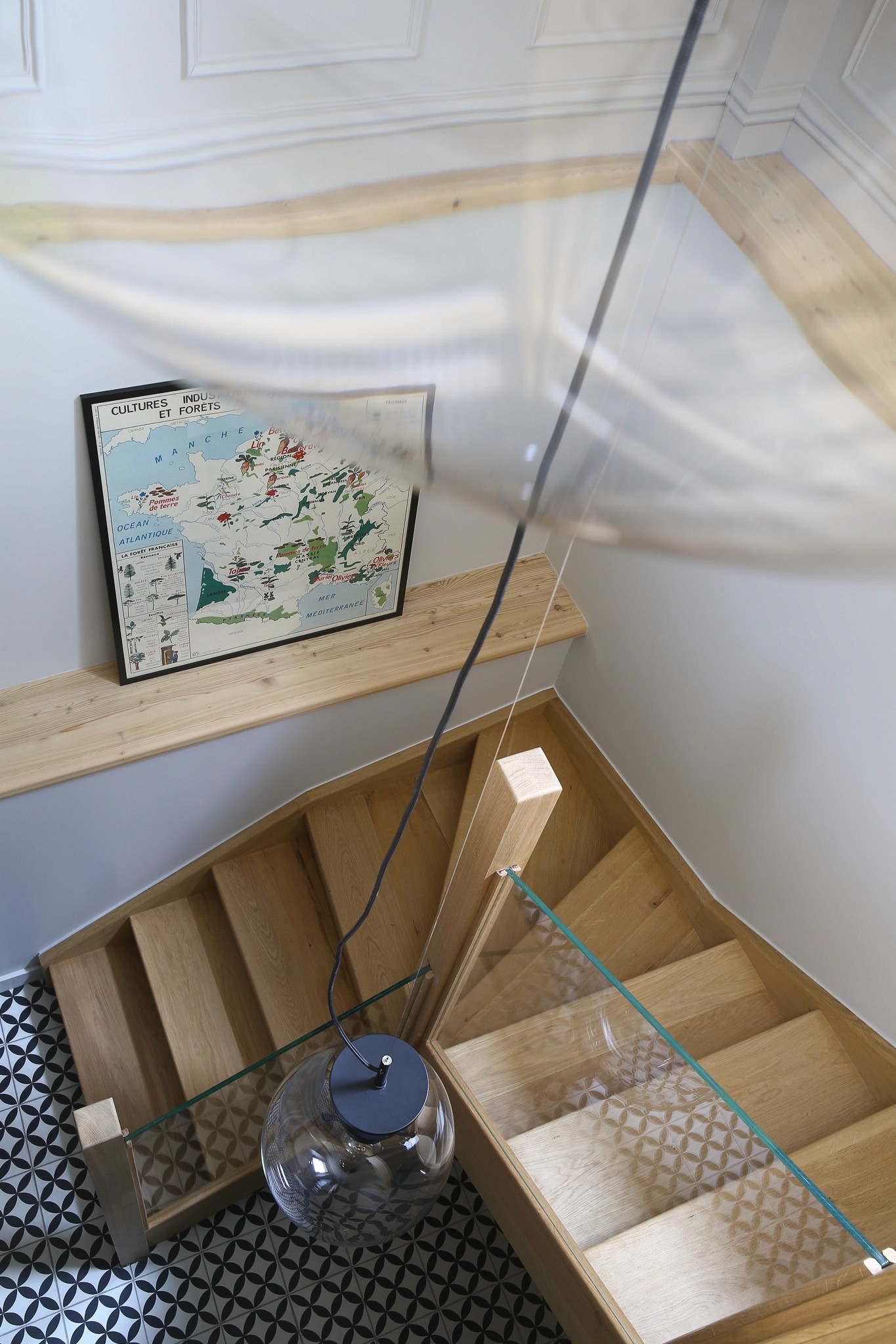 L’aménagement intérieur mêle avec soin matériaux nobles — parquet massif, émaux de Briare, carreaux de ciment — et éléments décoratifs authentiques comme les moulures restaurées, qui renforcent le charme d’antan. L’ambiance douce et poétique, pensée comme une maison de famille, invite à la convivialité et au confort.