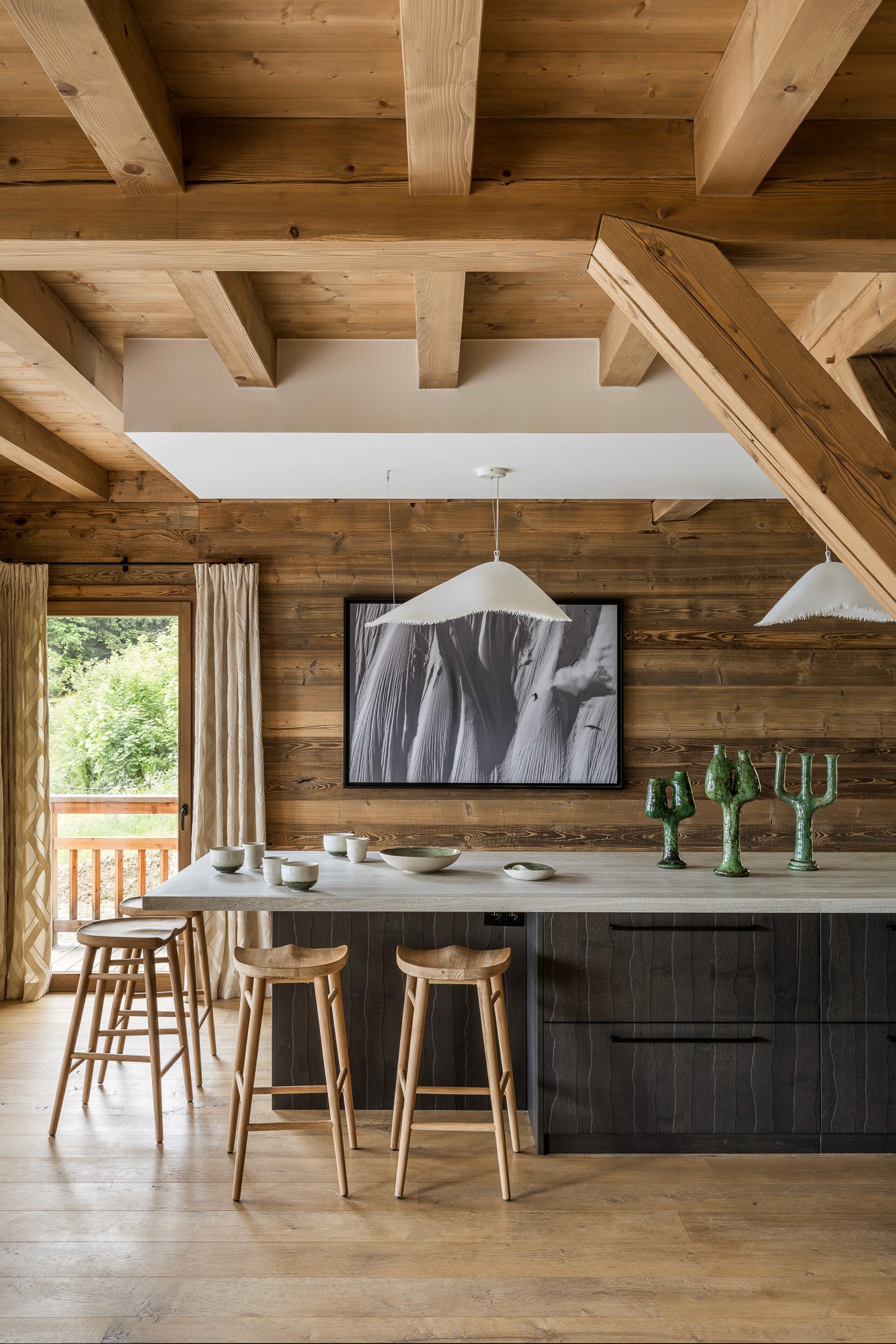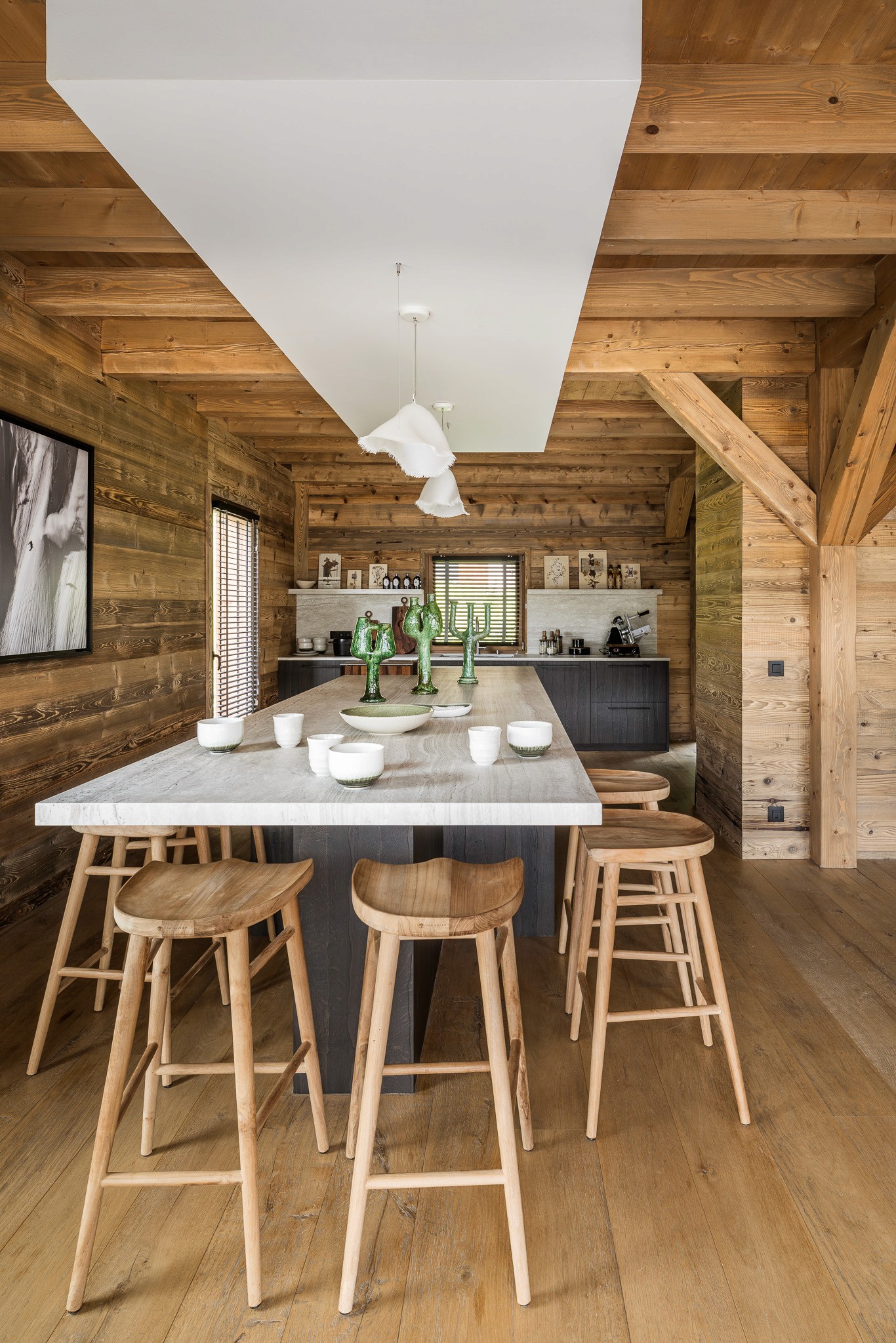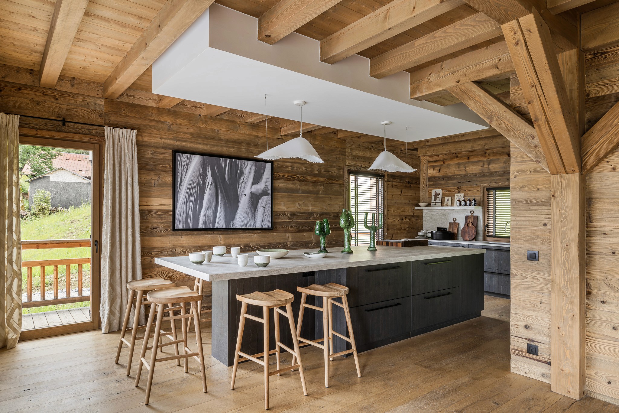 Au cœur de l’espace, un îlot monumental invite à la convivialité et devient le point de rencontre du chalet. Chaque détail a été pensé pour allier esthétique, fonctionnalité et authenticité alpine.