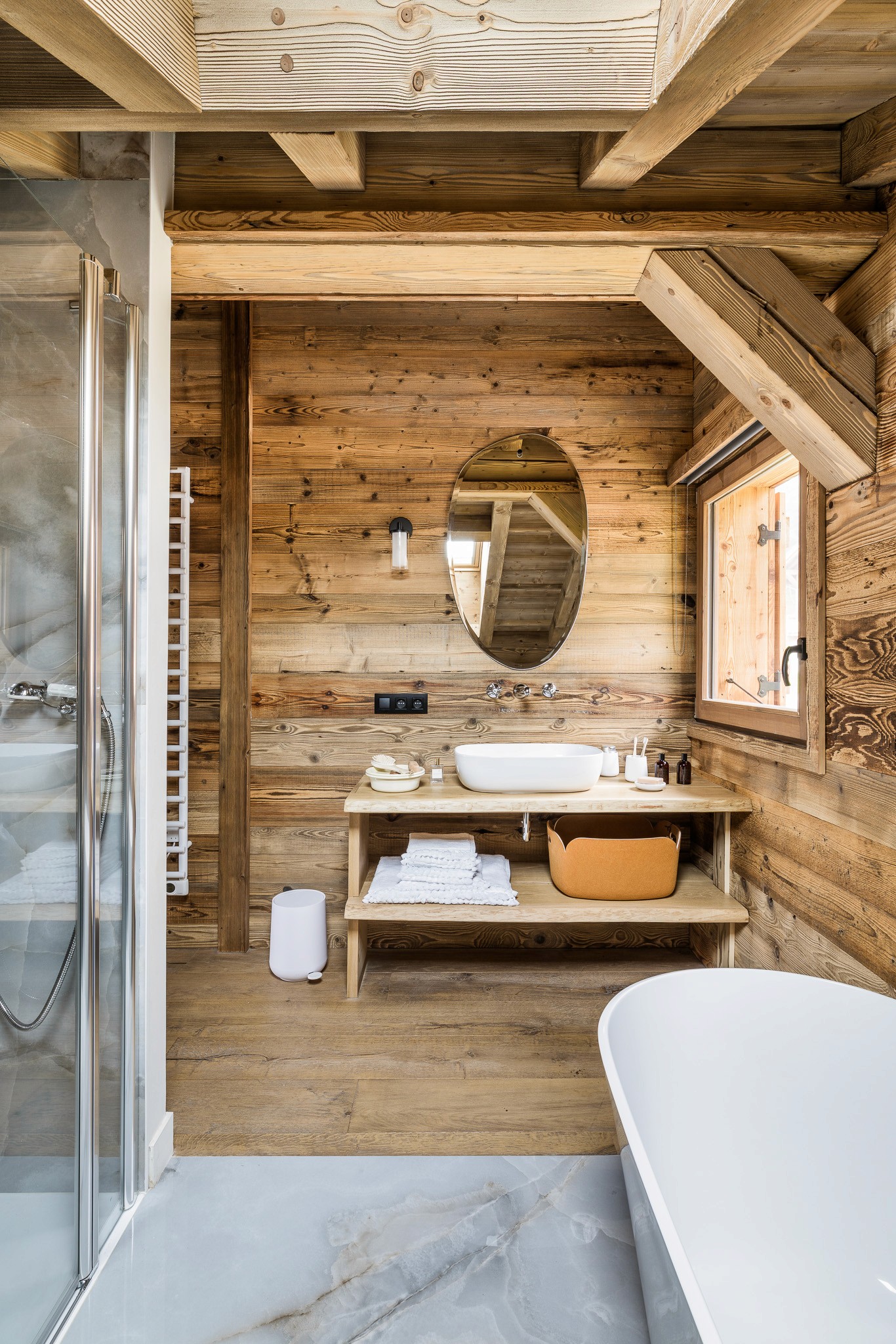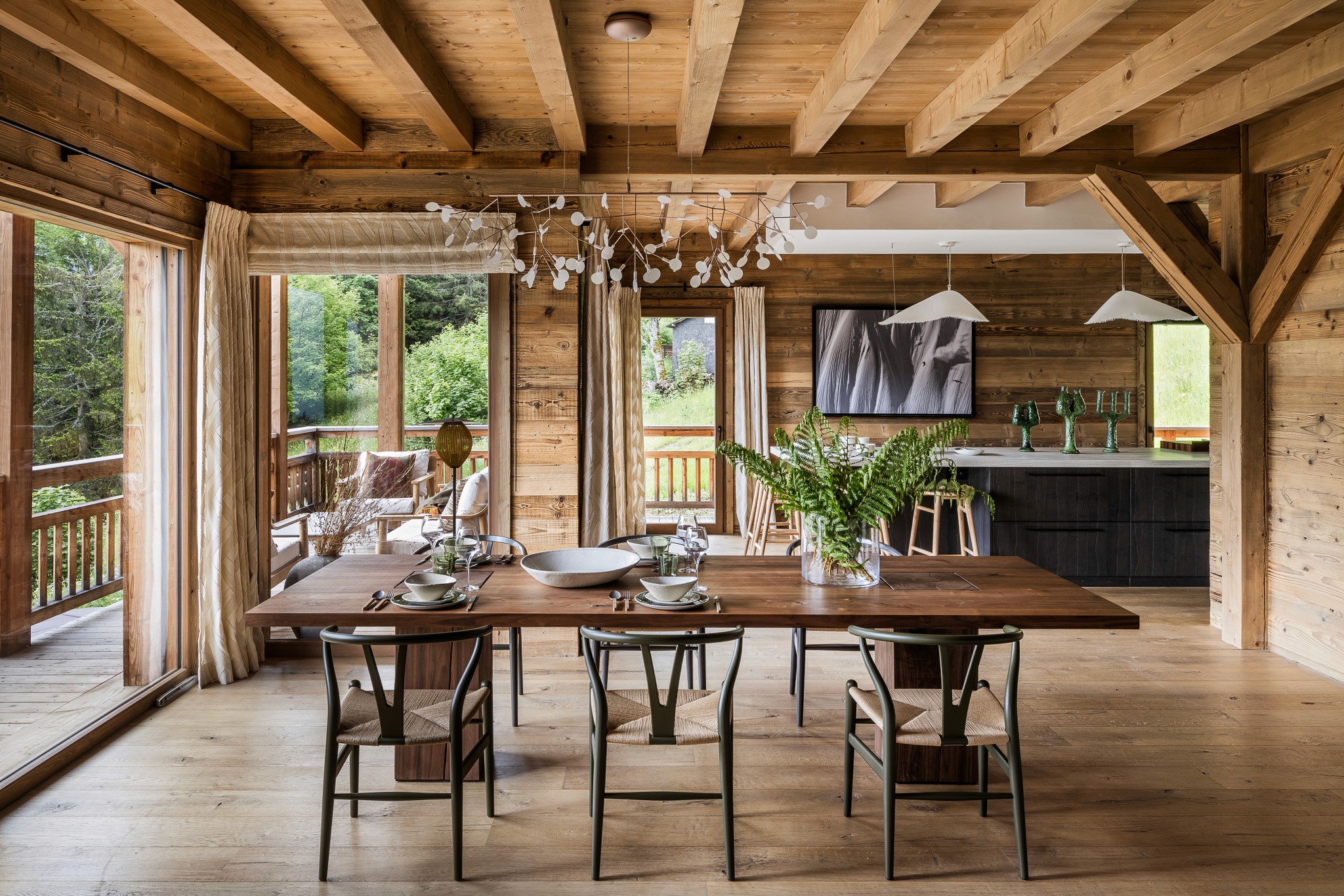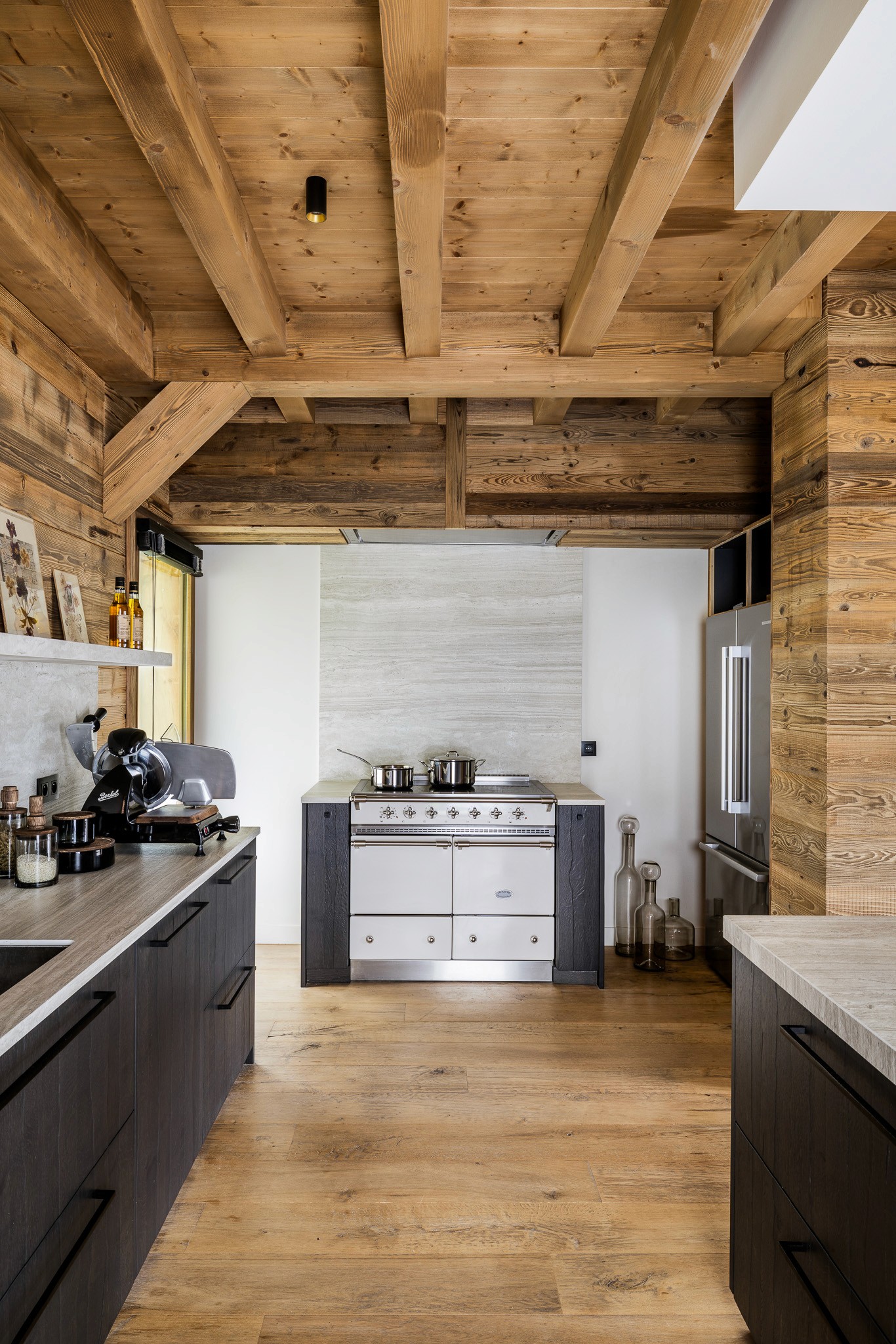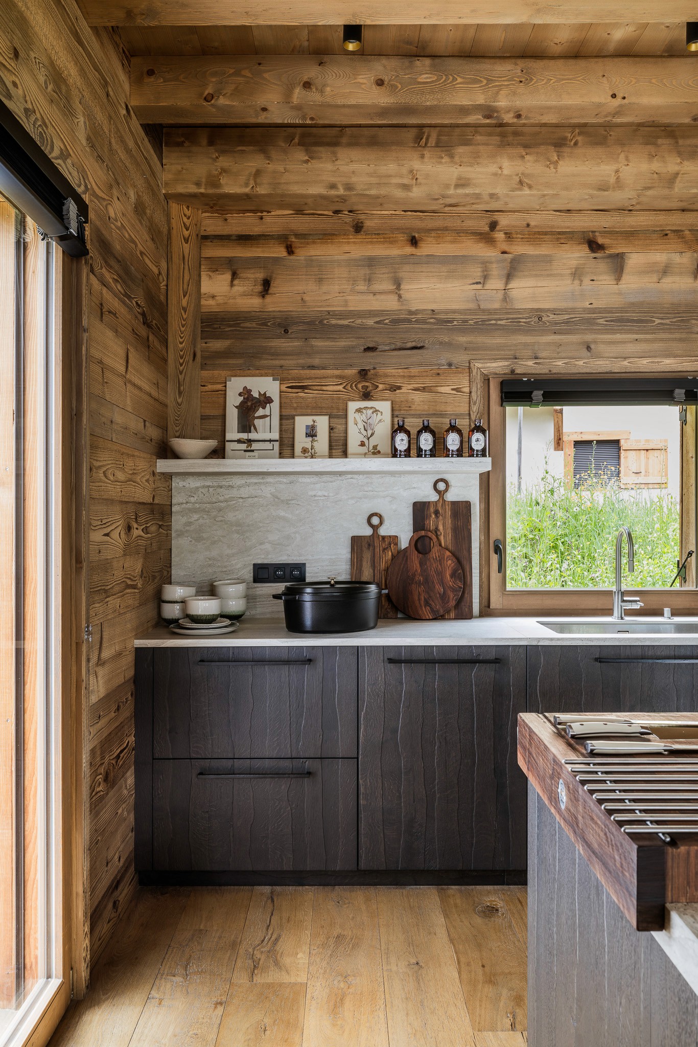 Au cœur de l’espace, un îlot monumental invite à la convivialité et devient le point de rencontre du chalet. Chaque détail a été pensé pour allier esthétique, fonctionnalité et authenticité alpine.