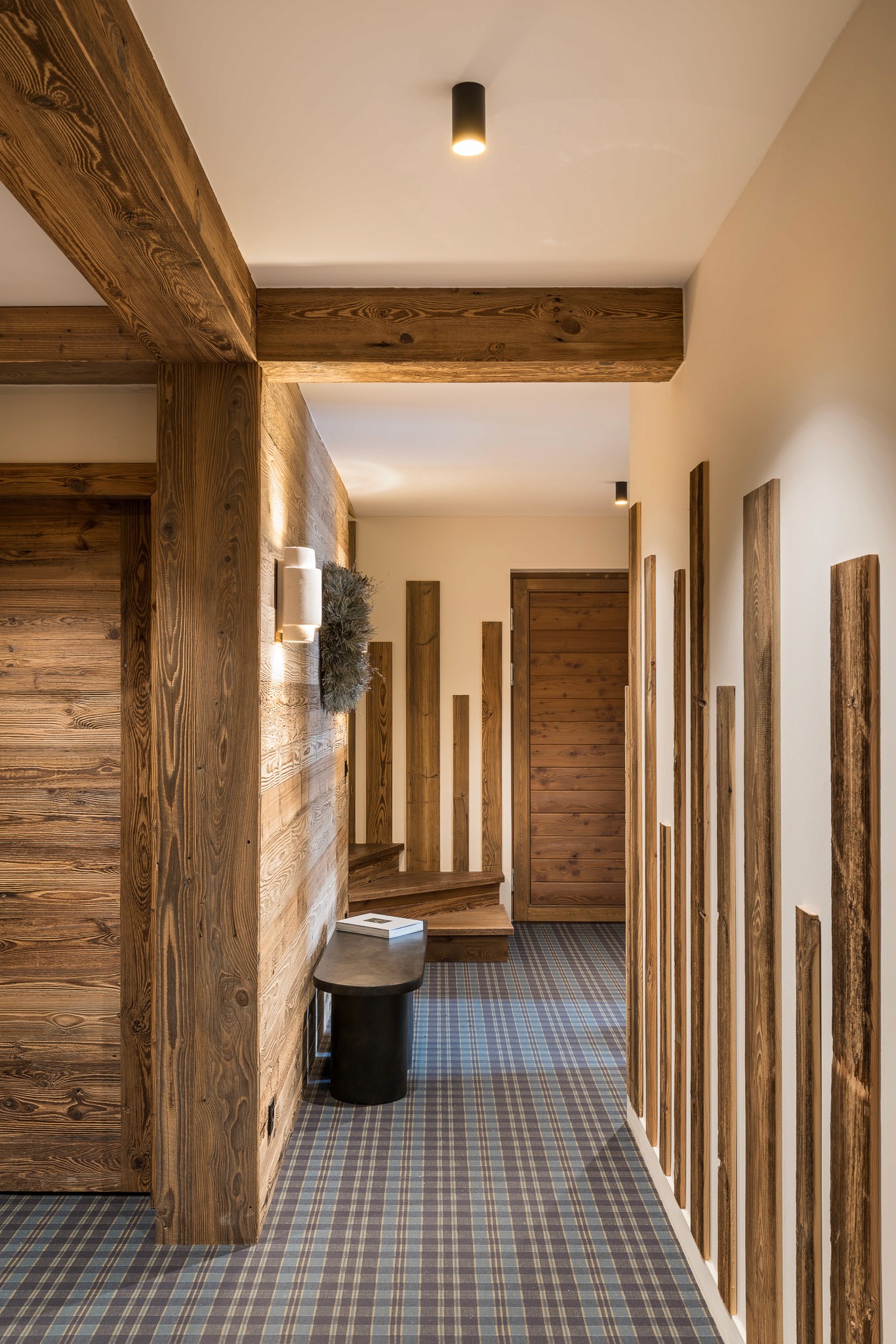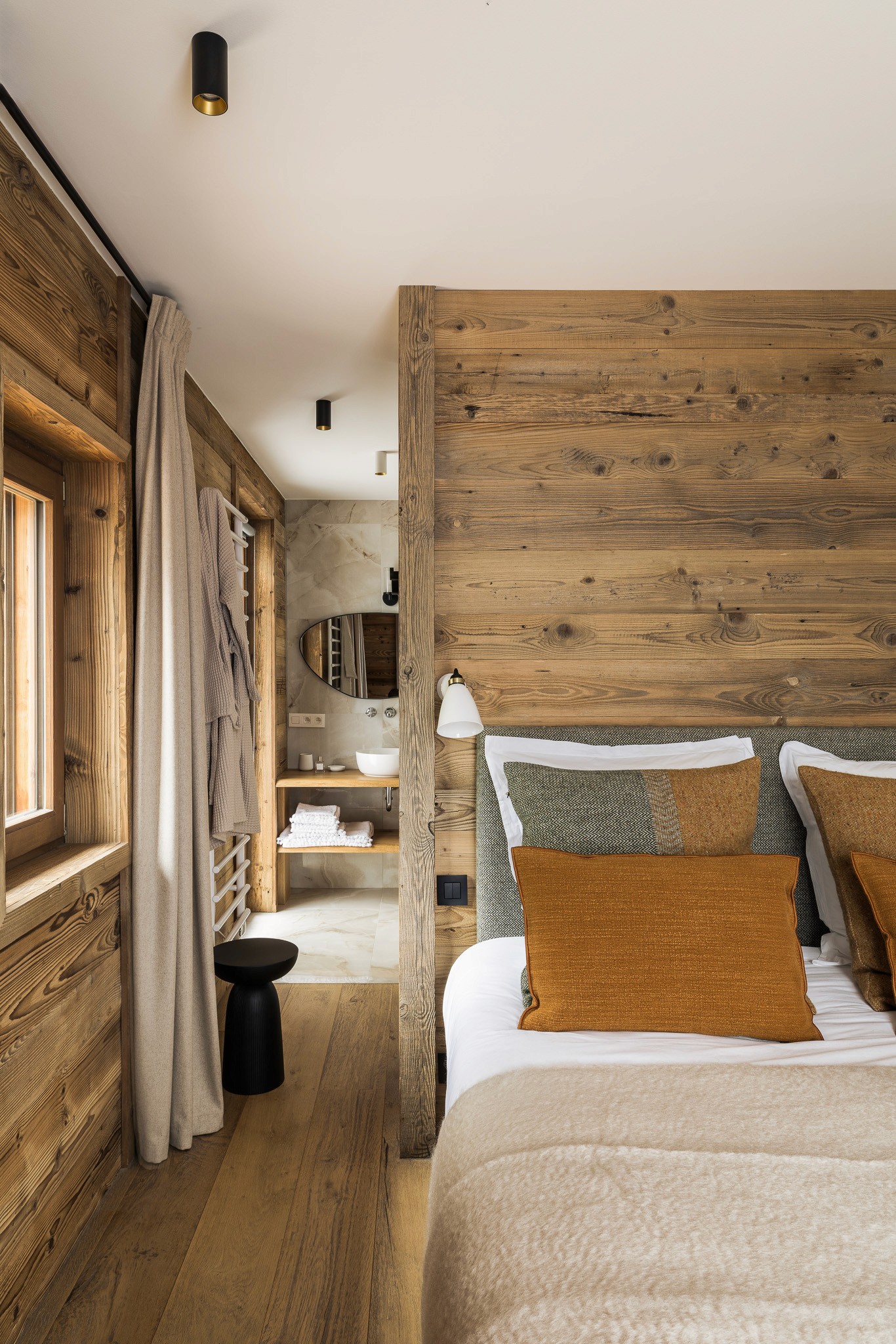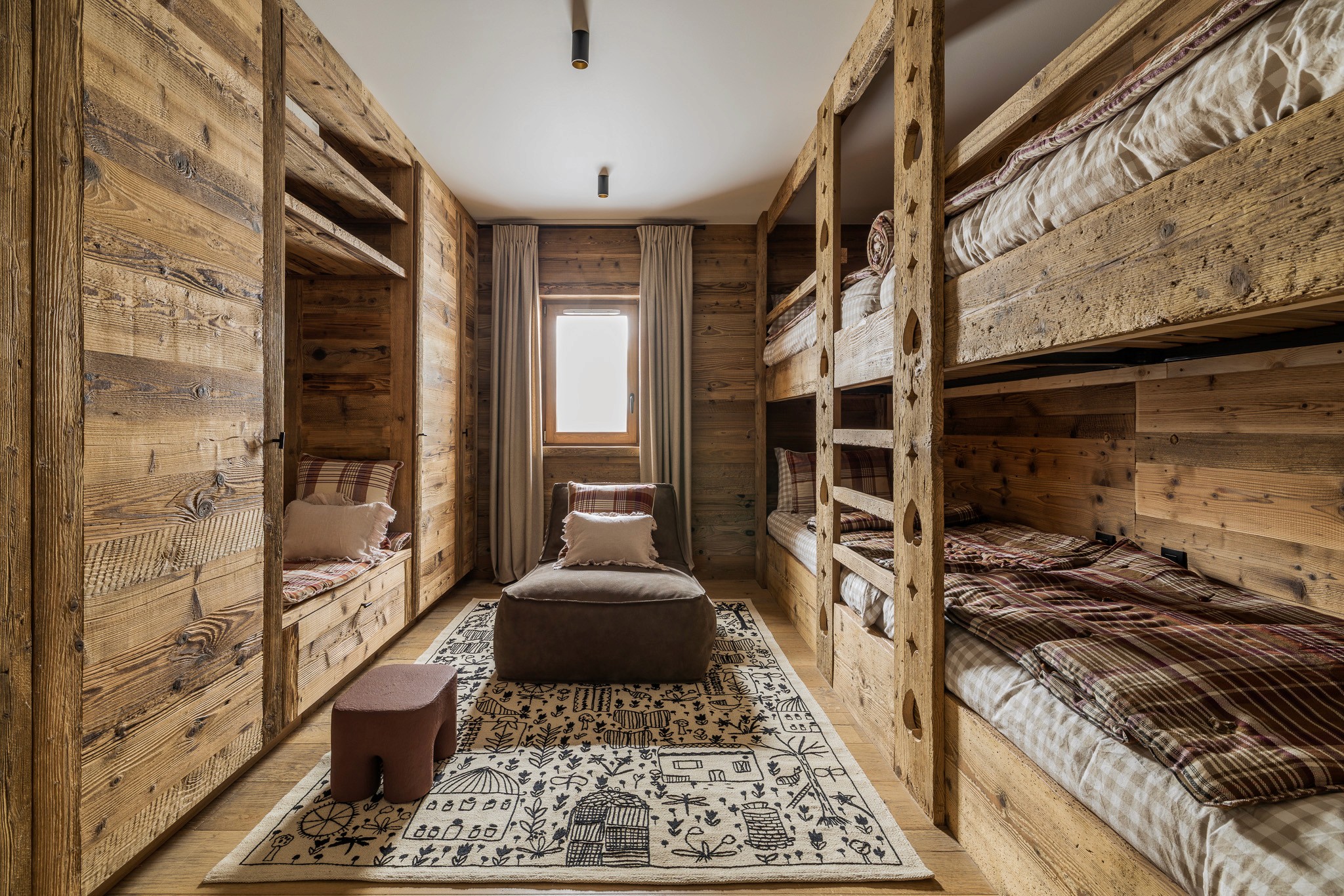 Nous avons conçu l’ensemble des aménagements sur mesure, des menuiseries intégrées jusqu’à la cuisine, véritable pièce maîtresse du lieu. Les teintes chaudes et les matières naturelles — bois, pierre et textiles doux — créent une atmosphère enveloppante, fidèle à l’esprit montagne et au confort d’un intérieur chaleureux.