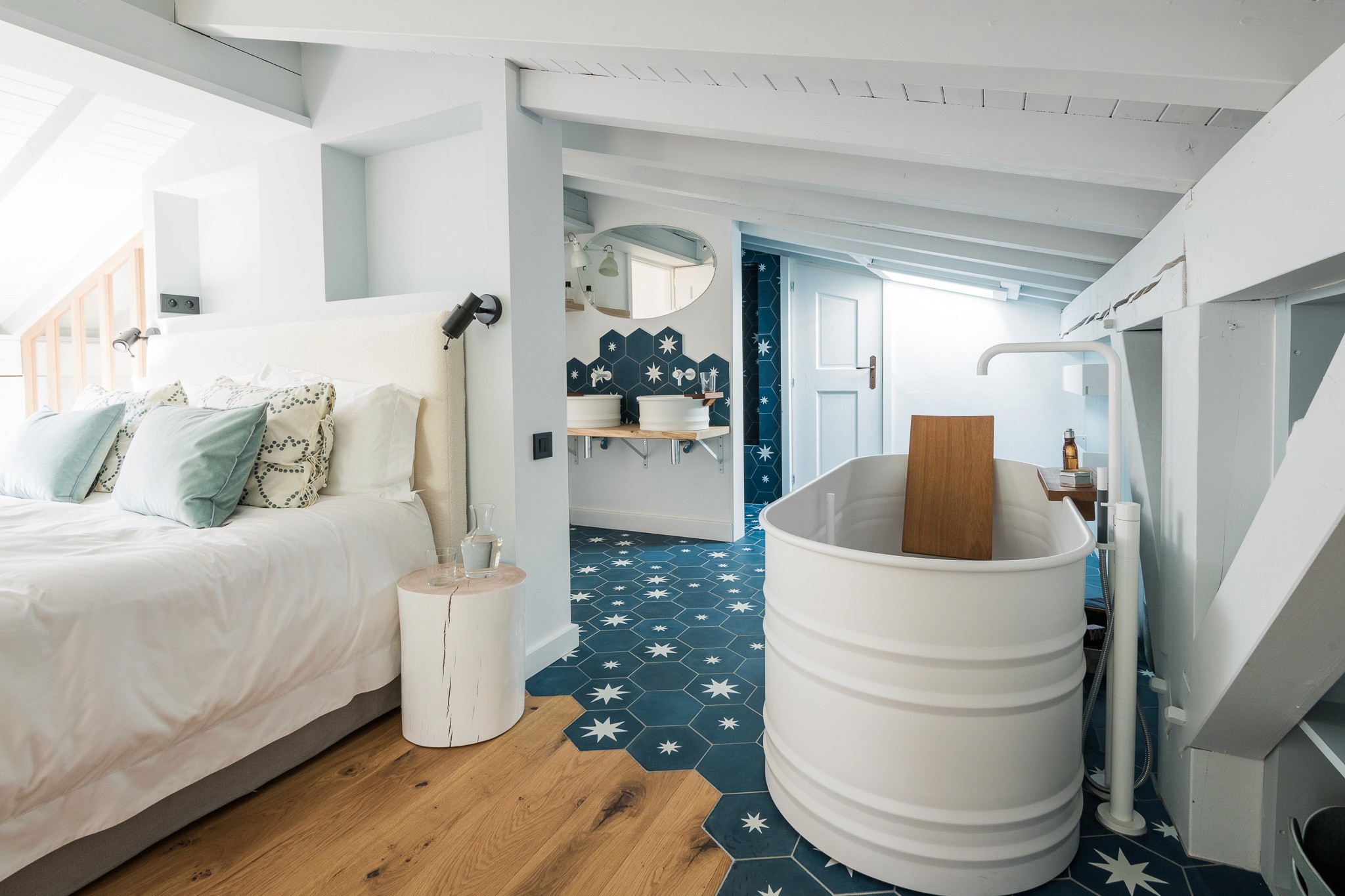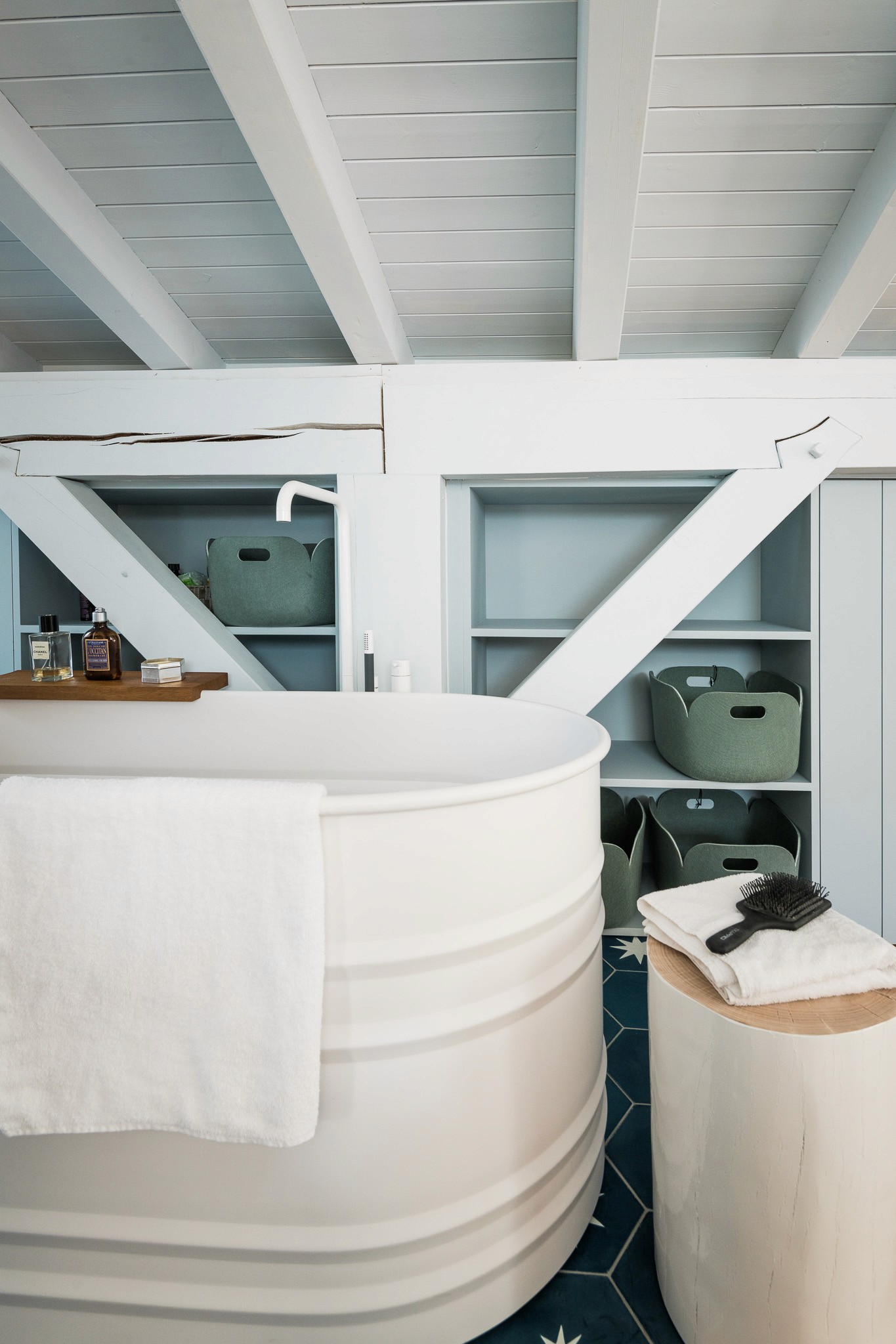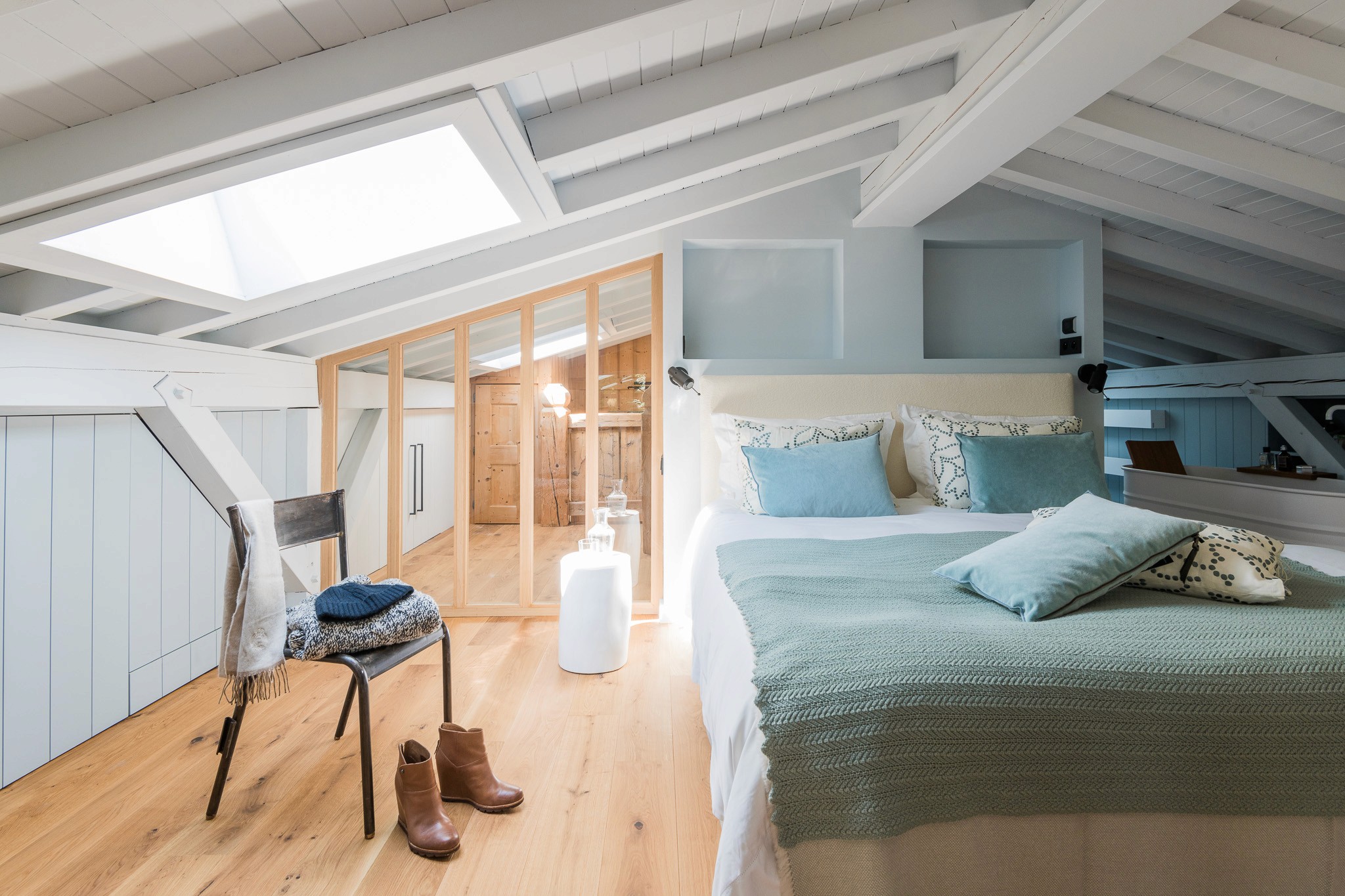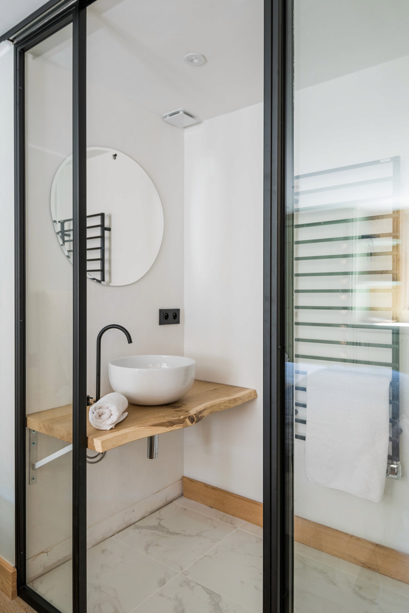 Chaque chambre bénéficie désormais de sa propre salle de bain. Le salon, organisé autour de la cheminée, prend des allures de cocon feutré grâce à des textures douces — laine, lin — et des teintes claires. Les poutres blanchies au plafond reflètent subtilement la lumière naturelle, dialoguant avec un mobilier contemporain, discret et léger.