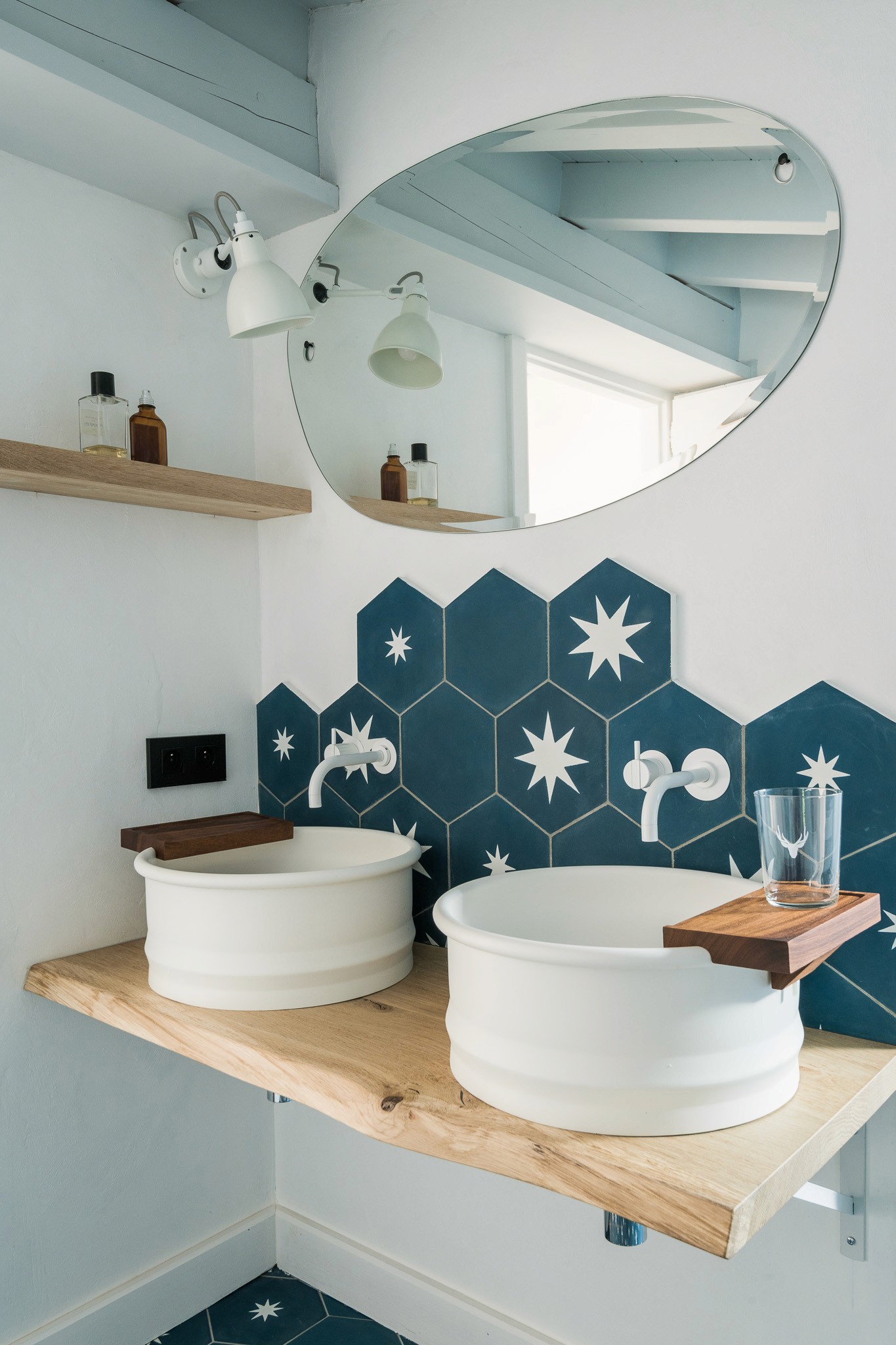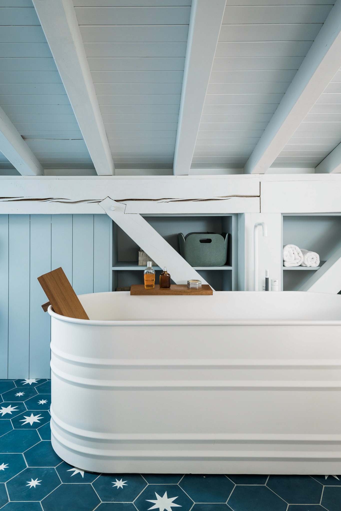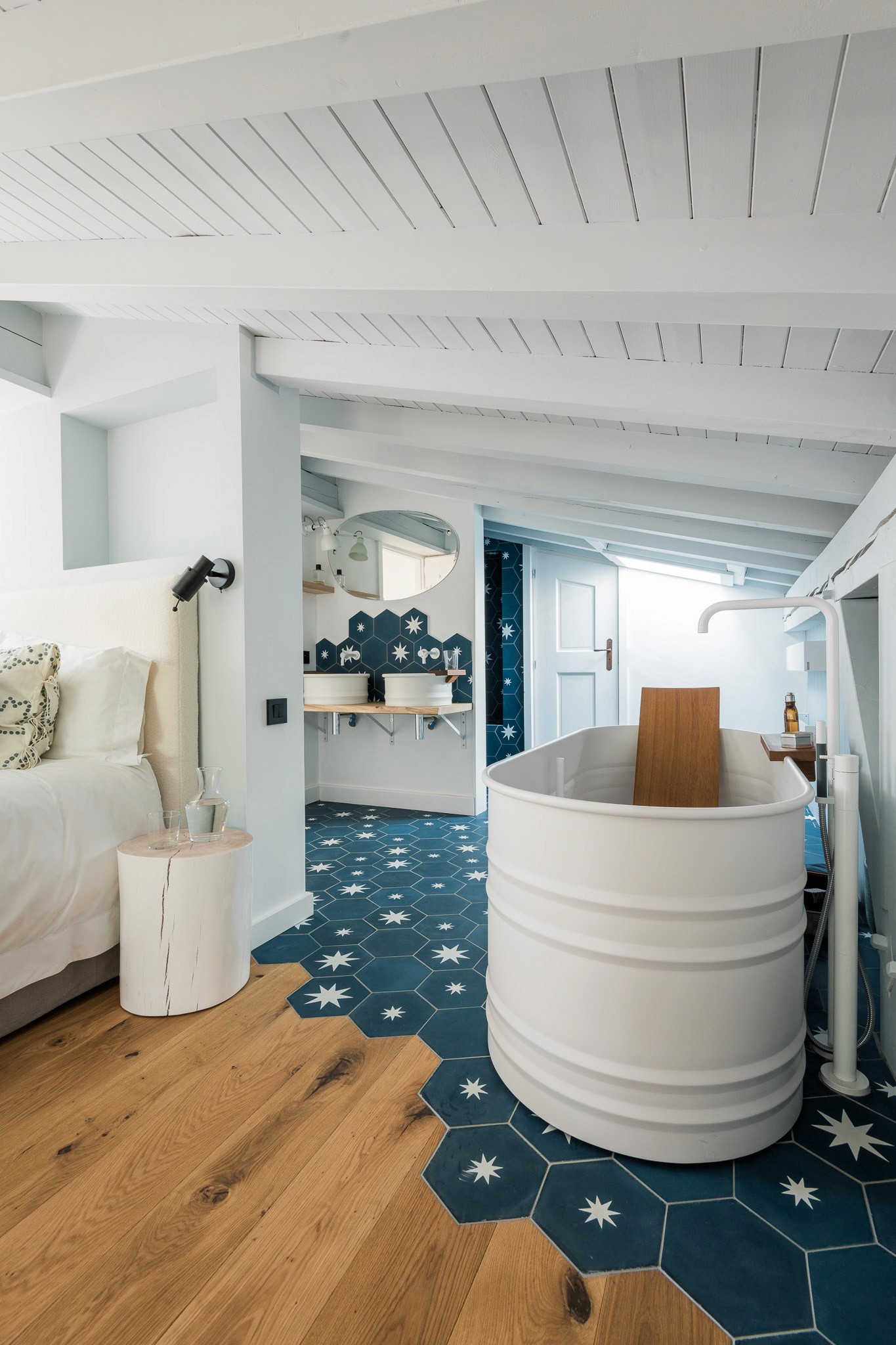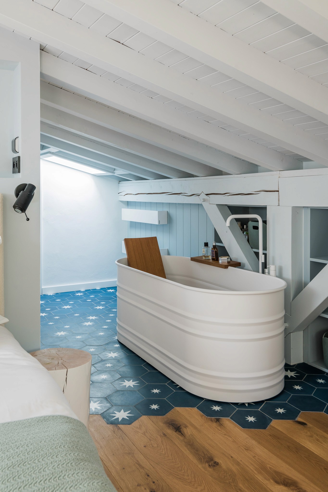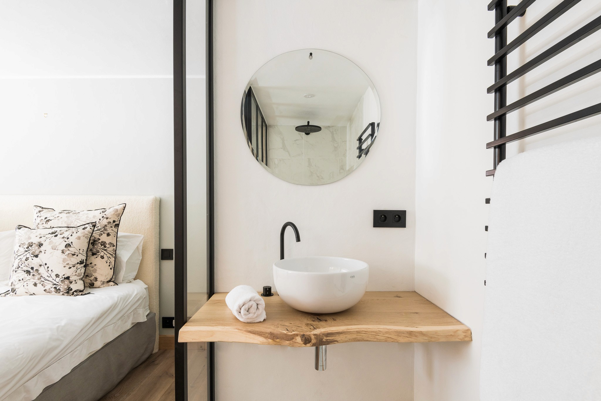 Chaque chambre bénéficie désormais de sa propre salle de bain. Le salon, organisé autour de la cheminée, prend des allures de cocon feutré grâce à des textures douces — laine, lin — et des teintes claires. Les poutres blanchies au plafond reflètent subtilement la lumière naturelle, dialoguant avec un mobilier contemporain, discret et léger.