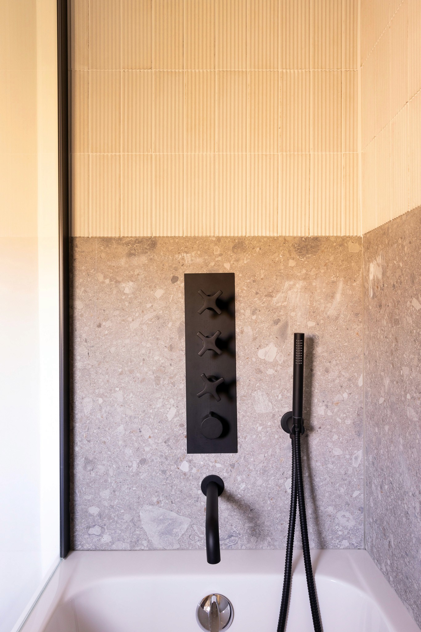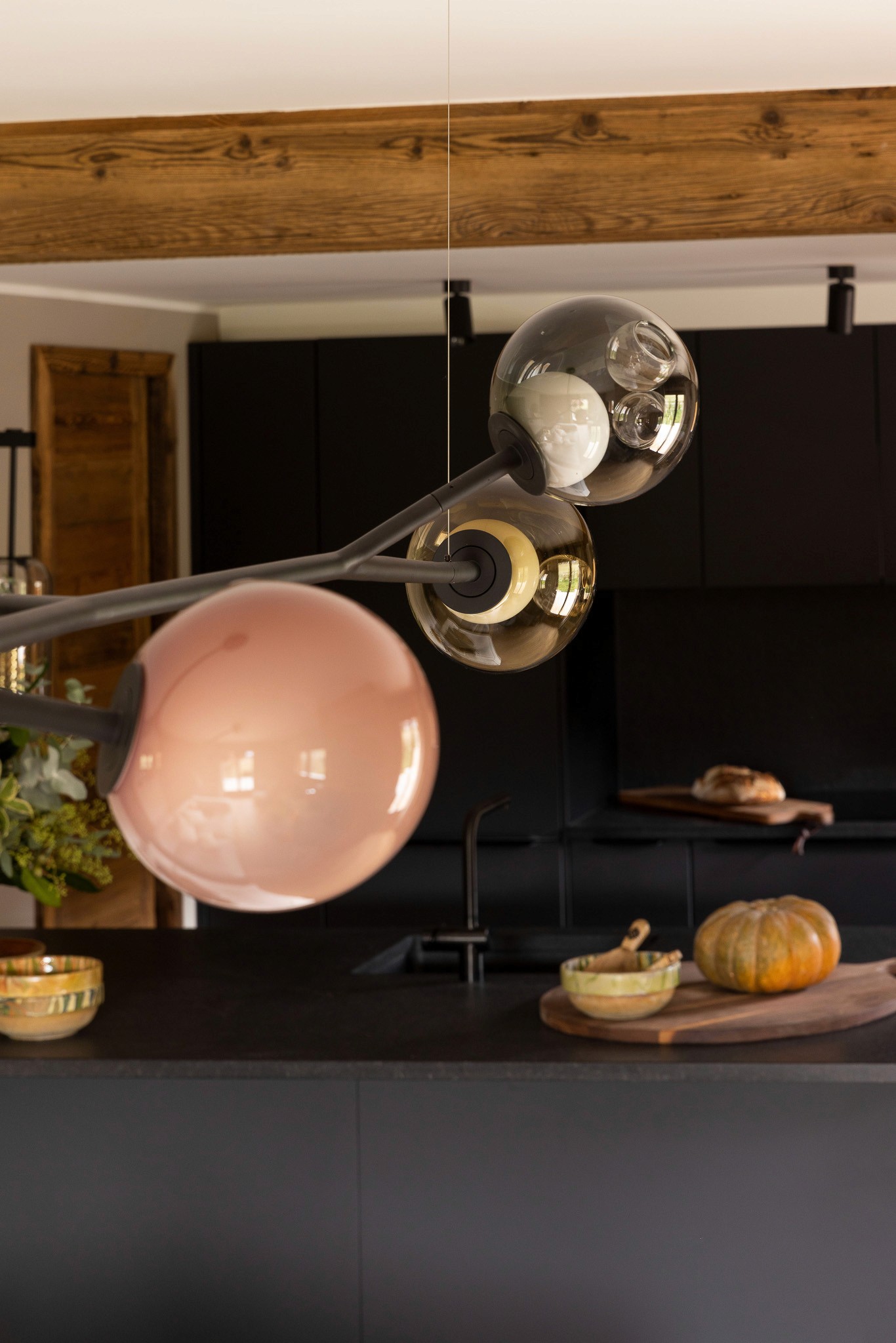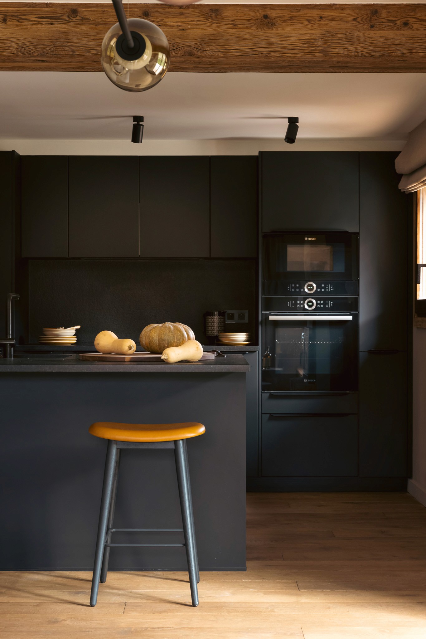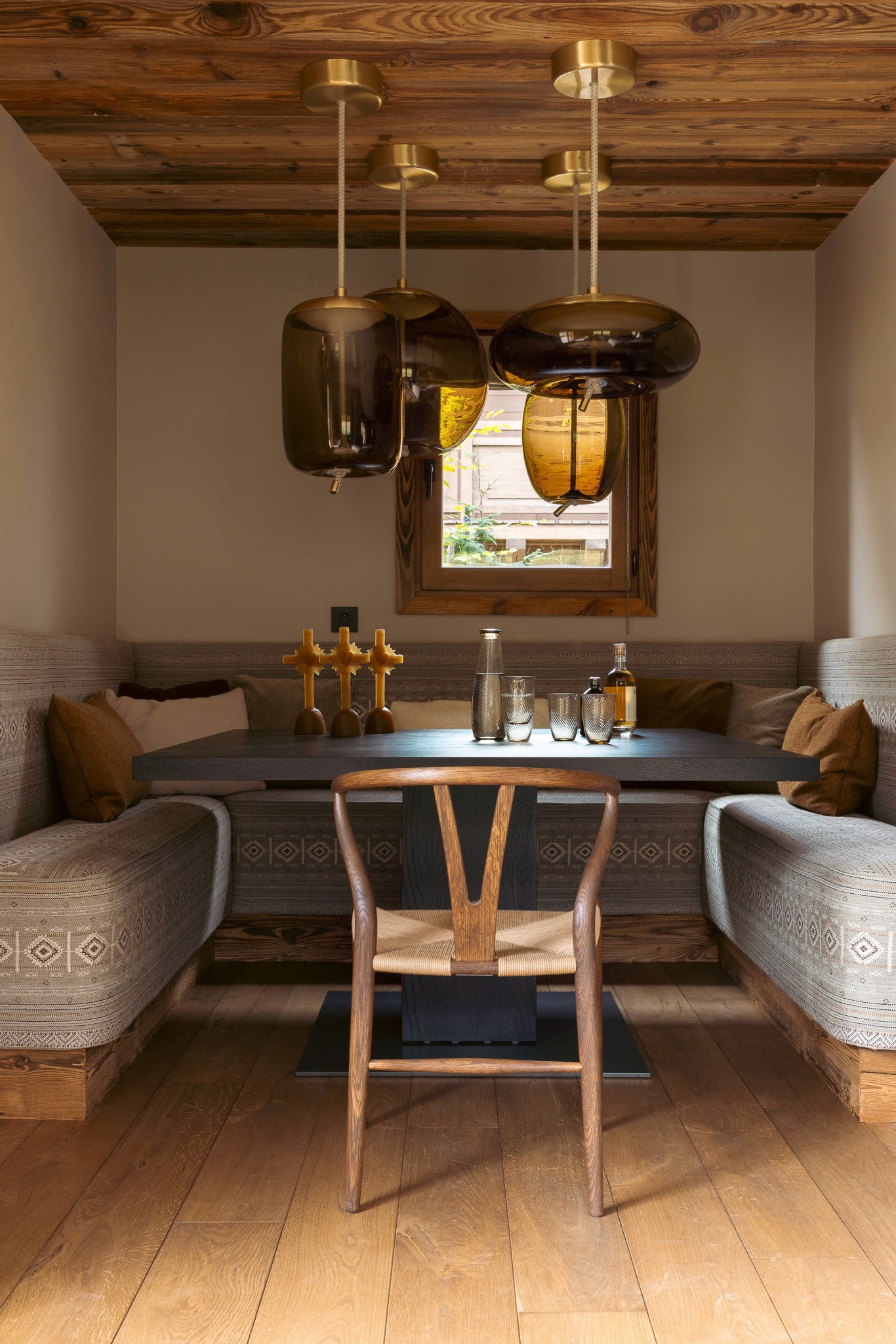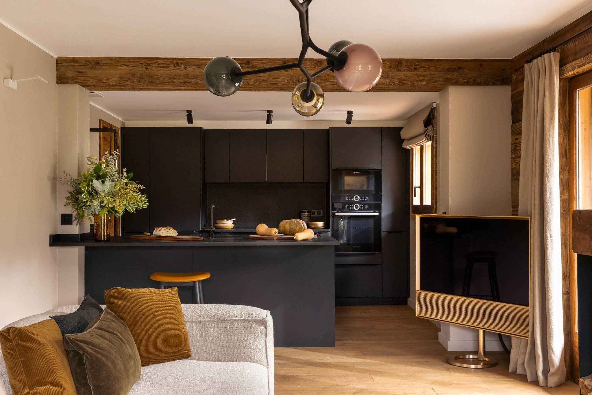 Les matériaux ont été soigneusement sélectionnés pour préserver l’esprit montagnard tout en insufflant une modernité subtile. La cuisine, résolument graphique en total look noir, crée un contraste audacieux avec l’ambiance chaleureuse du bois et des matières naturelles. Dans le coin repas, une banquette sur mesure habillée d’un tissu Elitis apporte à la fois confort, élégance classique et personnalité.