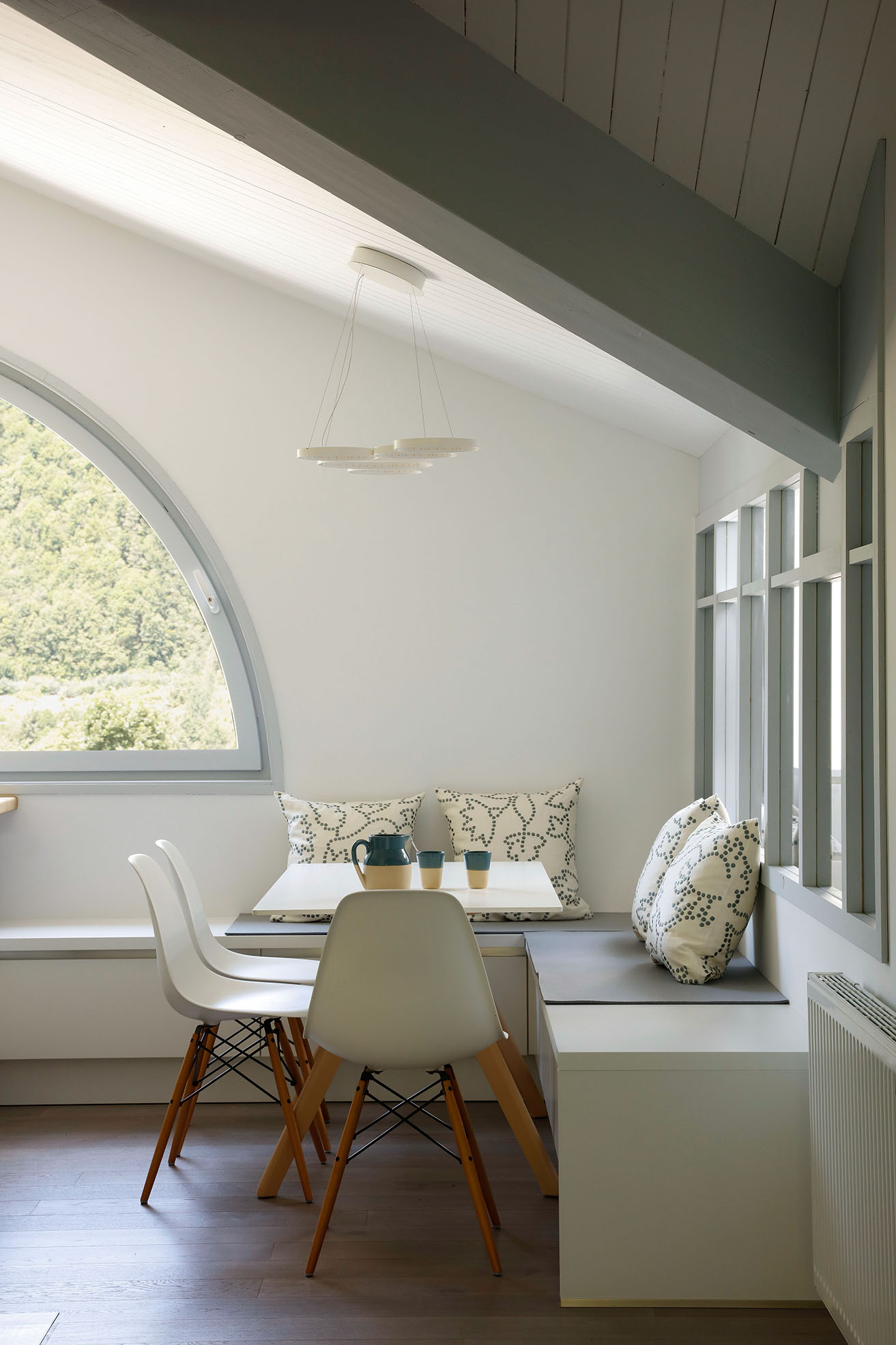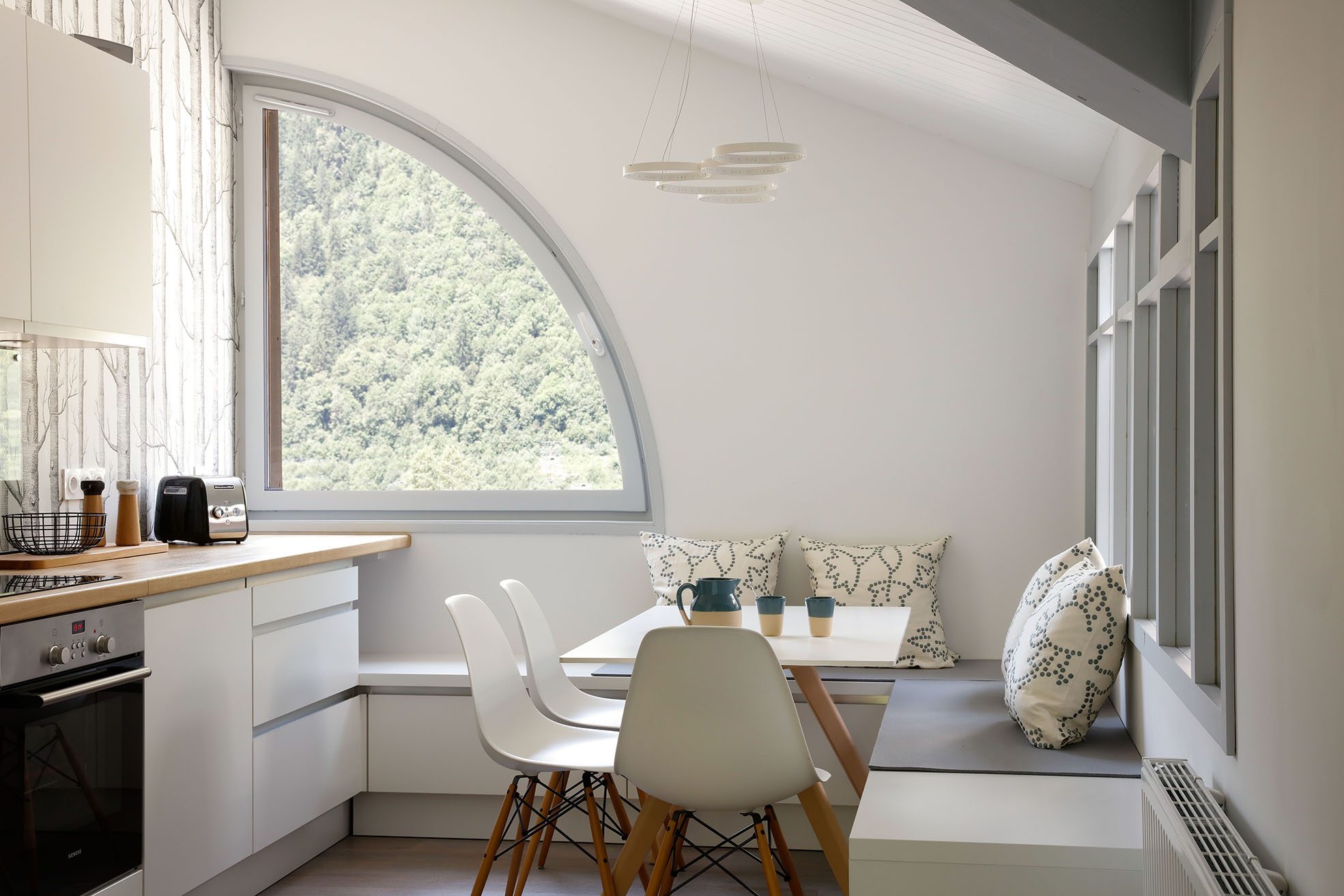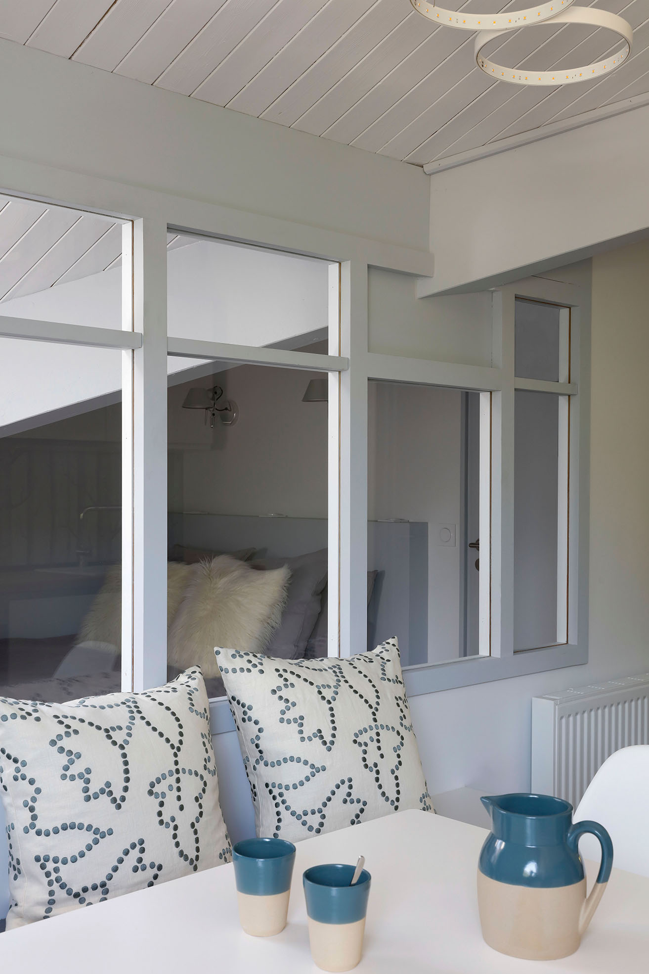 La cuisine blanche et bois s’ouvre sur le salon avec une banquette sur mesure. Une verrière éclaire la chambre parentale, tandis qu’un espace enfants modulable complète l’ensemble. Les poutres et plafonds ont été repeints pour alléger l’atmosphère, tout en conservant le charme du lieu.
