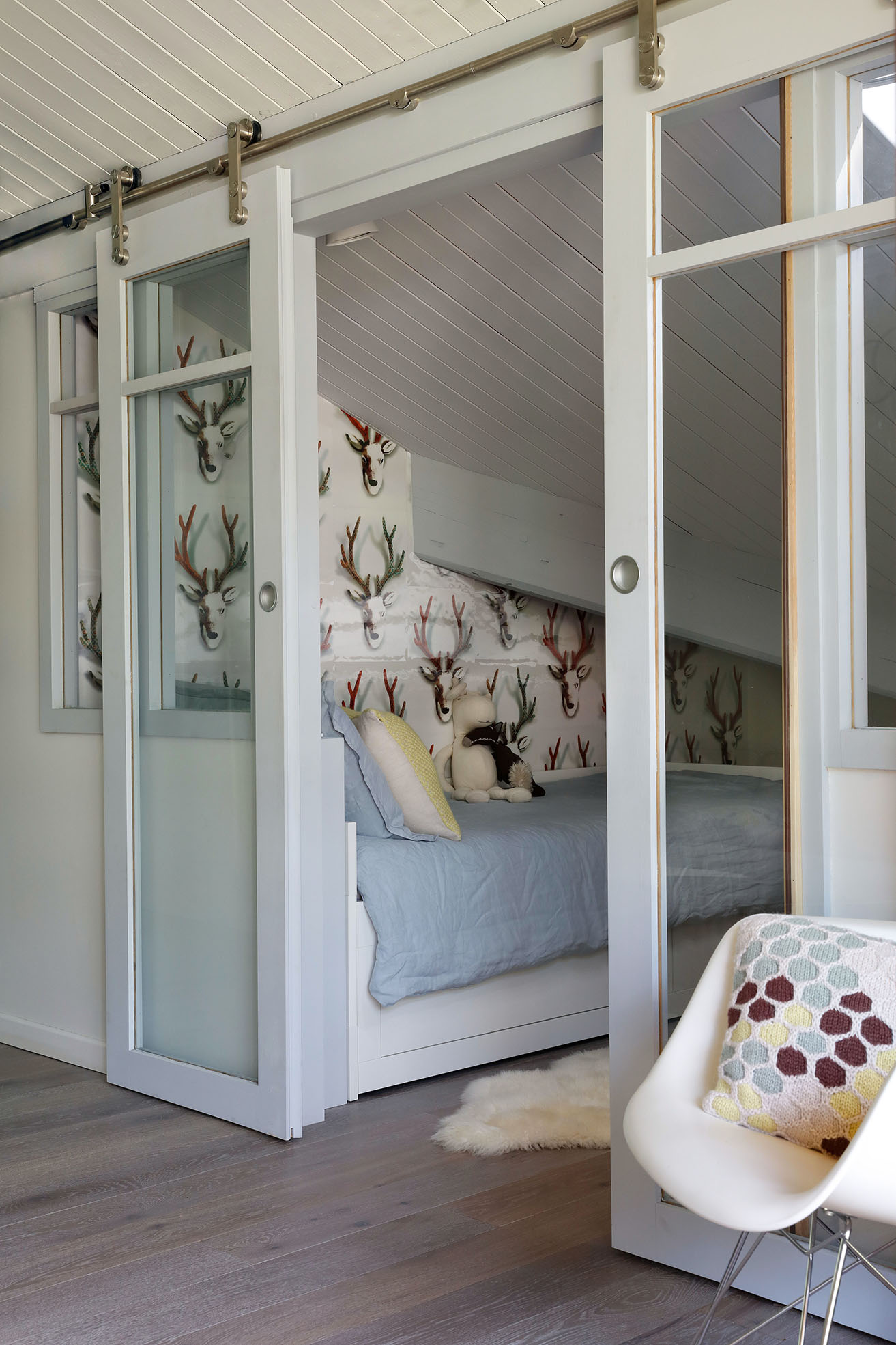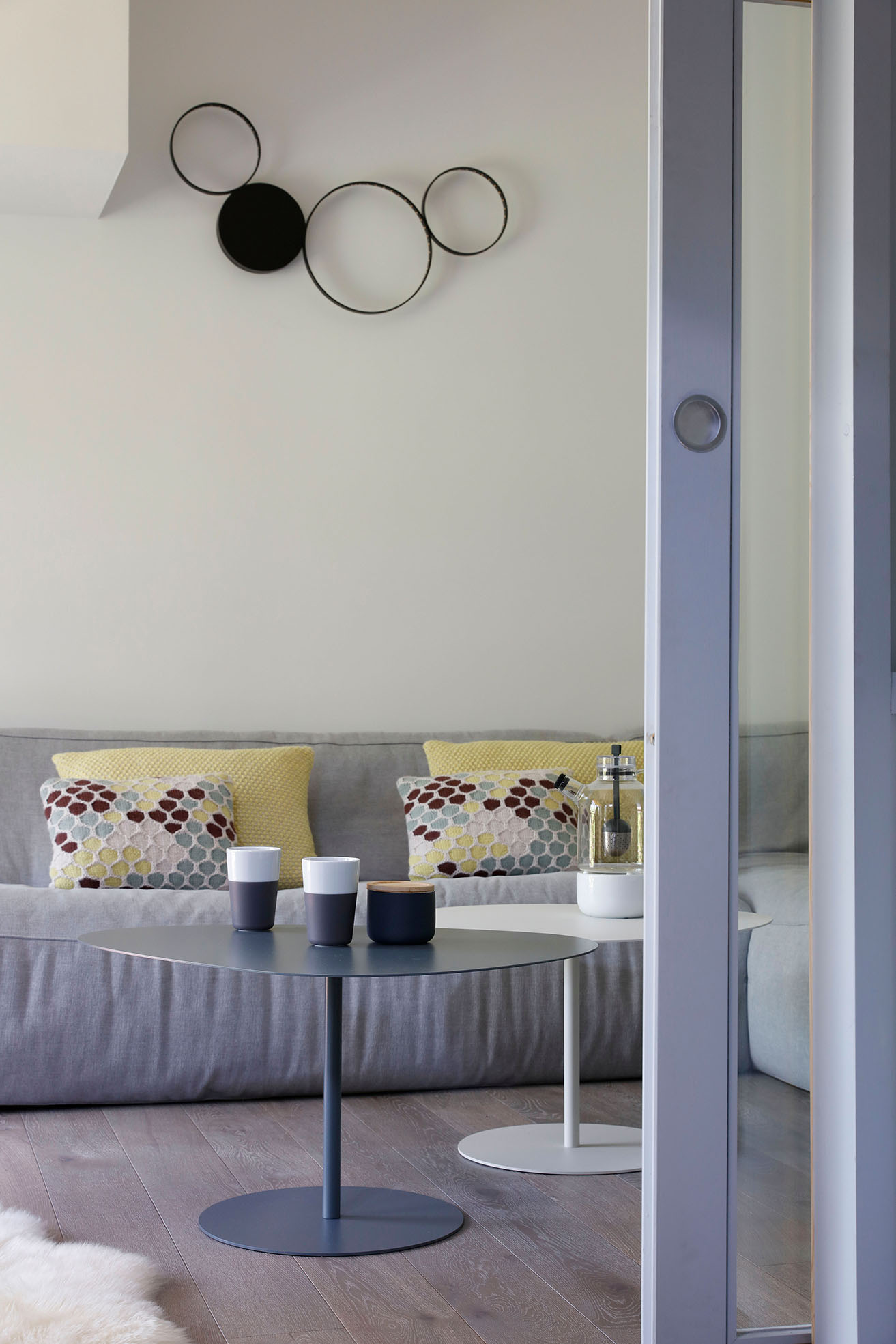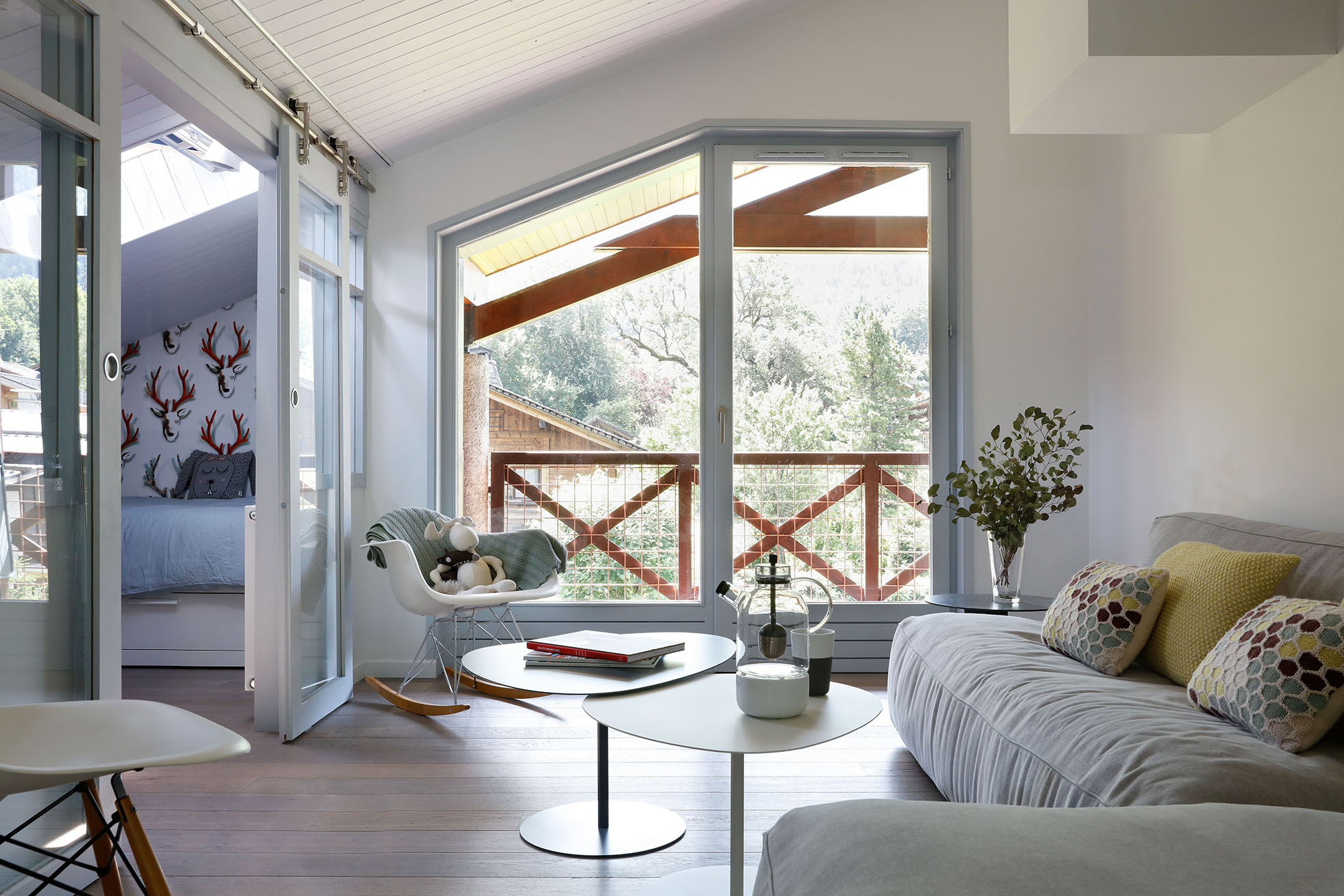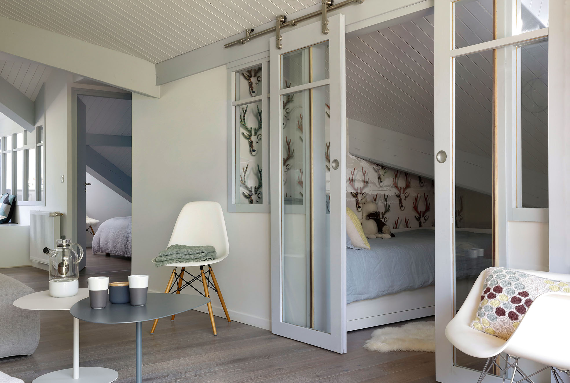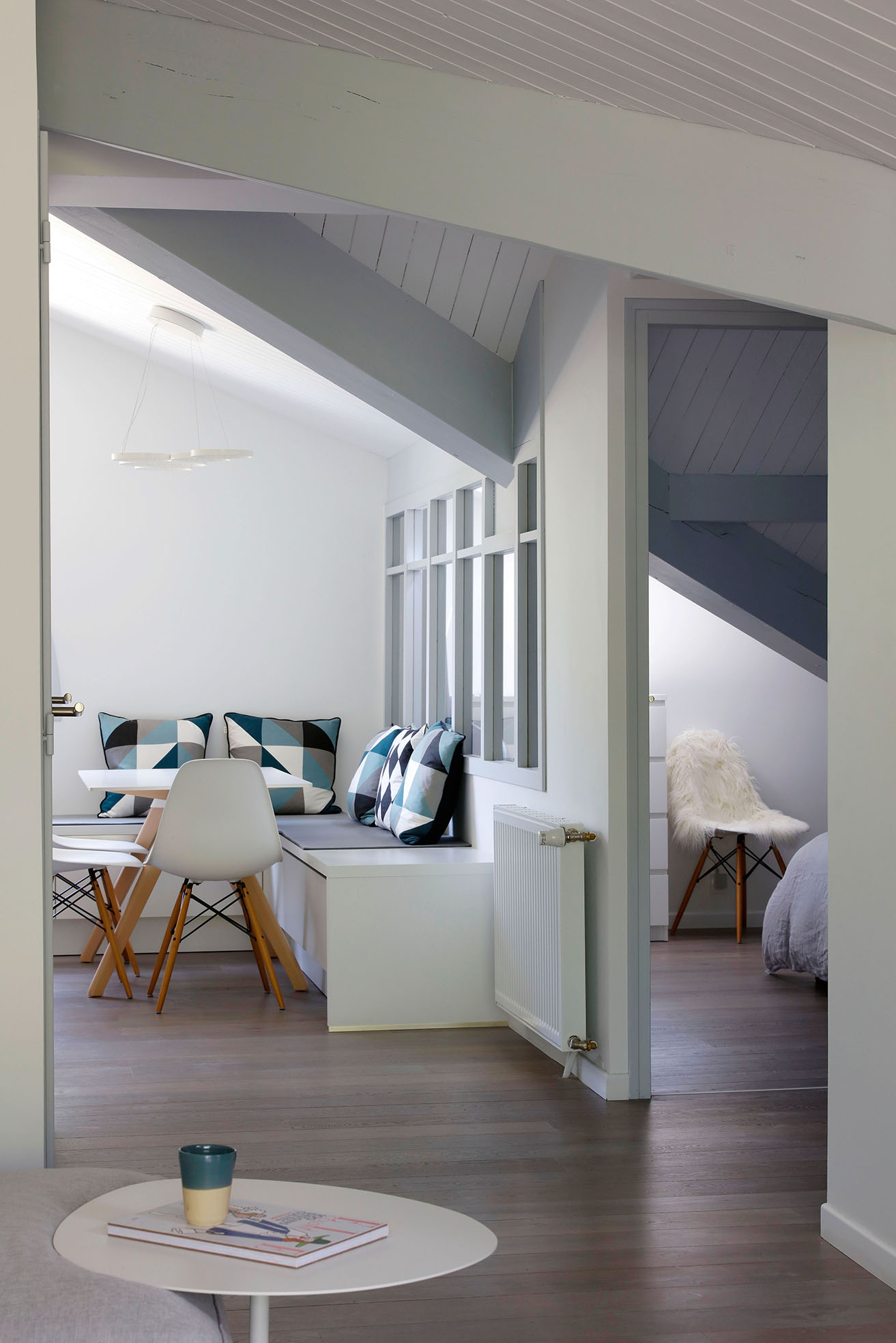 Dans cet appartement de moins de 50 m² niché sous les toits, l’enjeu était d’intégrer deux espaces nuit et une vraie pièce de vie dans un esprit scandinave.