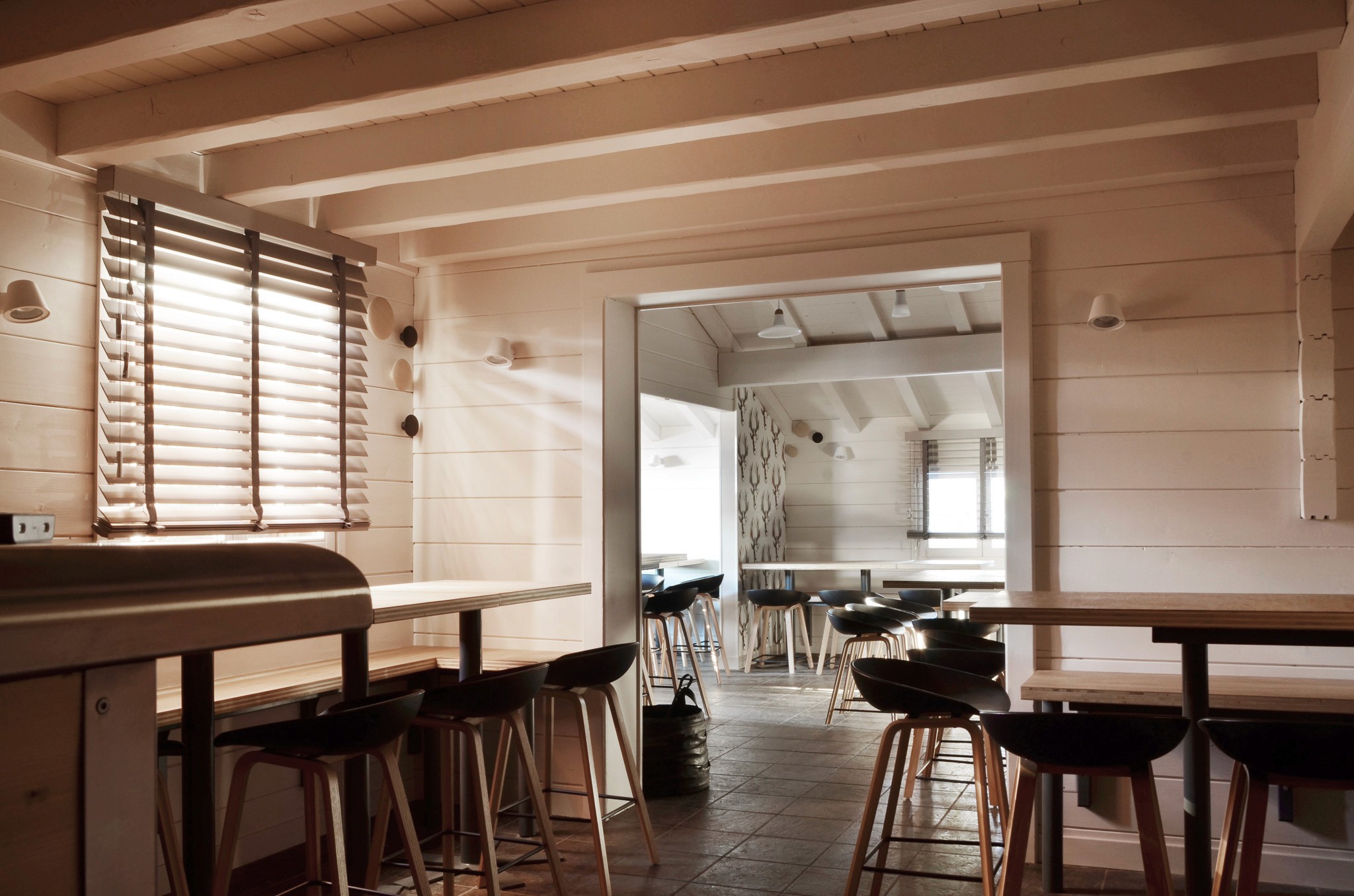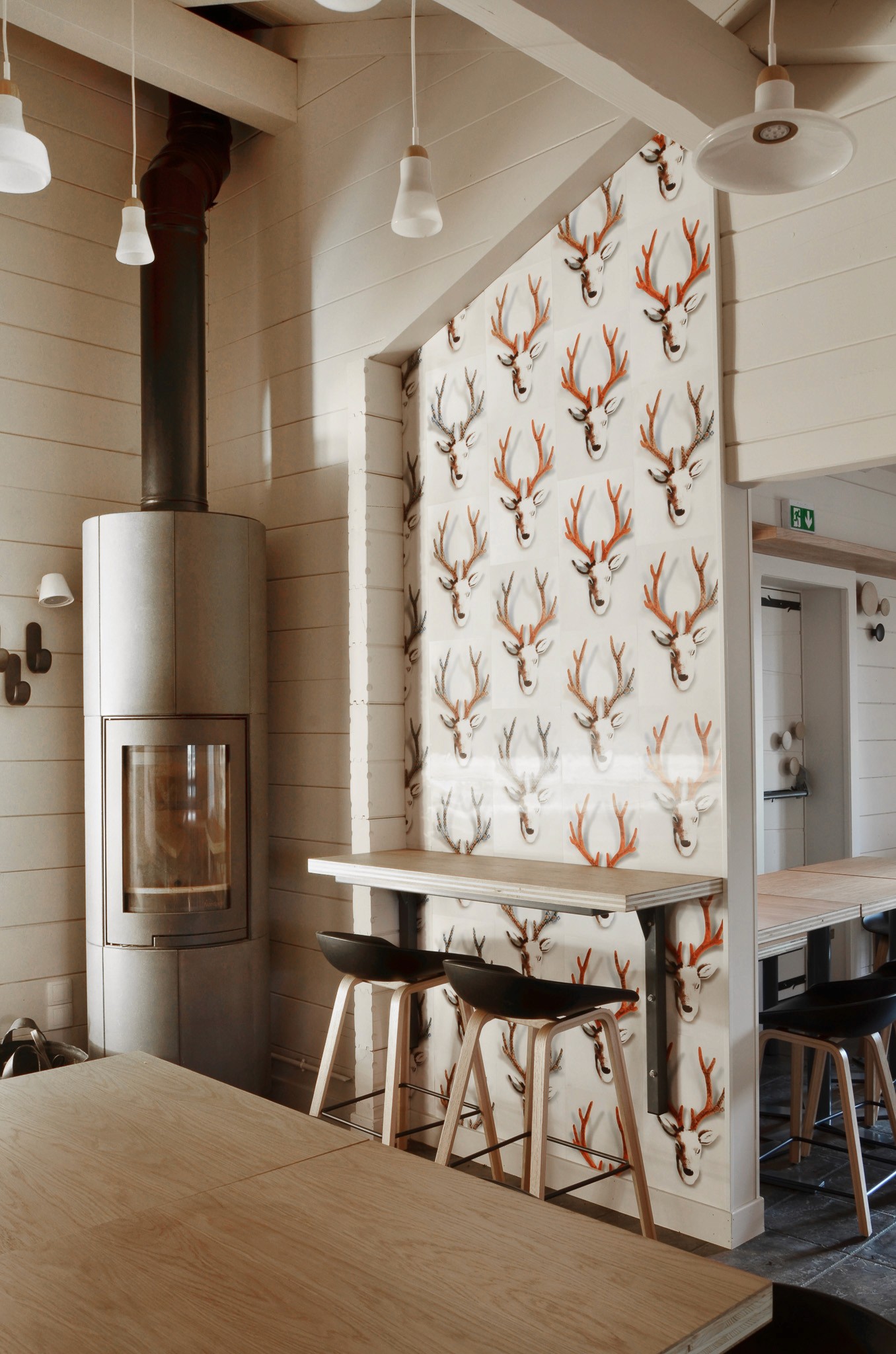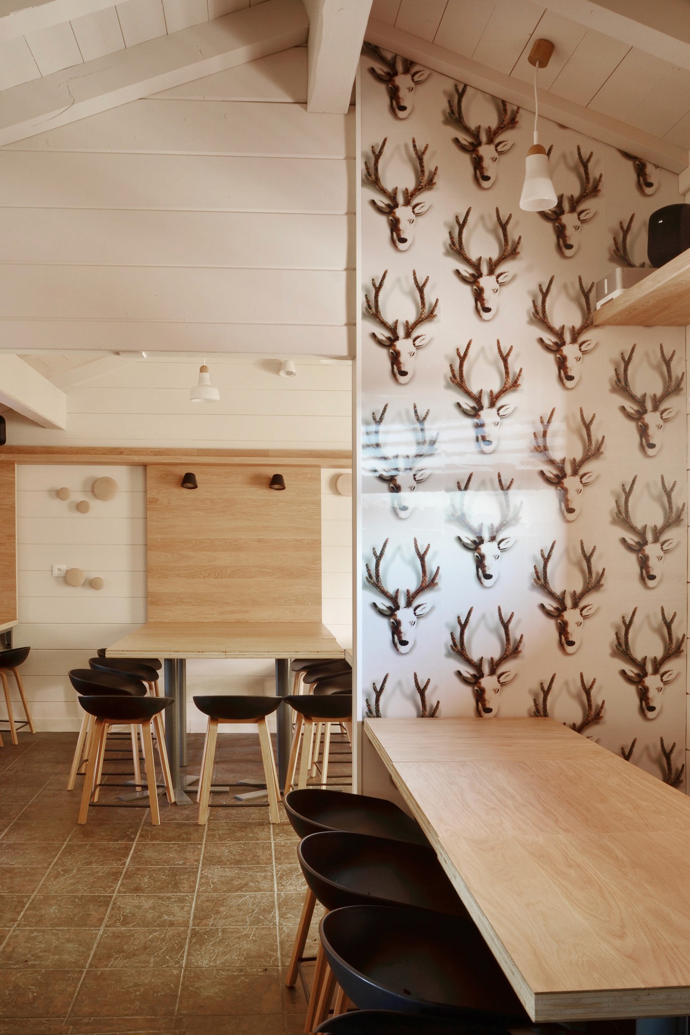 Nous avons alterné tables hautes et basses pour rythmer les ambiances, et apporté une touche ludique avec un mur tapissé de cerfs imprimés en 3D.