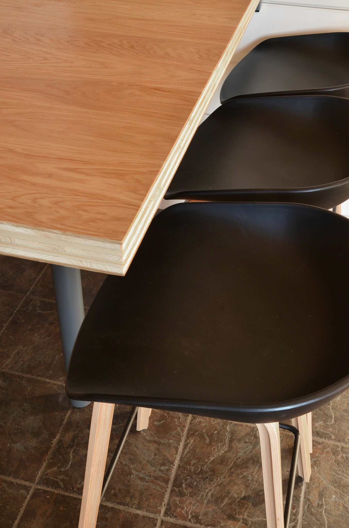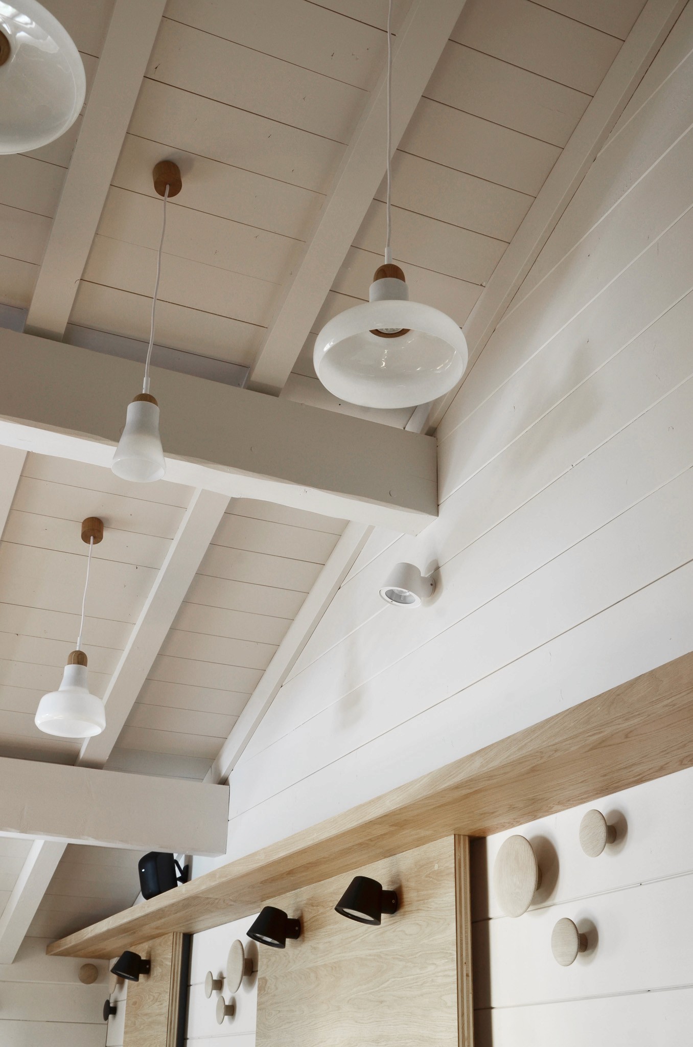 Le défi : maintenir le nombre de places tout en ajoutant du rangement pour accueillir casques et vêtements. Des étagères en chêne courant en hauteur et des patères au-dessus des banquettes apportent des solutions pratiques et intégrées.