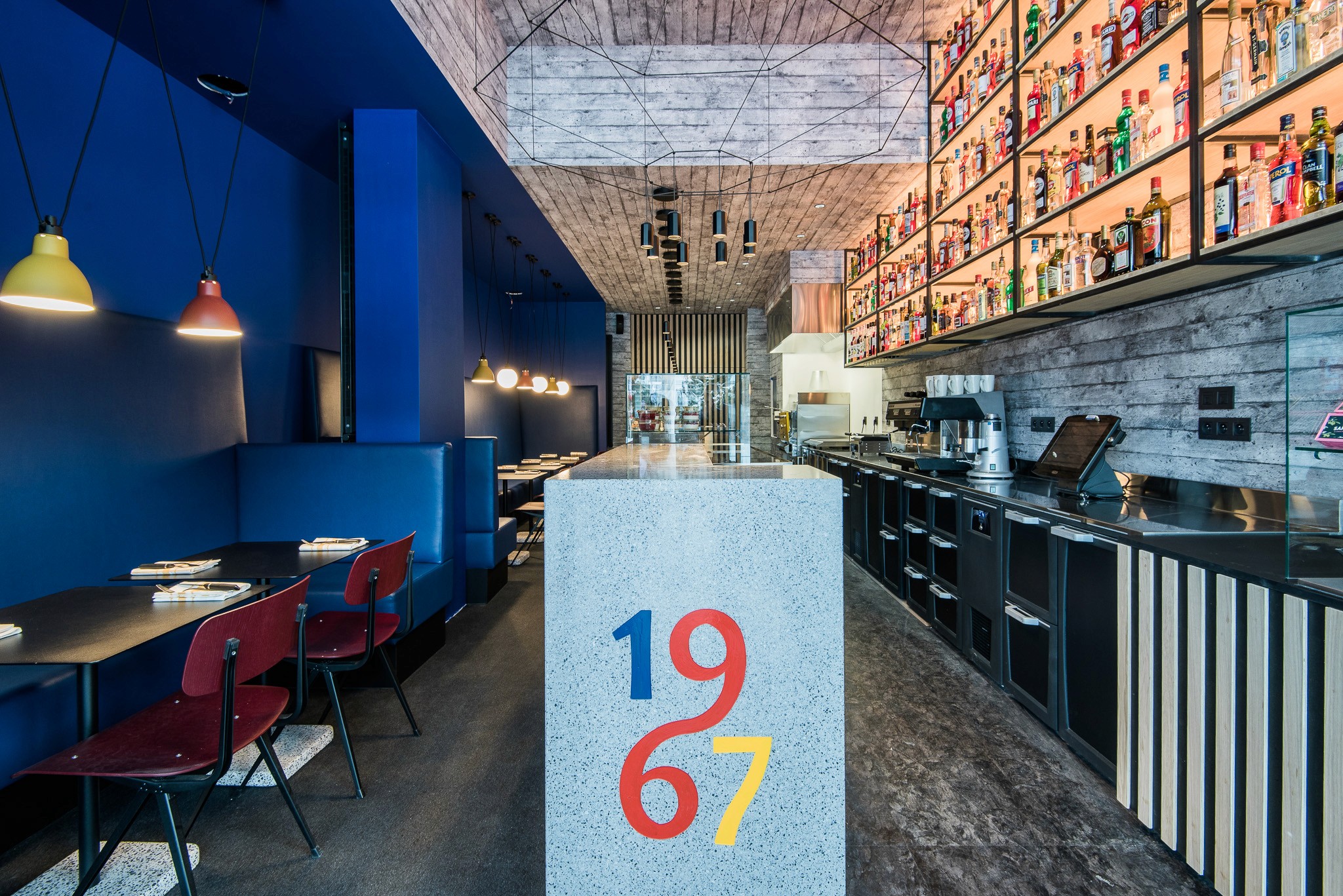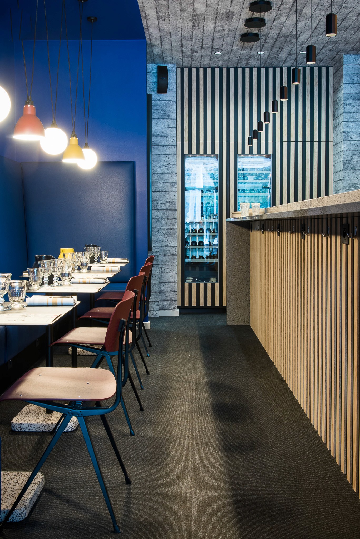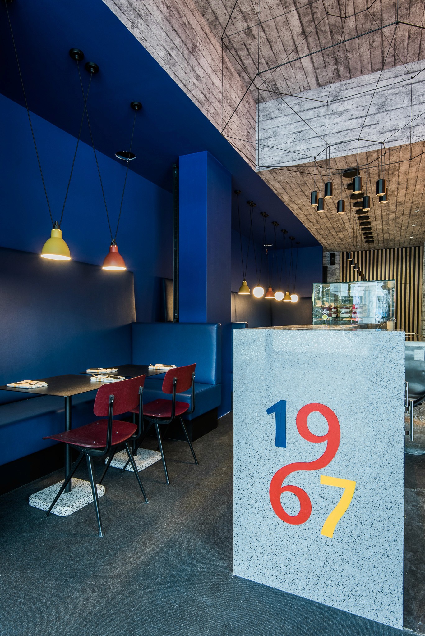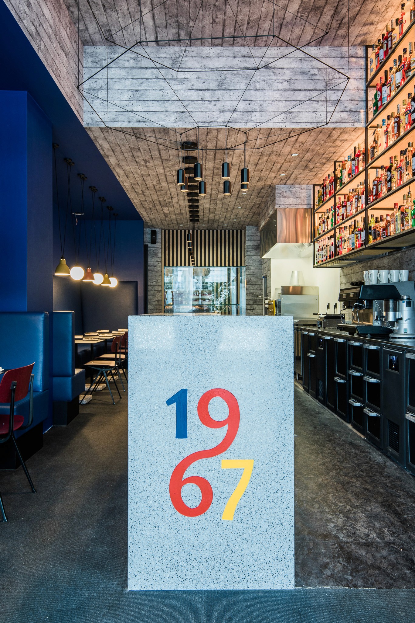 Nous avons repensé l’ensemble de l’espace dans une logique respectueuse de l’architecture moderniste de la station, sans pouvoir en modifier les volumes : le lieu a donc été transformé en un "tube", allongé et immersif. Les codes couleurs d’inspiration Vassarely guident le projet, tandis qu’un papier peint sur mesure, aux impressions de béton blanc, recouvre murs et plafond pour rappeler les façades emblématiques de la station.