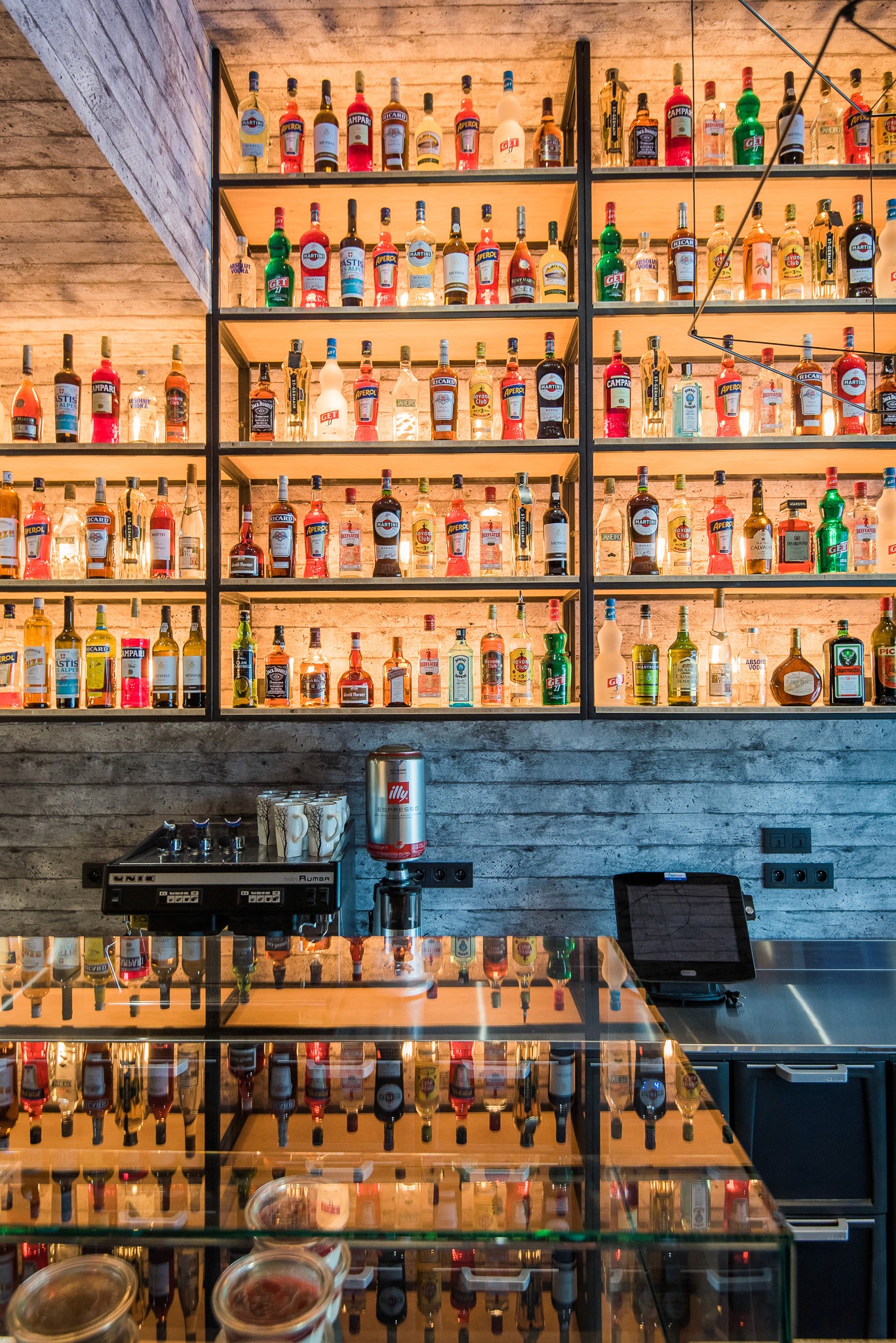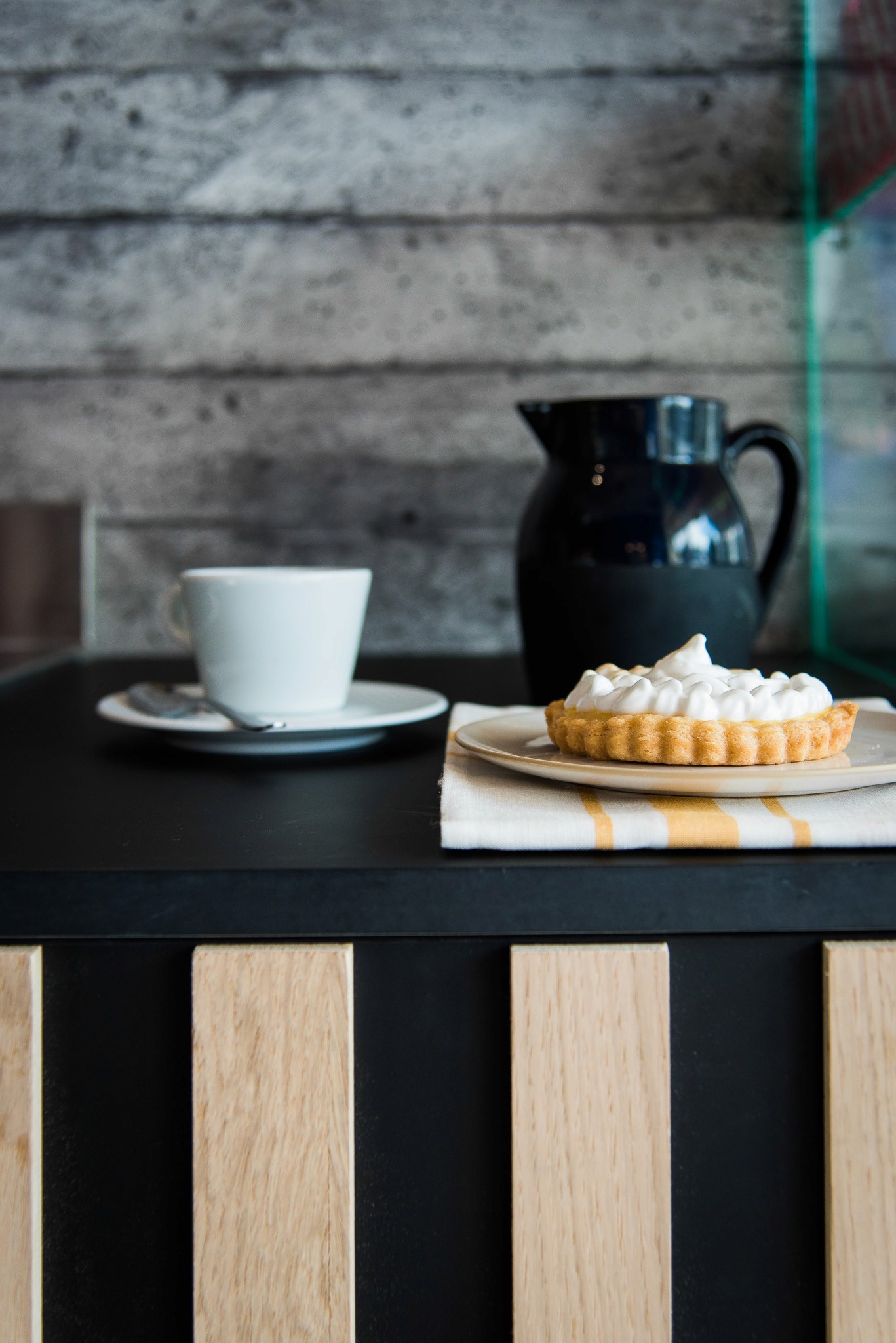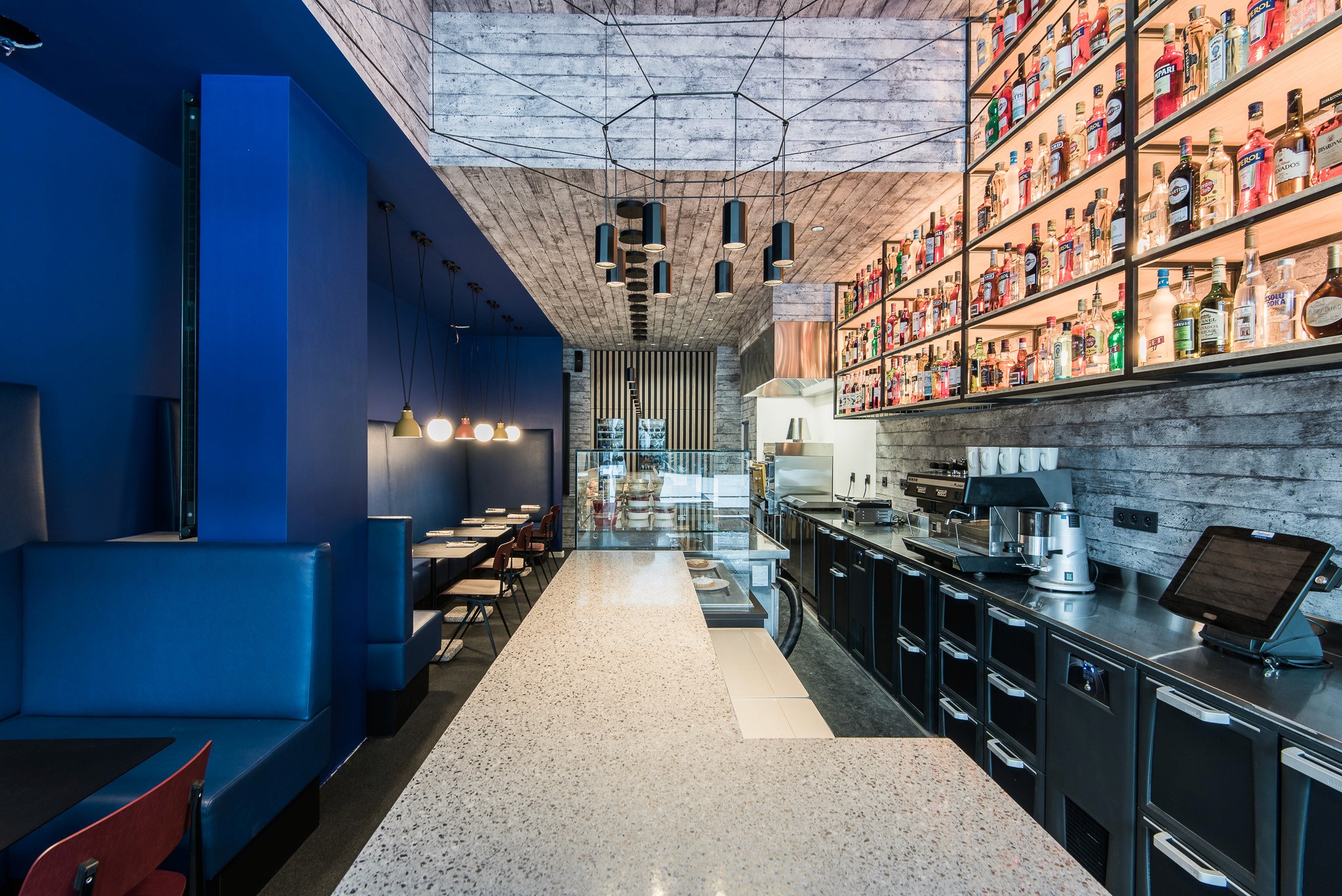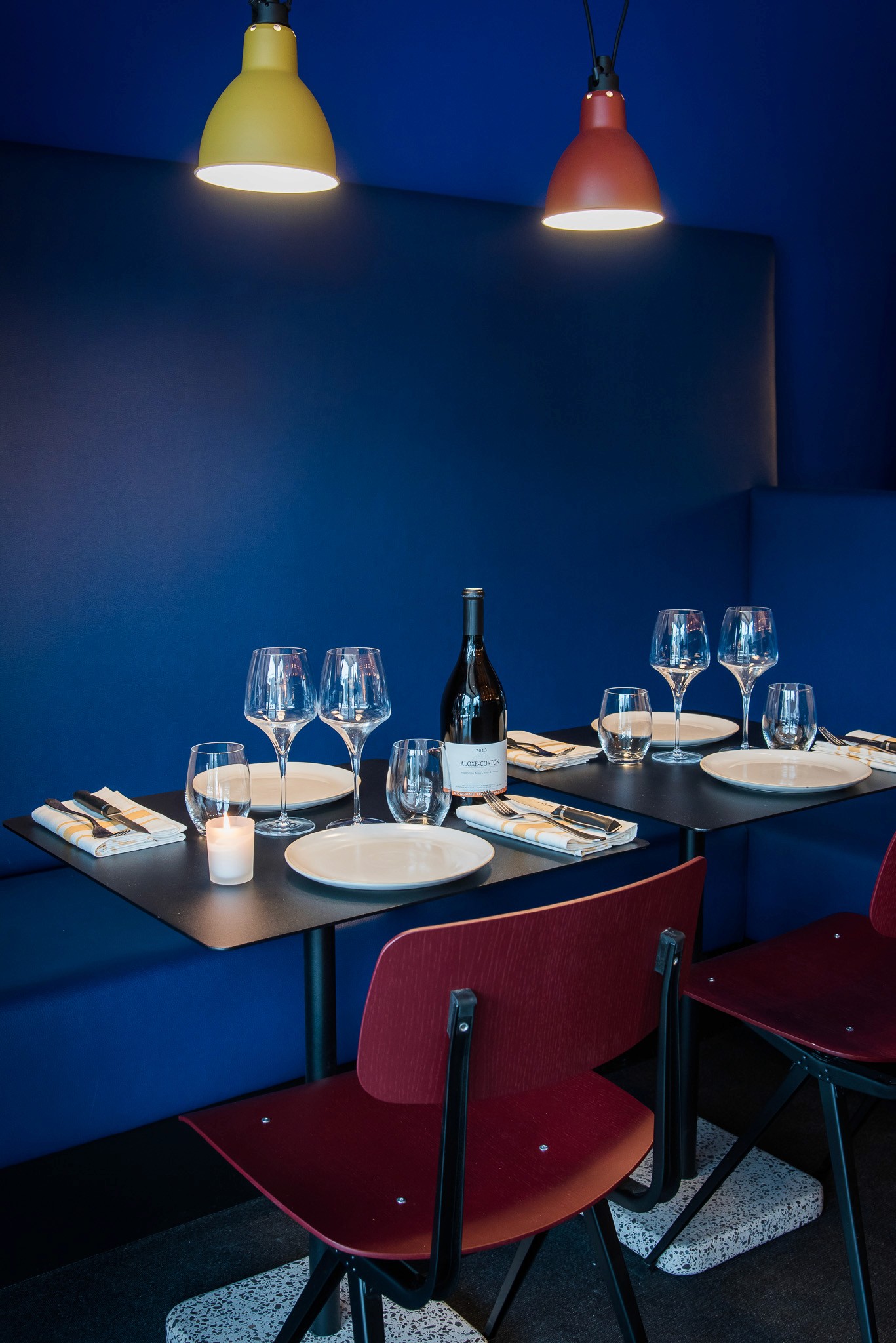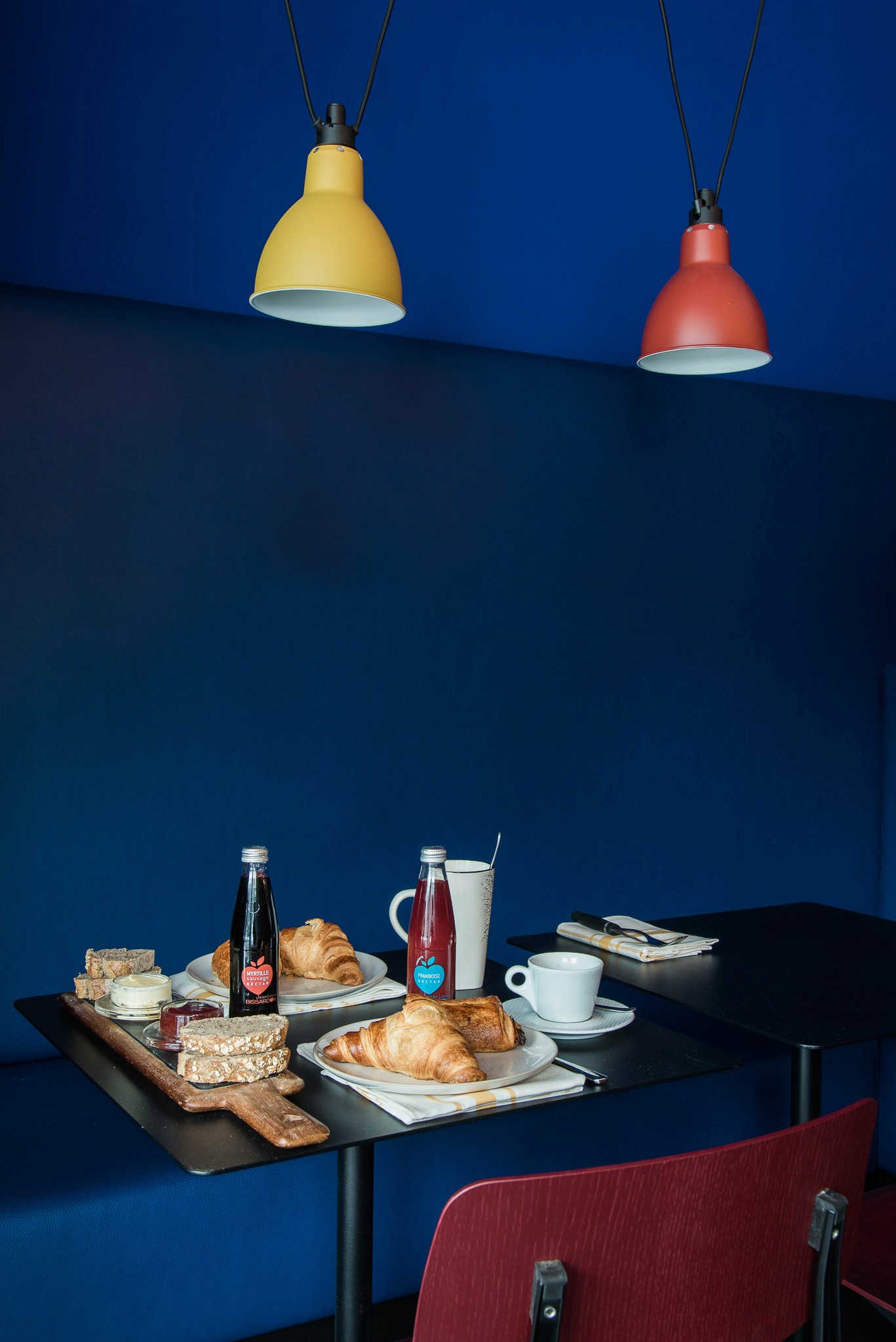 Nous avons repensé l’ensemble de l’espace dans une logique respectueuse de l’architecture moderniste de la station, sans pouvoir en modifier les volumes : le lieu a donc été transformé en un "tube", allongé et immersif. Les codes couleurs d’inspiration Vassarely guident le projet, tandis qu’un papier peint sur mesure, aux impressions de béton blanc, recouvre murs et plafond pour rappeler les façades emblématiques de la station.